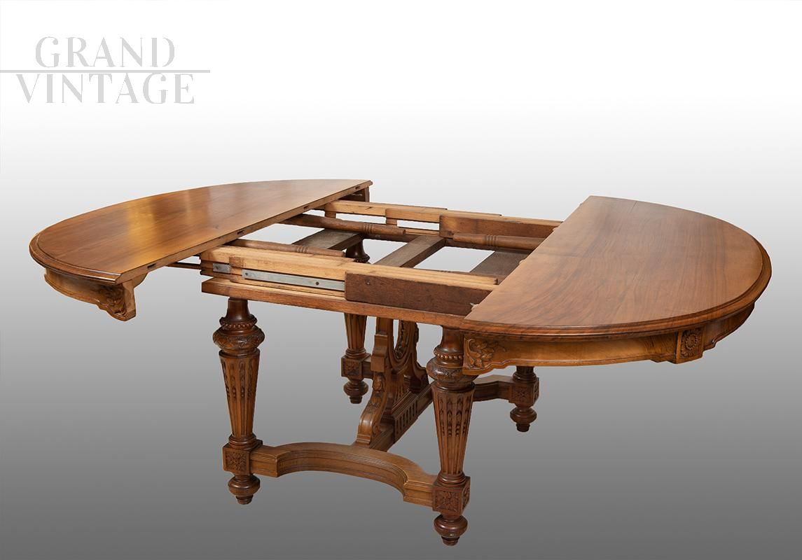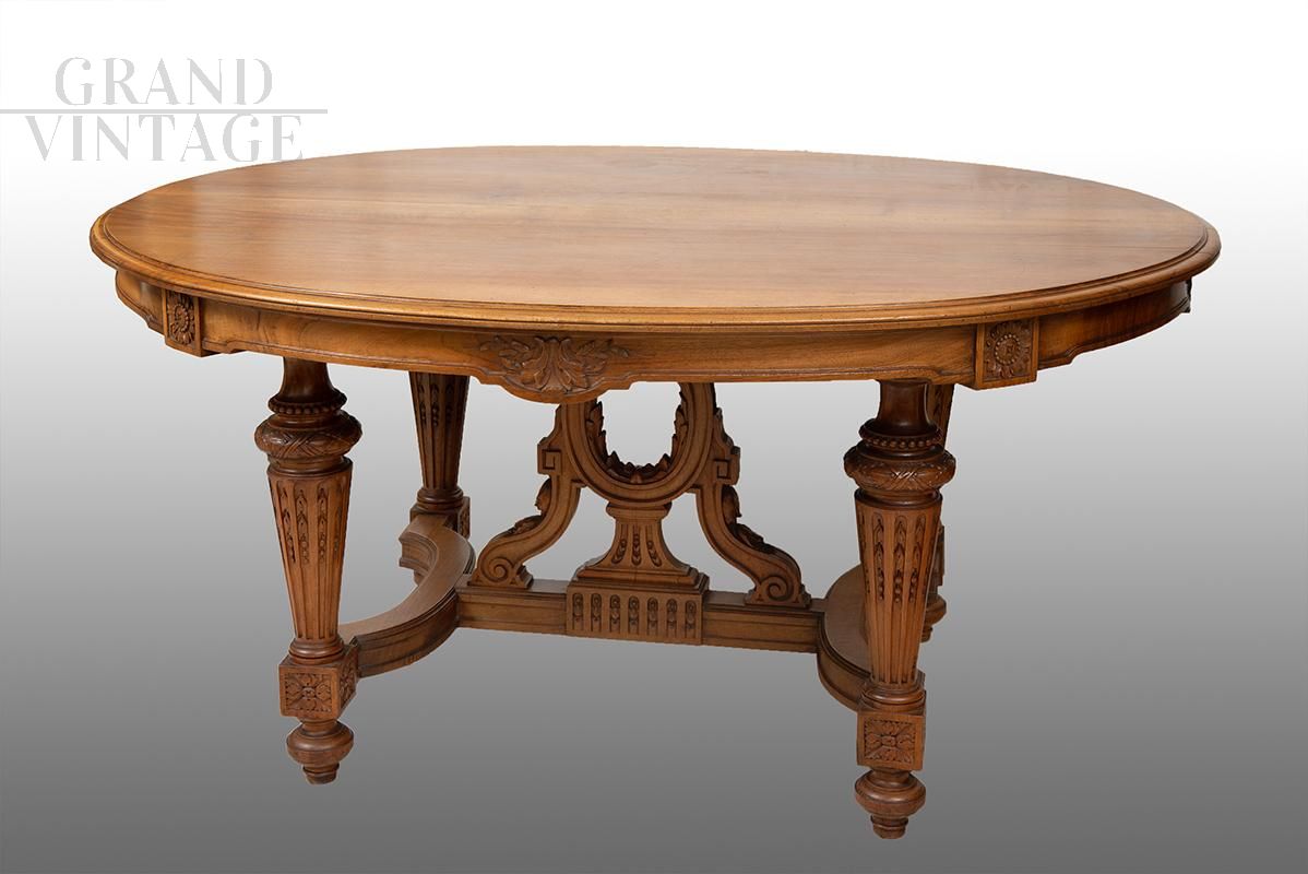 Tavolo antico Napoleone III Francese in massello di noce appartenente alla seconda metà del XIX secolo. Il piano di forma ovale è sostenuto da quattro gambe scanalate raccordate da una crociera. Il tavolo può essere allungato a strappo raggiungendo una lunghezza di 250 cm. Possibilità di abbinare anche le sedie.