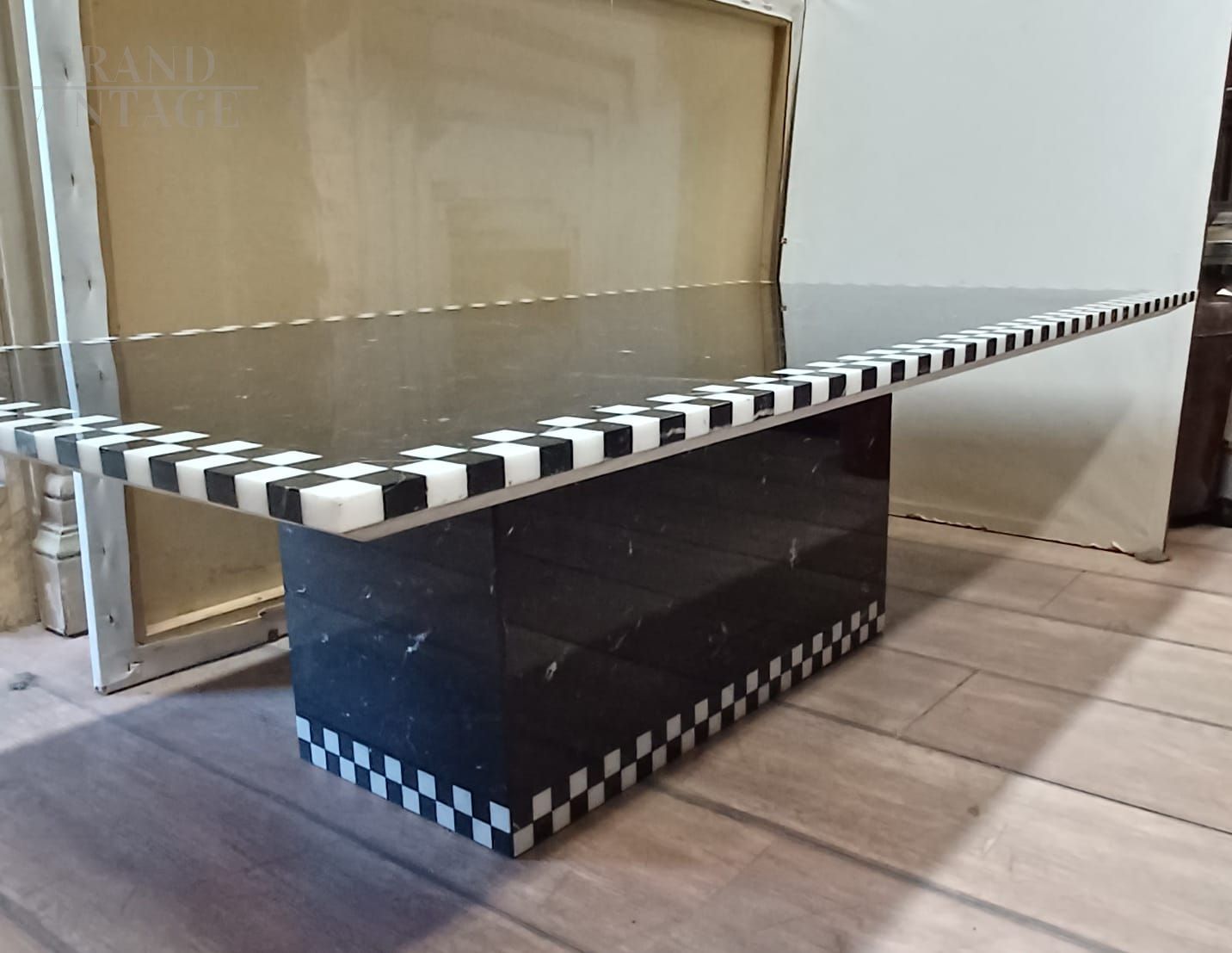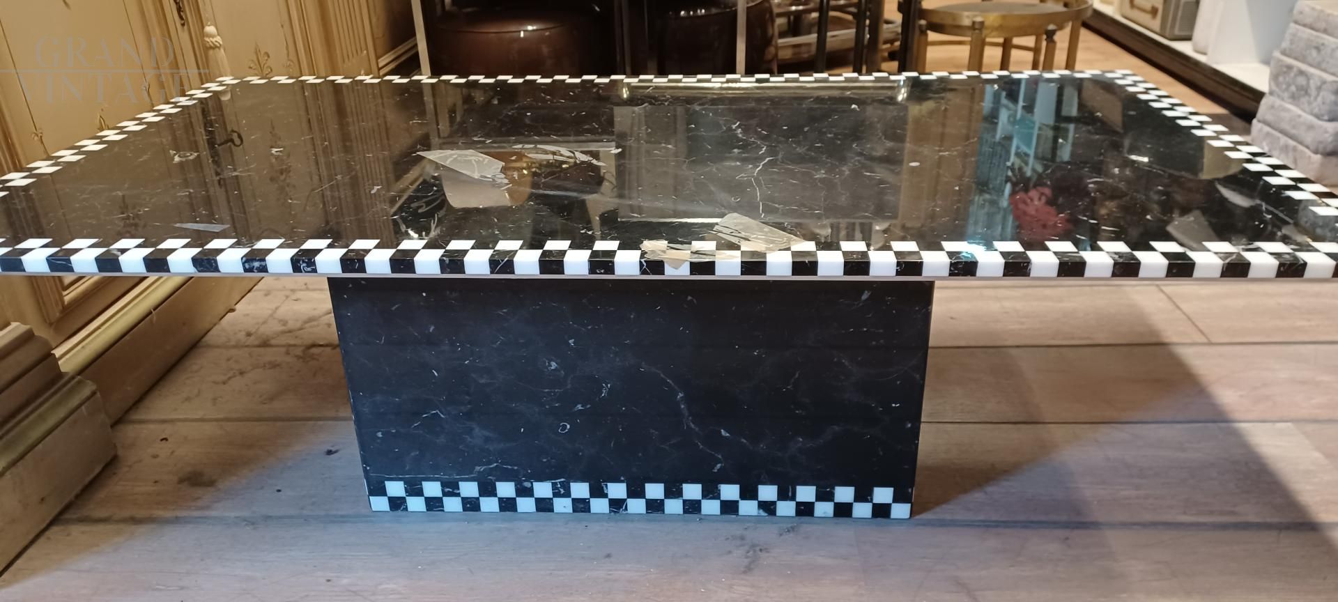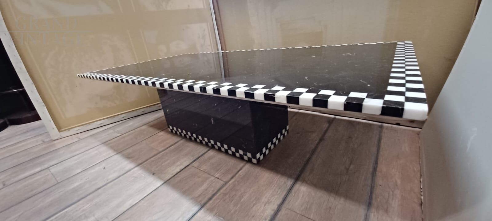 Stupendo tavolo basso da salotto Greca di Giulio Lazzotti per UpGroup in marmo nero Marquina con decori a scacchiera in marmo bianco di Carrara. Il tavolo è totalmente in marmo, sia la base che il piano, non presenta marchi o adesivi.