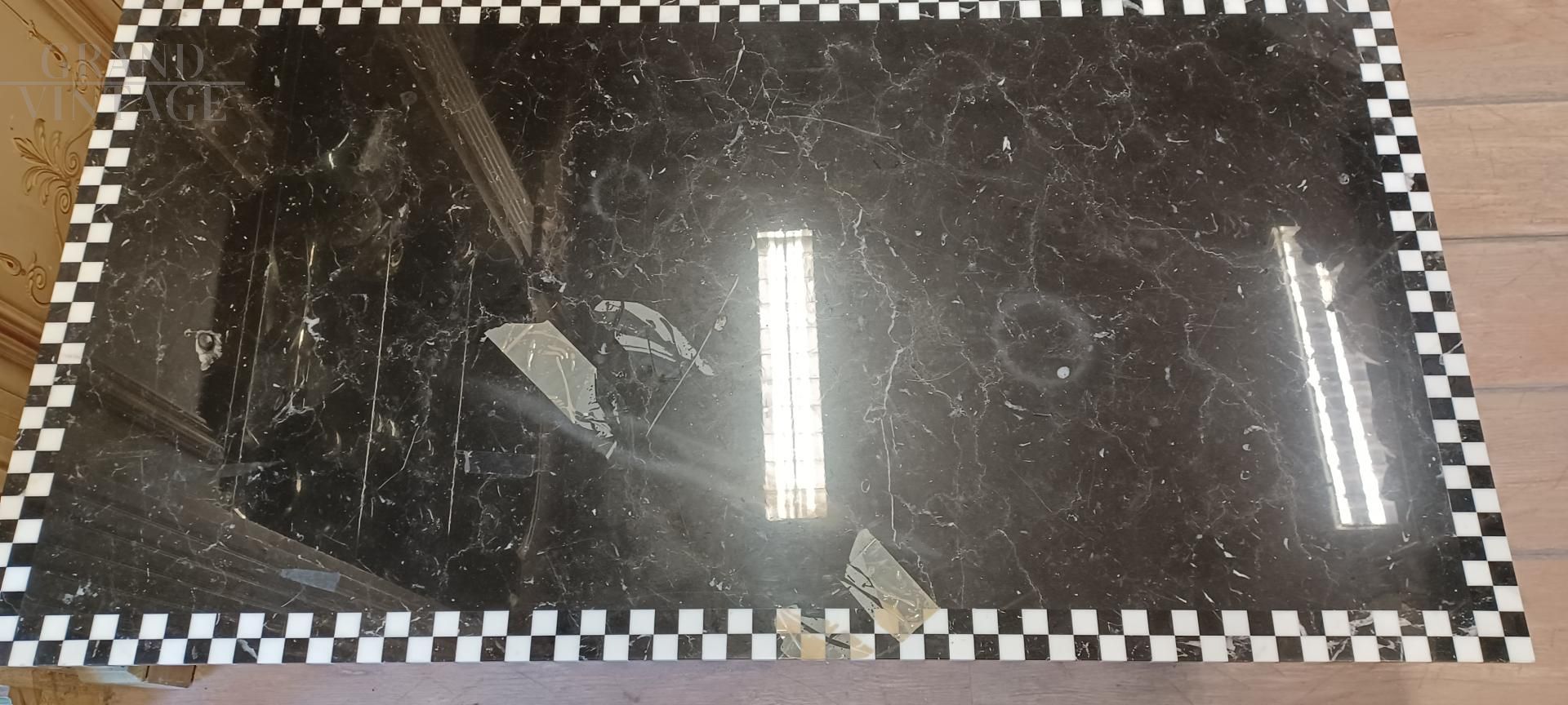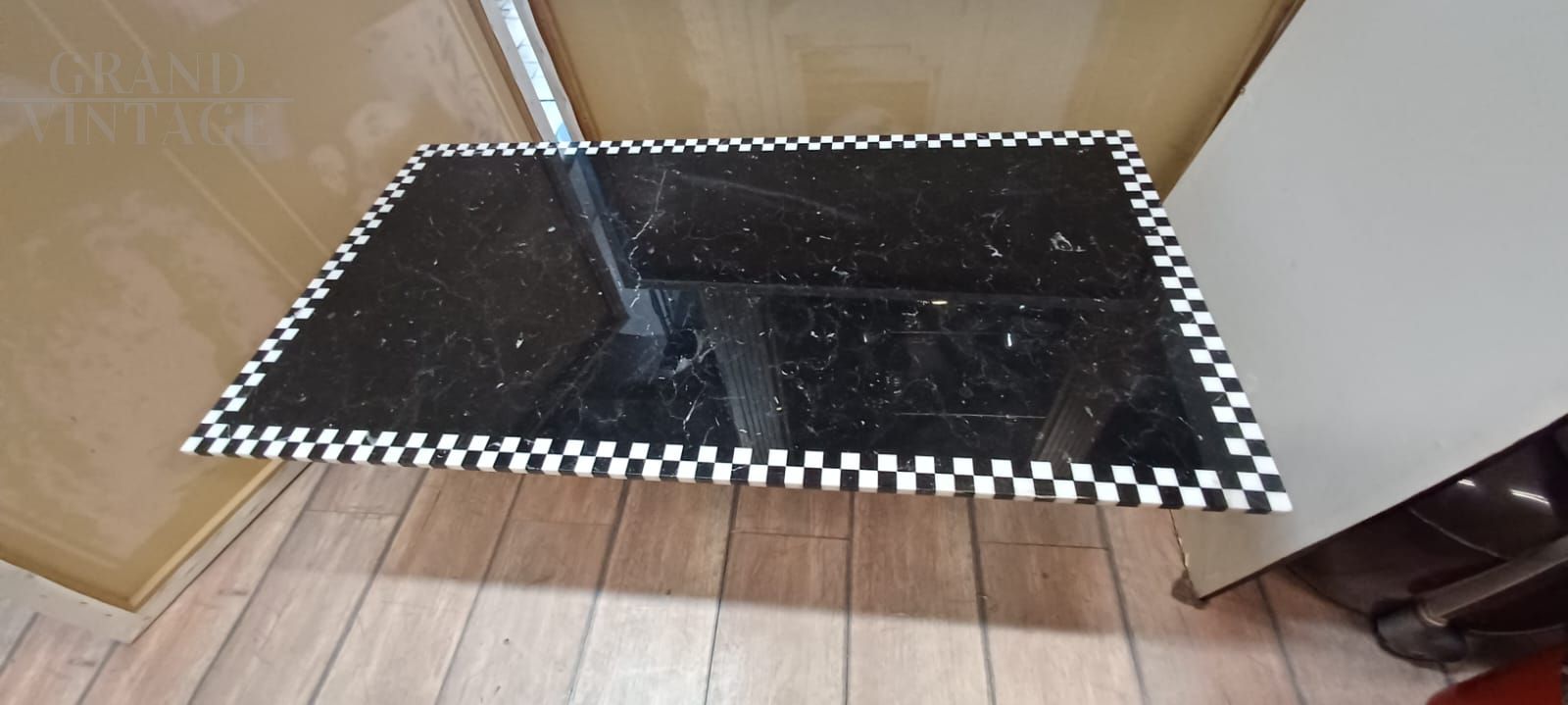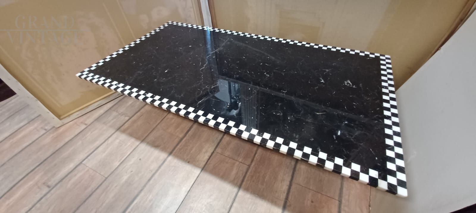 Stupendo tavolo basso da salotto Greca di Giulio Lazzotti per UpGroup in marmo nero Marquina con decori a scacchiera in marmo bianco di Carrara. Il tavolo è totalmente in marmo, sia la base che il piano, non presenta marchi o adesivi.