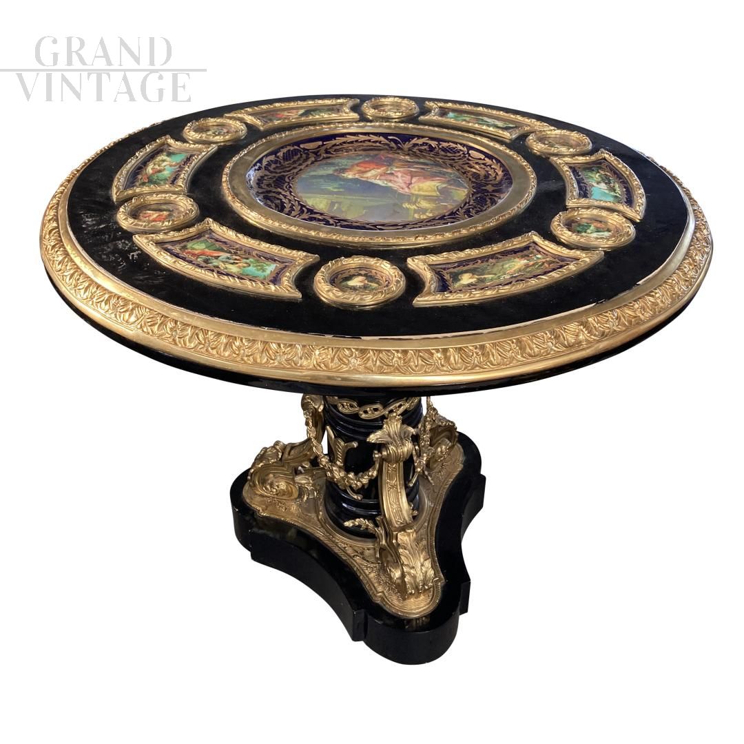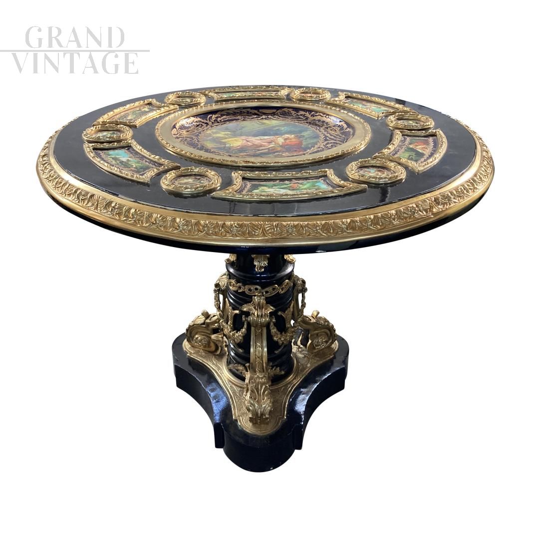 Tavolo circolare in stile antico francese Napoleone III con struttura in legno massello laccato nero, decorazioni in porcellana multicolore e bronzo dorato. Questo magnifico tavolo attira davvero l’attenzione in qualsiasi ambiente di vita o di lavoro!
