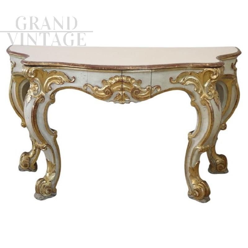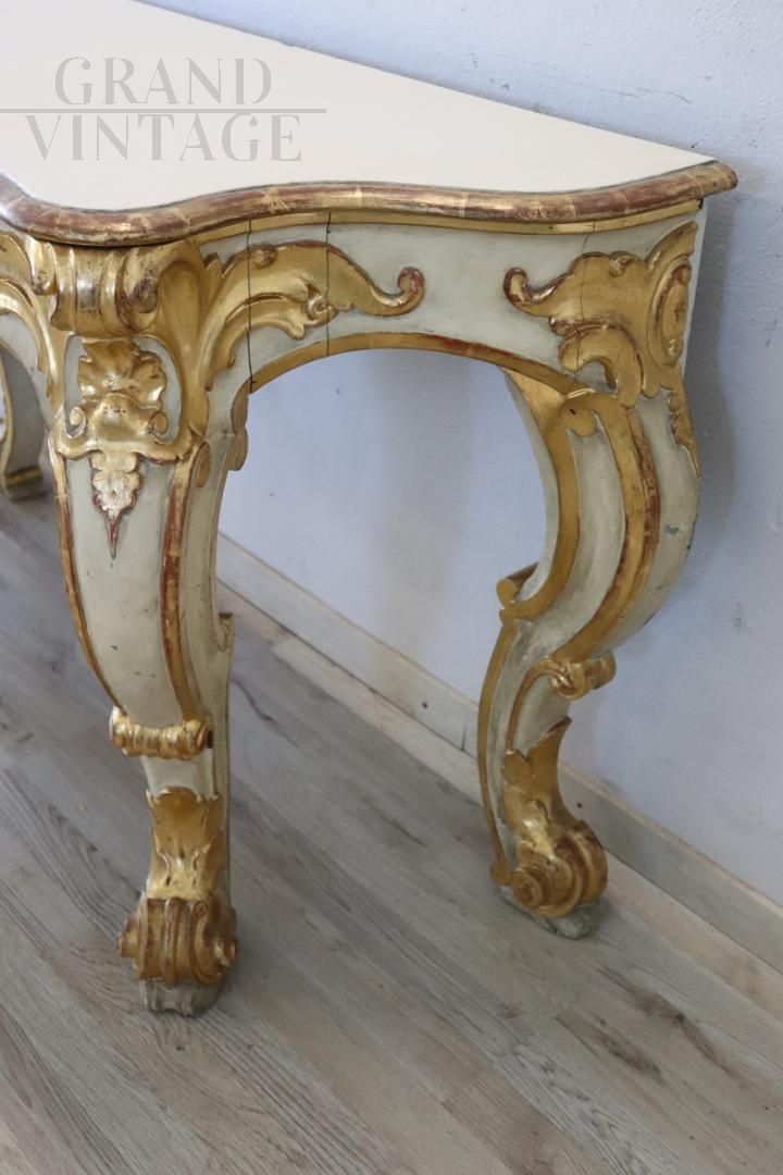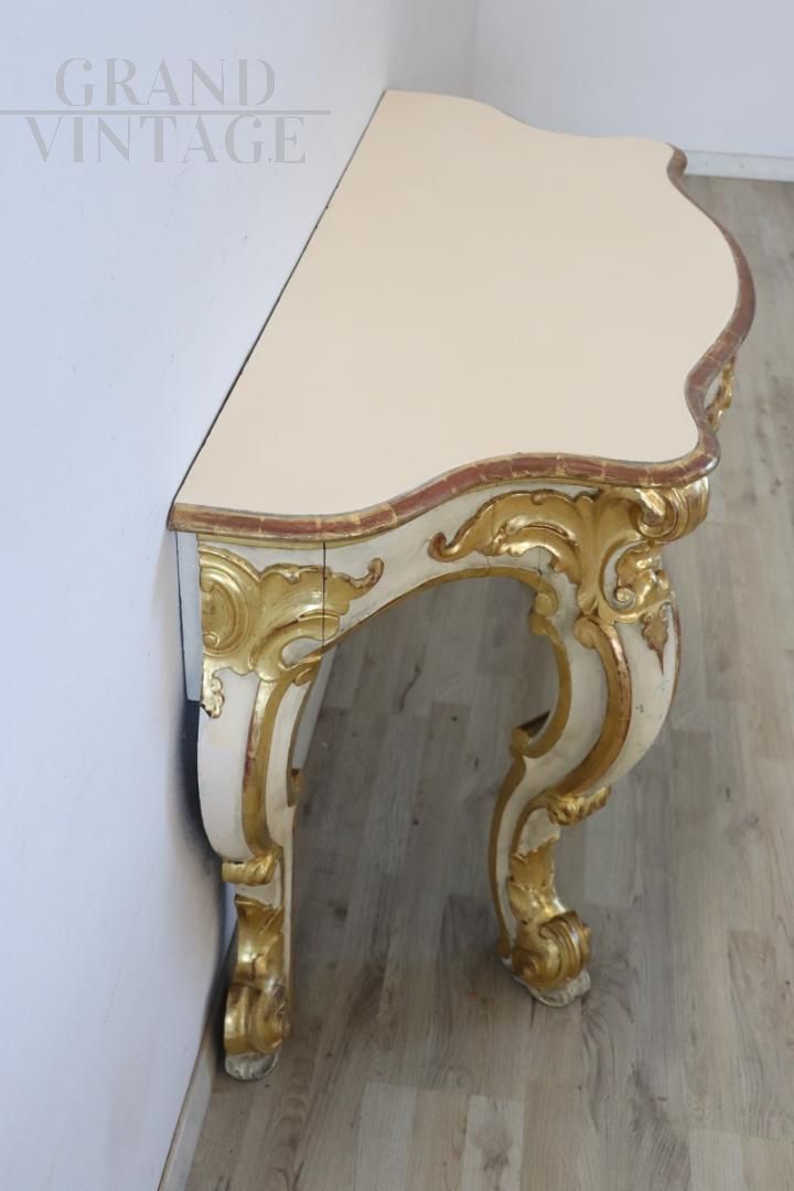 Bellissima consolle del XX secolo con un design che richiama l'epoca barocca, caratterizzata da ricche decorazioni e lavorazioni intricate. Realizzata in legno, la consolle è decorata con intagli a rilievo di foglie d'acanto, conchiglie e riccioli. La base è laccata mentre le decorazioni sono dorate a foglia d'oro, indicando una lavorazione di pregio. Presenta i naturali segni del tempo, particolarmente evidenti in alcune parti della laccatura e doratura, ma il piano della consolle è stato recentemente restaurato con una nuova laccatura, migliorandone l'aspetto estetico complessivo. La consolle è versatile, ideale per arredare un ingresso o una sala e può essere abbinata a un dipinto o una specchiera per un tocco di eleganza classica. Prezzo trattabile.