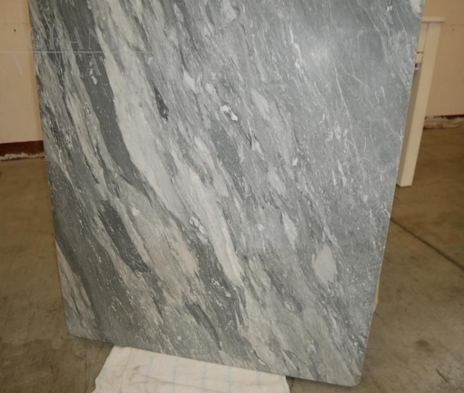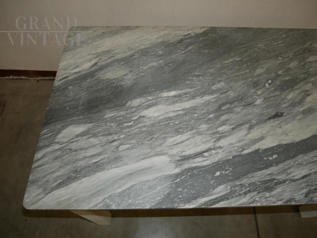 Tavolo da cucina vintage rettangolare in legno laccato con piano in marmo grigio venato, completo di taglieri, mattarello e un cassetto per le posate, Italia anni '50. In ottime condizioni, il tavolo è stato restaurato con fondo in cementite, resta da dare la vernice di finitura (in origine era di colore verde chiaro). Il piano è stato restaurato e lucidato, i piedi sono squadrati con angoli arrotondati.