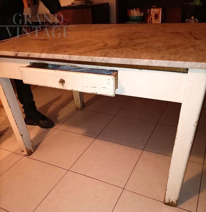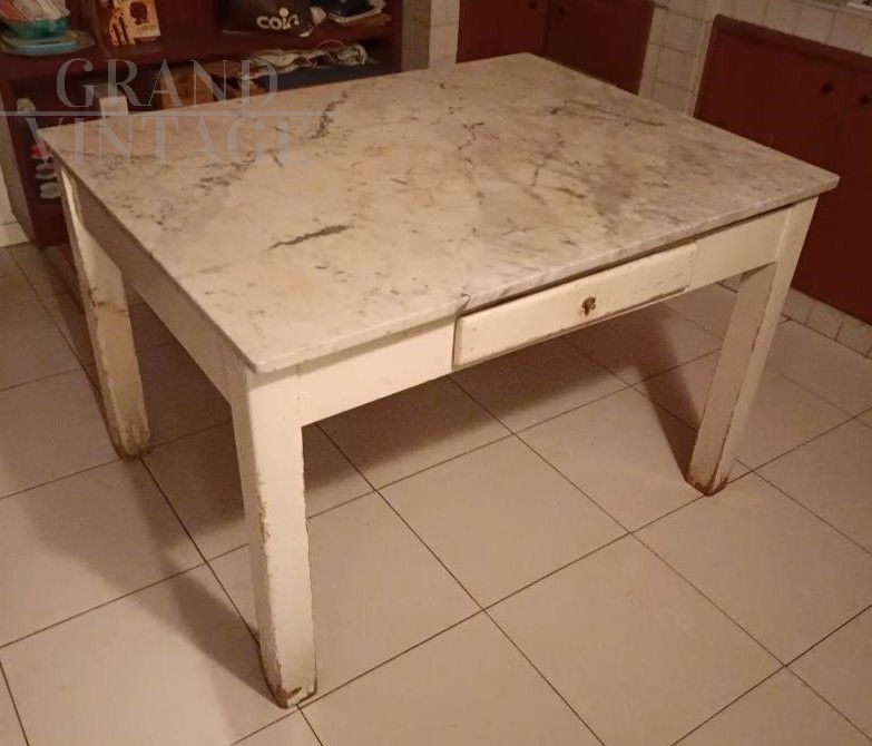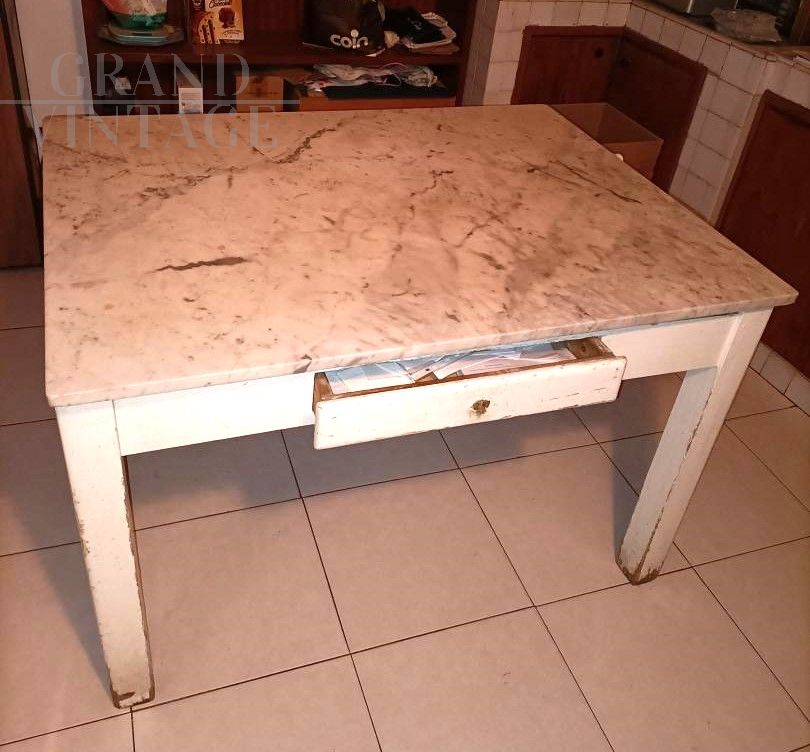 Tavolo vintage anni '50 in legno con piano in marmo, cassetto centrale, mattarello e piano di lavoro o tagliere aggiuntivo. Mancante del pomello del cassetto.
