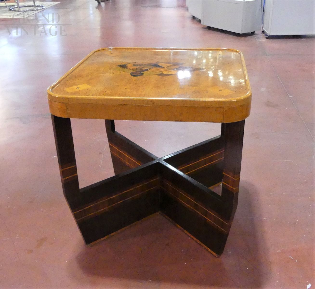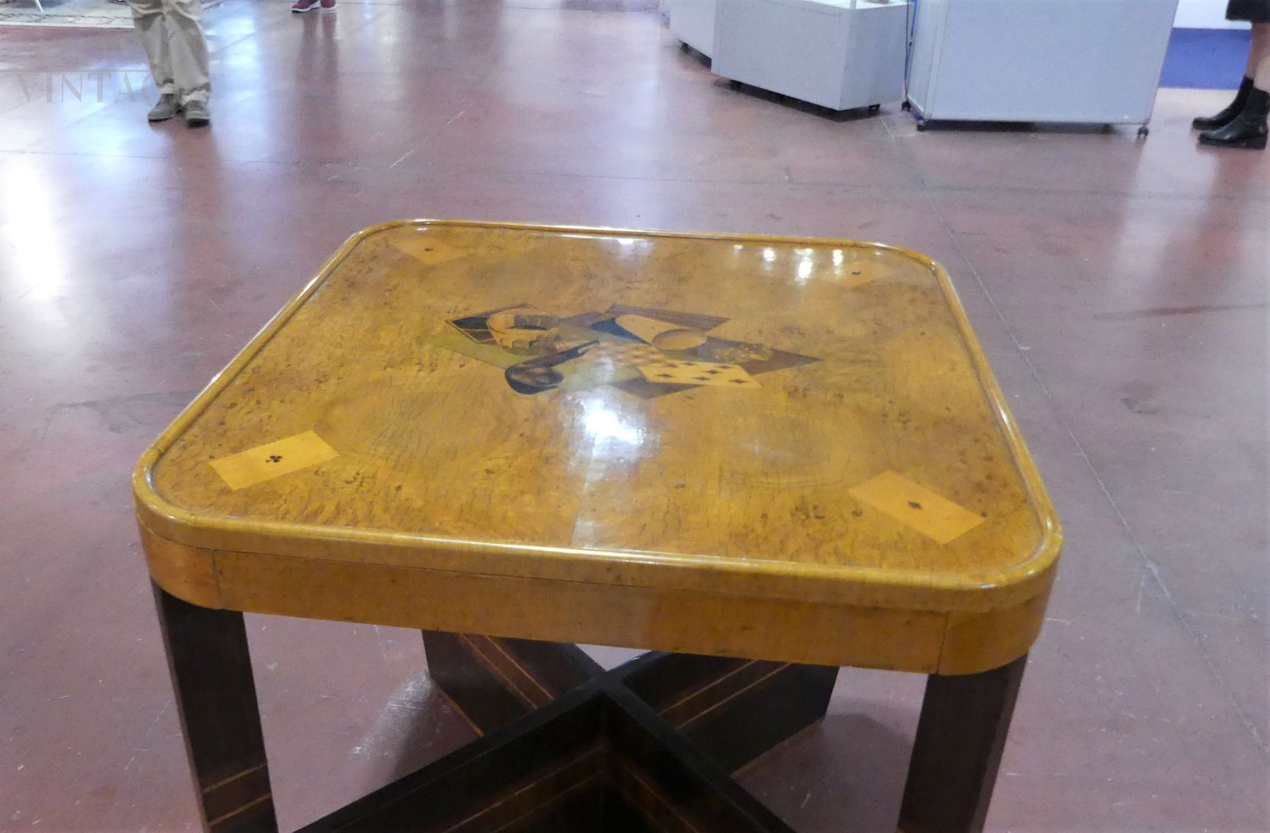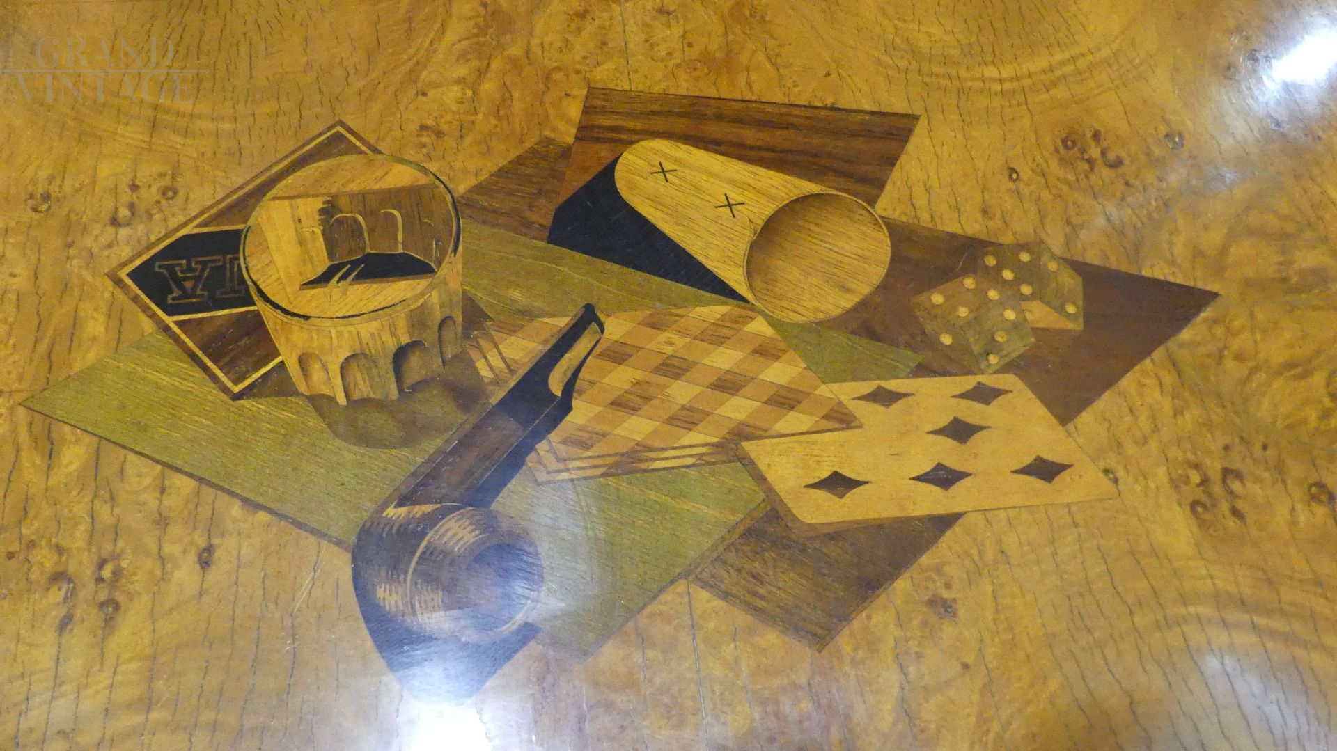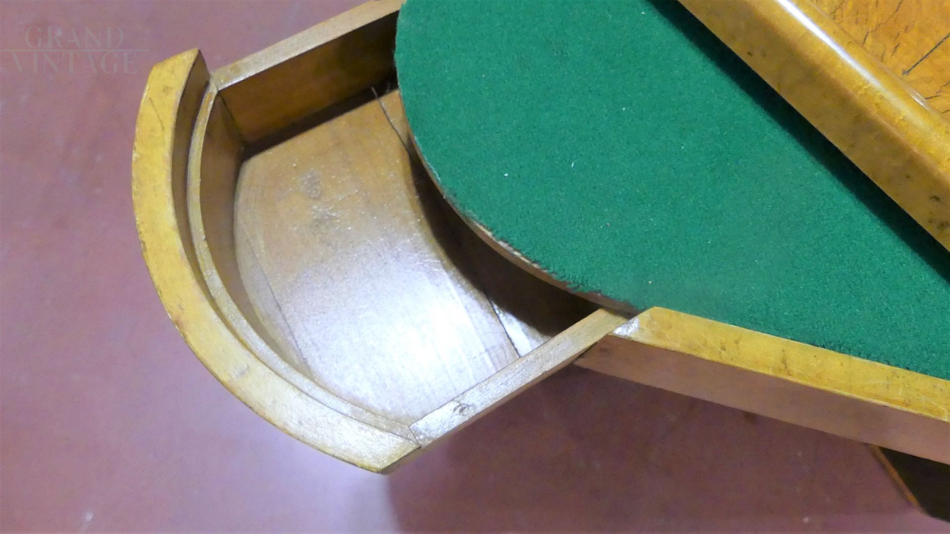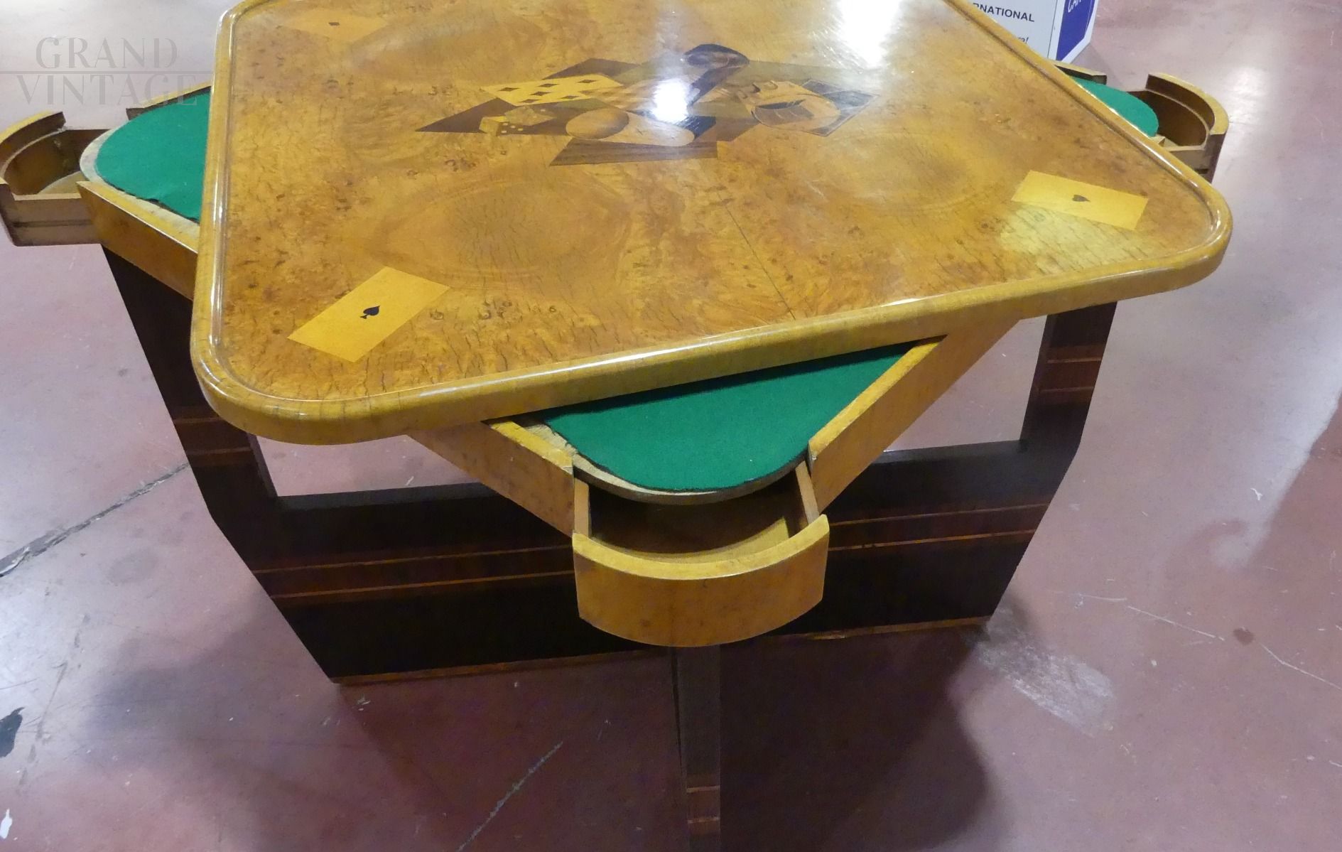 Bellissimo tavolo da gioco Art Déco con piano intarsiato estraibile e panno verde applicato nel vano inferiore.