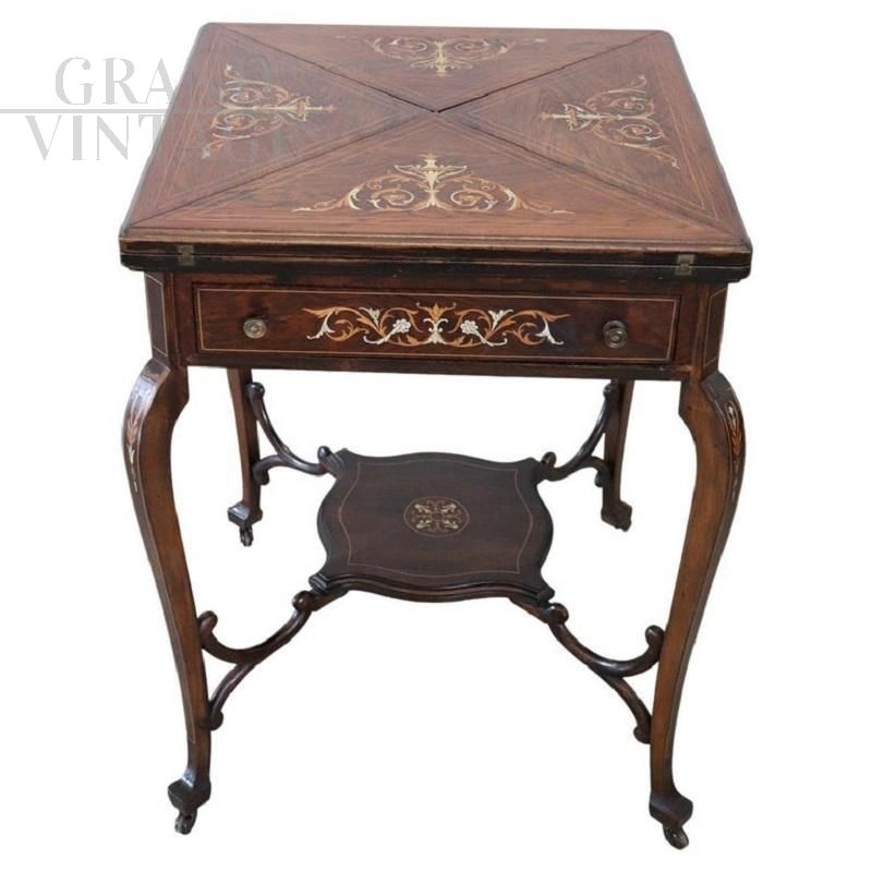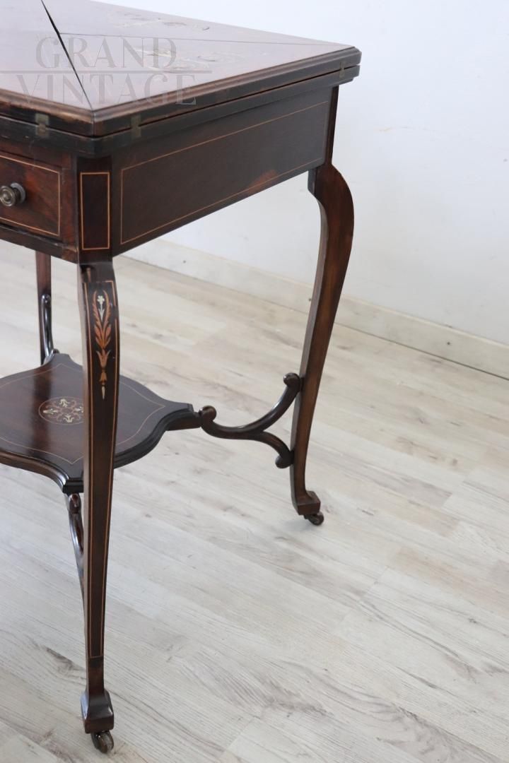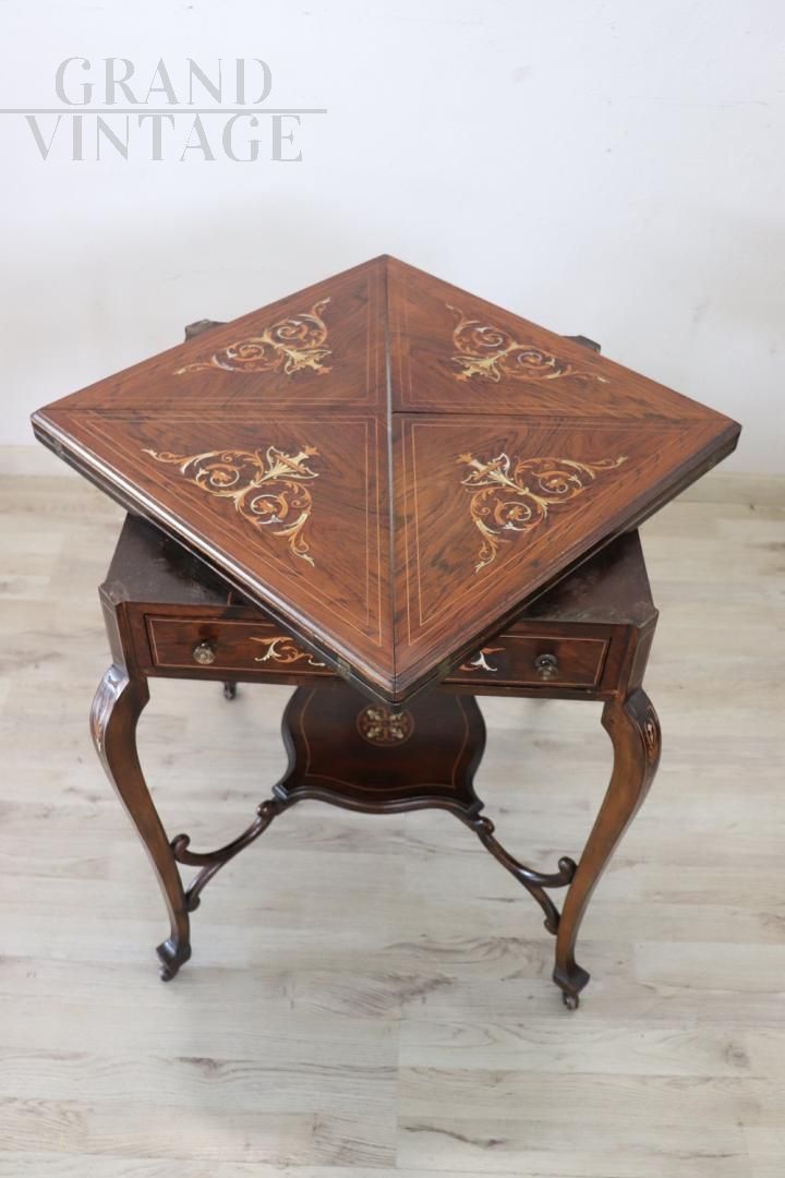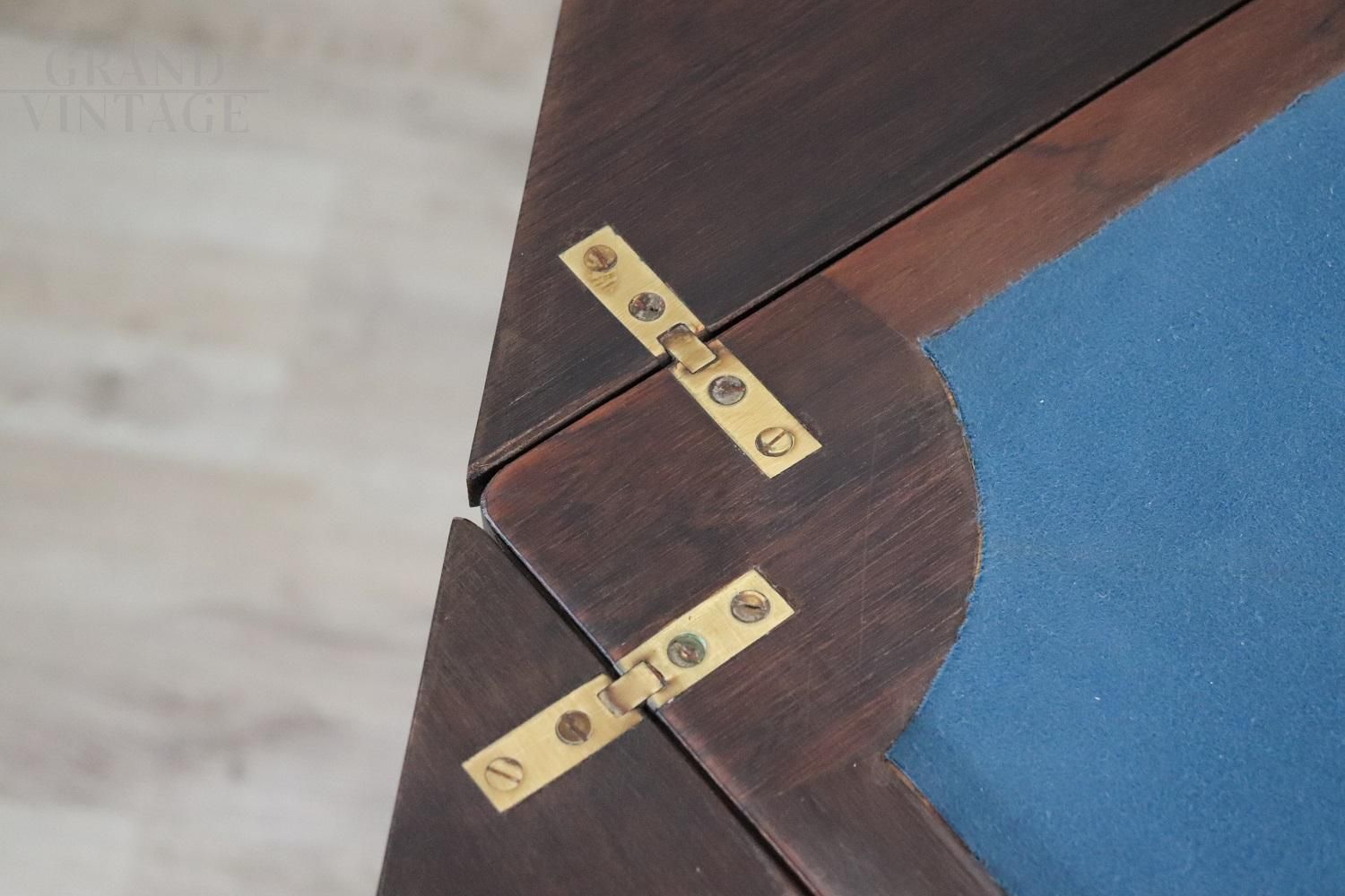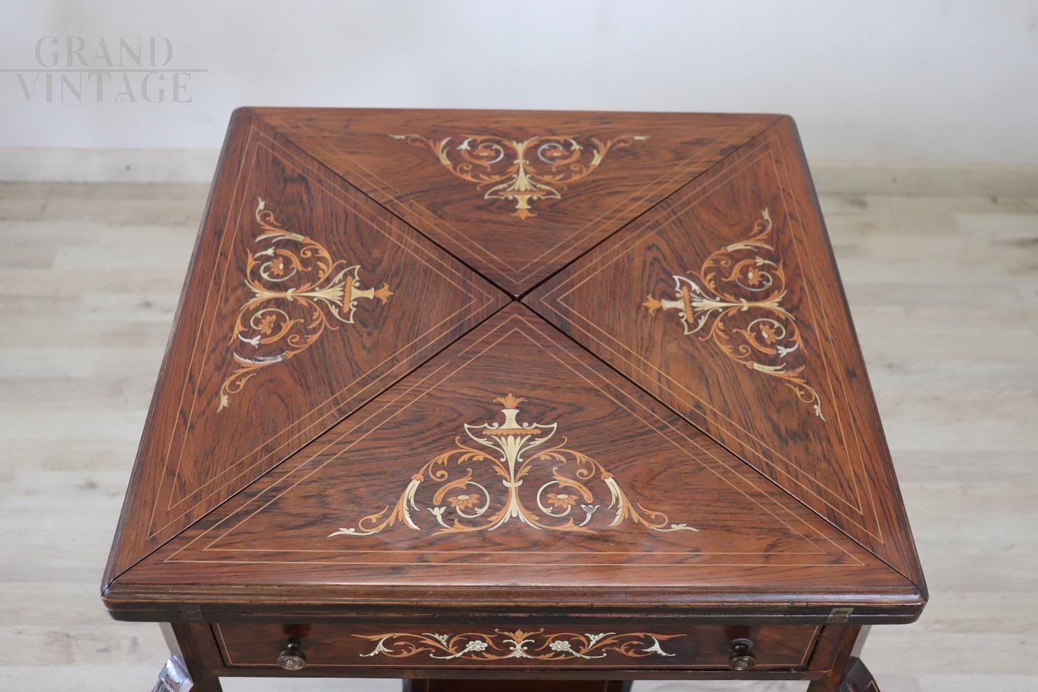Tavolo da gioco stile antico in palissandro intarsiato, anni '40