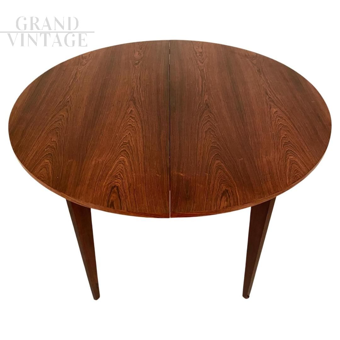 Tavolo da pranzo rotondo allungabile attribuito all'iconica azienda italiana Vittorio Dassi, prodotto negli anni '60. Il tavolo rappresenta un ottimo esempio di design modernariato italiano di alta quailità, con un bellissimo piano impiallacciato in mogano dove le venature del legno creano un effetto raffinato che poggia su una elegante stuttura in legno massello. L'oggetto è stato completamente restaurato: La struttura è stata rinforzata e riparata. Meccanismo di allungamento perfettamente funzionante. L'impiallacciatura è in perfette condizioni. Condizioni generali molto buone, con pochi segni del tempo.