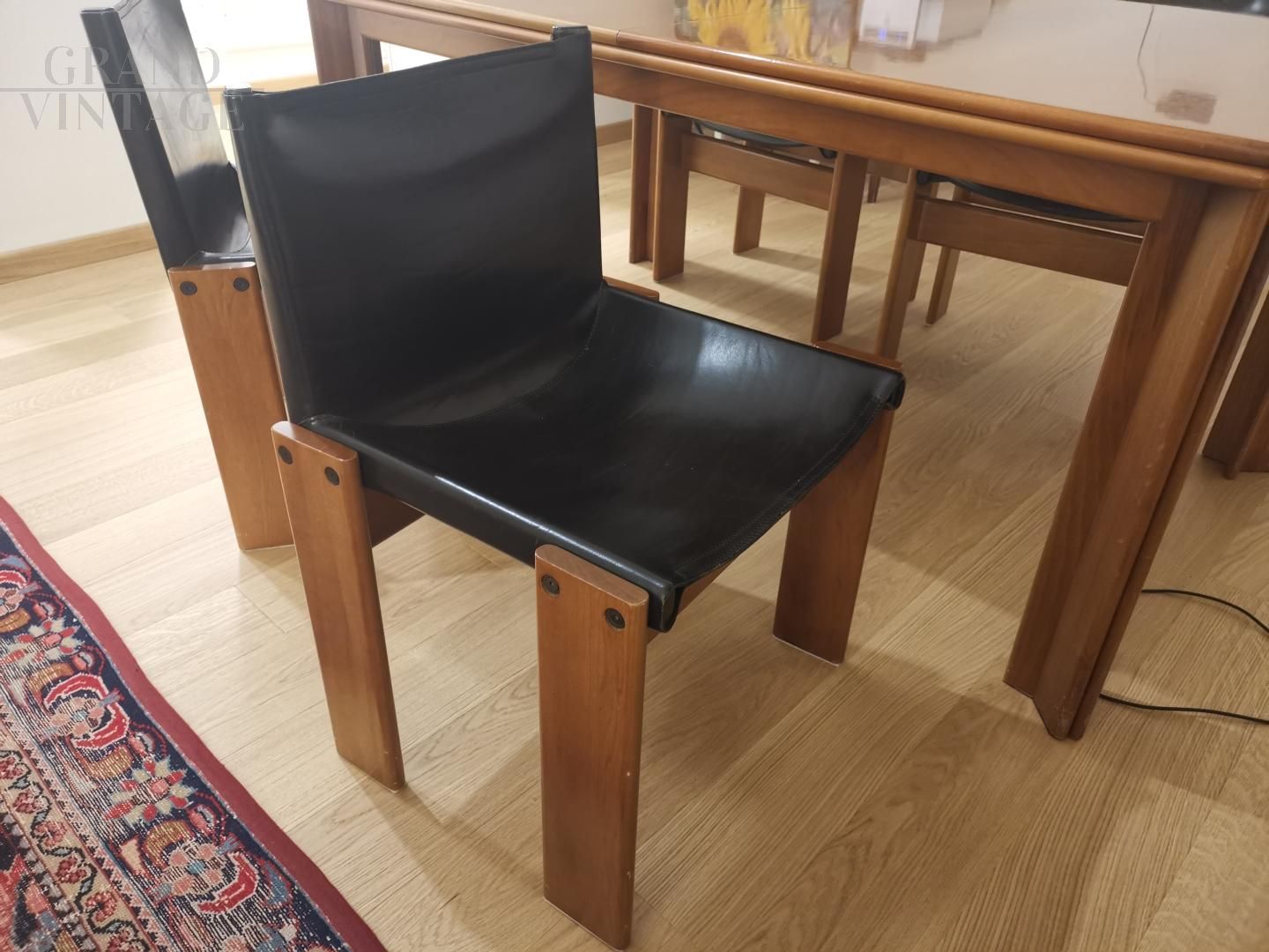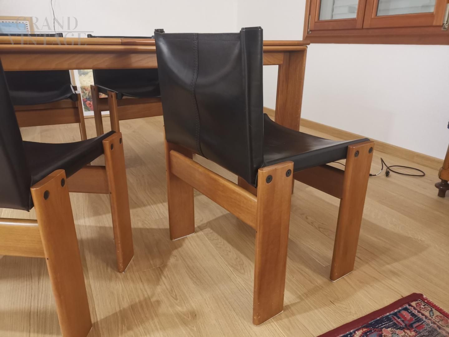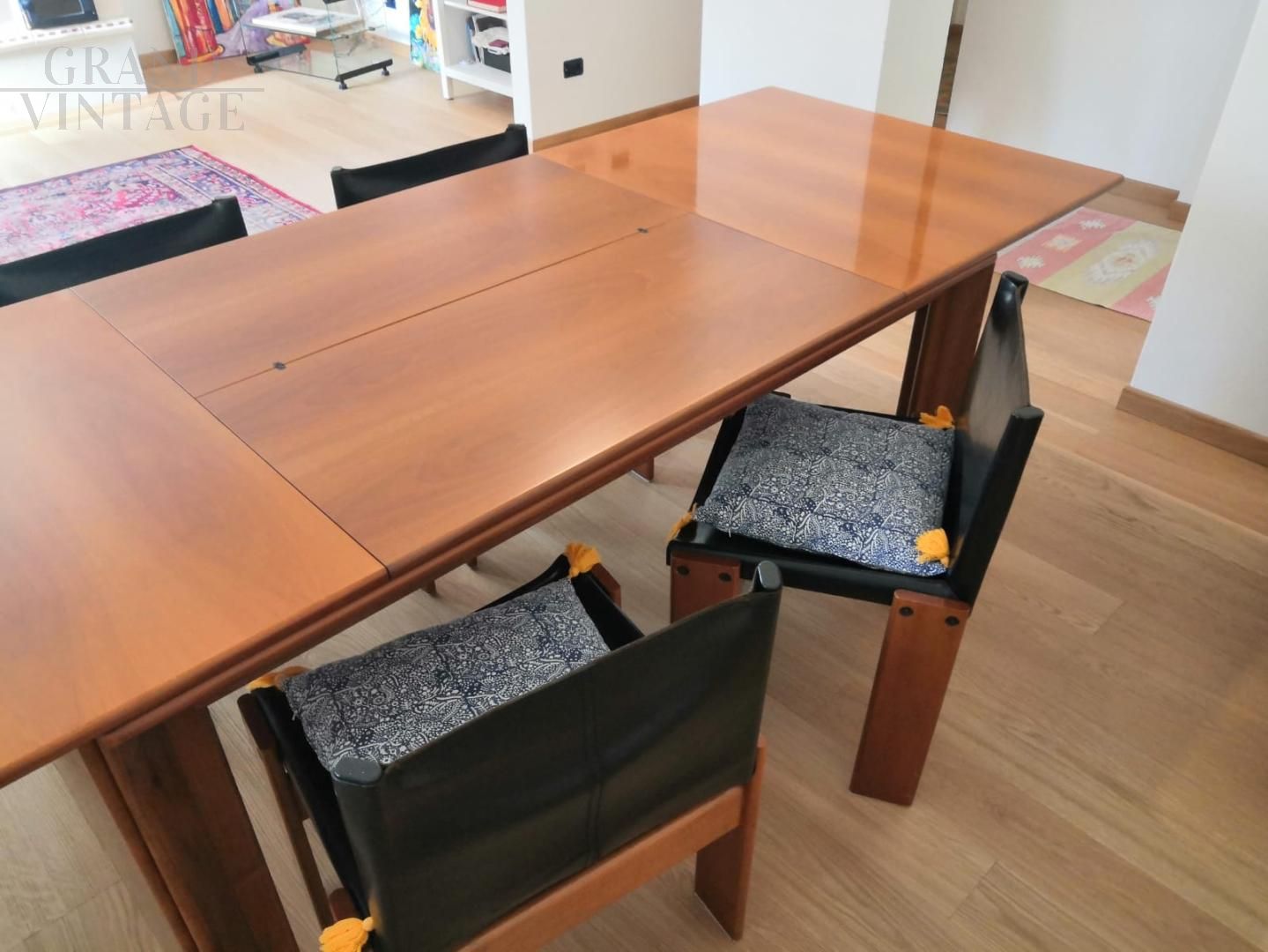 Tavolo allungabile in legno massello impiallacciato e bordato, modello Mou di Afra e Tobia Scarpa, prodotto da Molteni, compreso di 4 sedie modello Monk in legno e pelle nera, sempre disegnate da Afra e Tobia Scarpa per Molteni. Tavolo e sedie sono stati realizzati negli anni '70, presentano classici segni di usura dovuti all'età ed all'utilizzo, ma nessun difetto degno di nota. Anche la pelle delle sedie non presenta tagli o graffi.