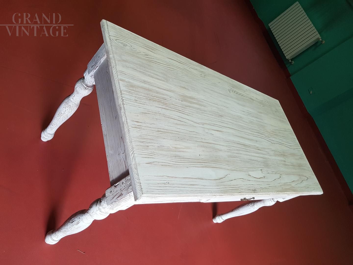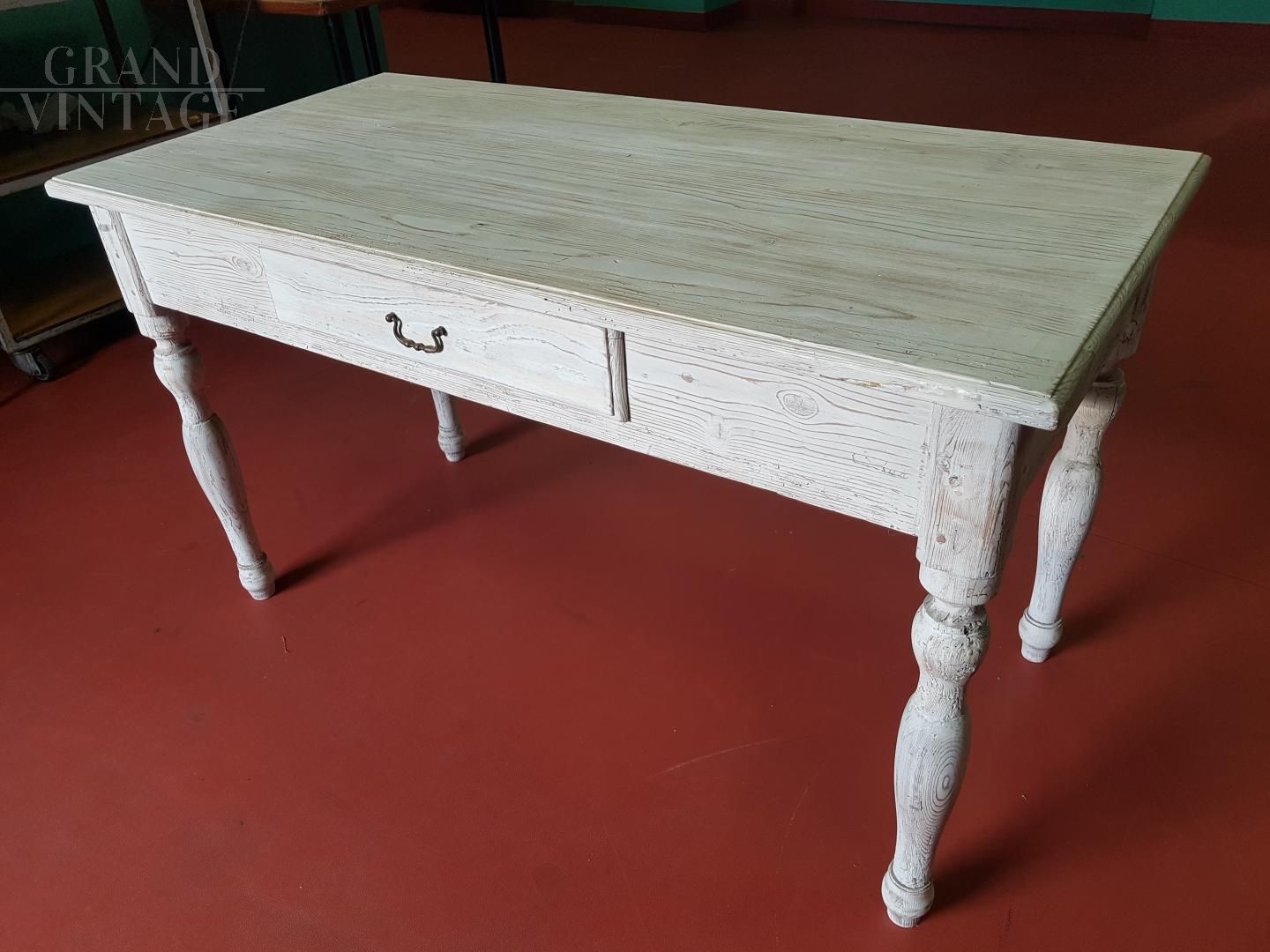 Bellissimo tavolo antico della metà dell'800 in legno di abete laccato in stile shabby chic, spazzolatura tinta noce su fondo bianco, completo di cassetto centrale, completamente restaurato con ciclo antitarlo, finitura acrilica e cera d'api. Pezzo unico sul mercato.