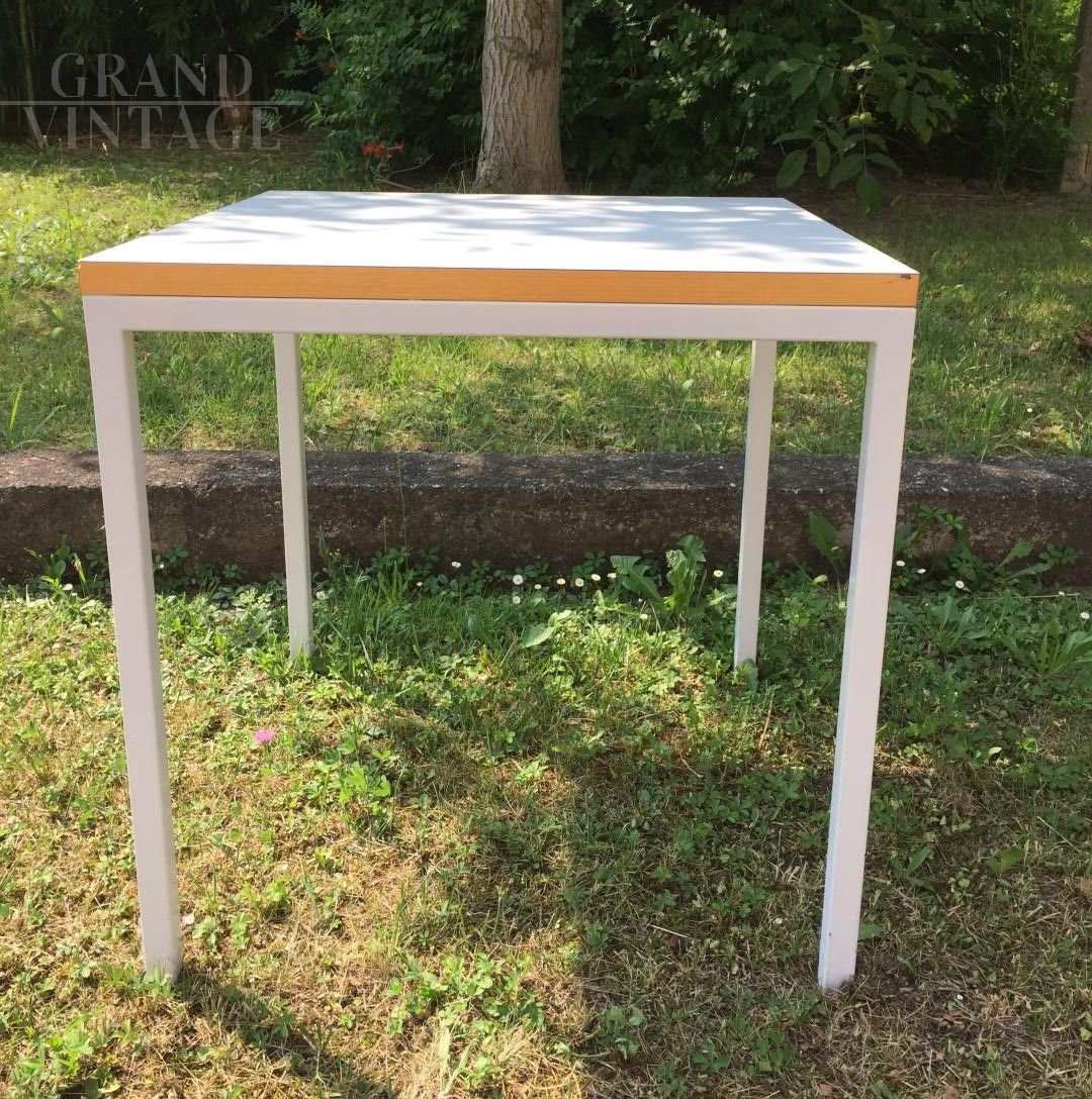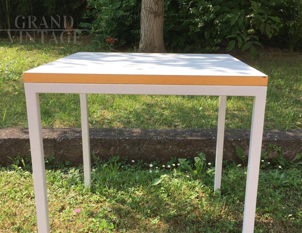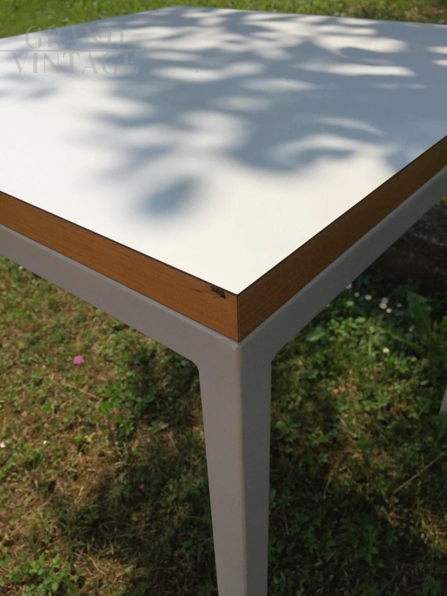 Tavolo da pranzo design stile De Padova con piano quadrato in multistrato marino bianco di 70 x 70 cm e gambe in acciaio verniciato bianco. Disponibili 3 pezzi, disponibili a comporre un tavolo unico della lunghezza complessiva di 210 cm. In ottime condizioni, i tavoli erano disposti nella vetrina di un negozio di design.