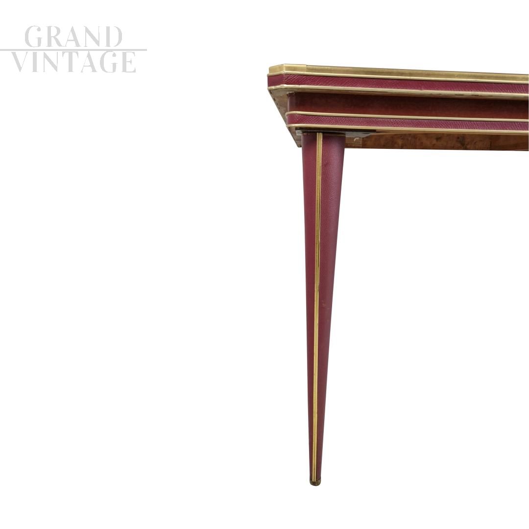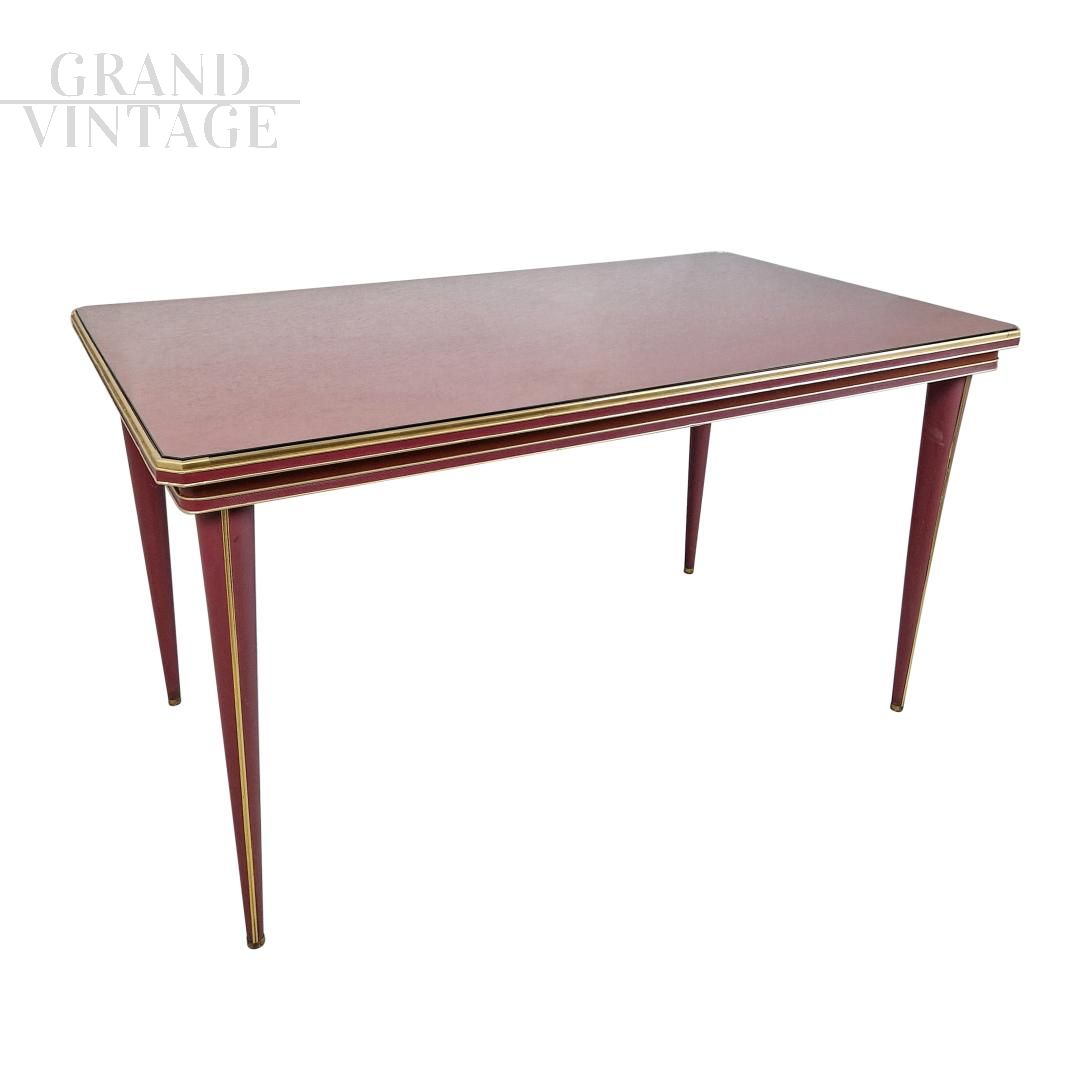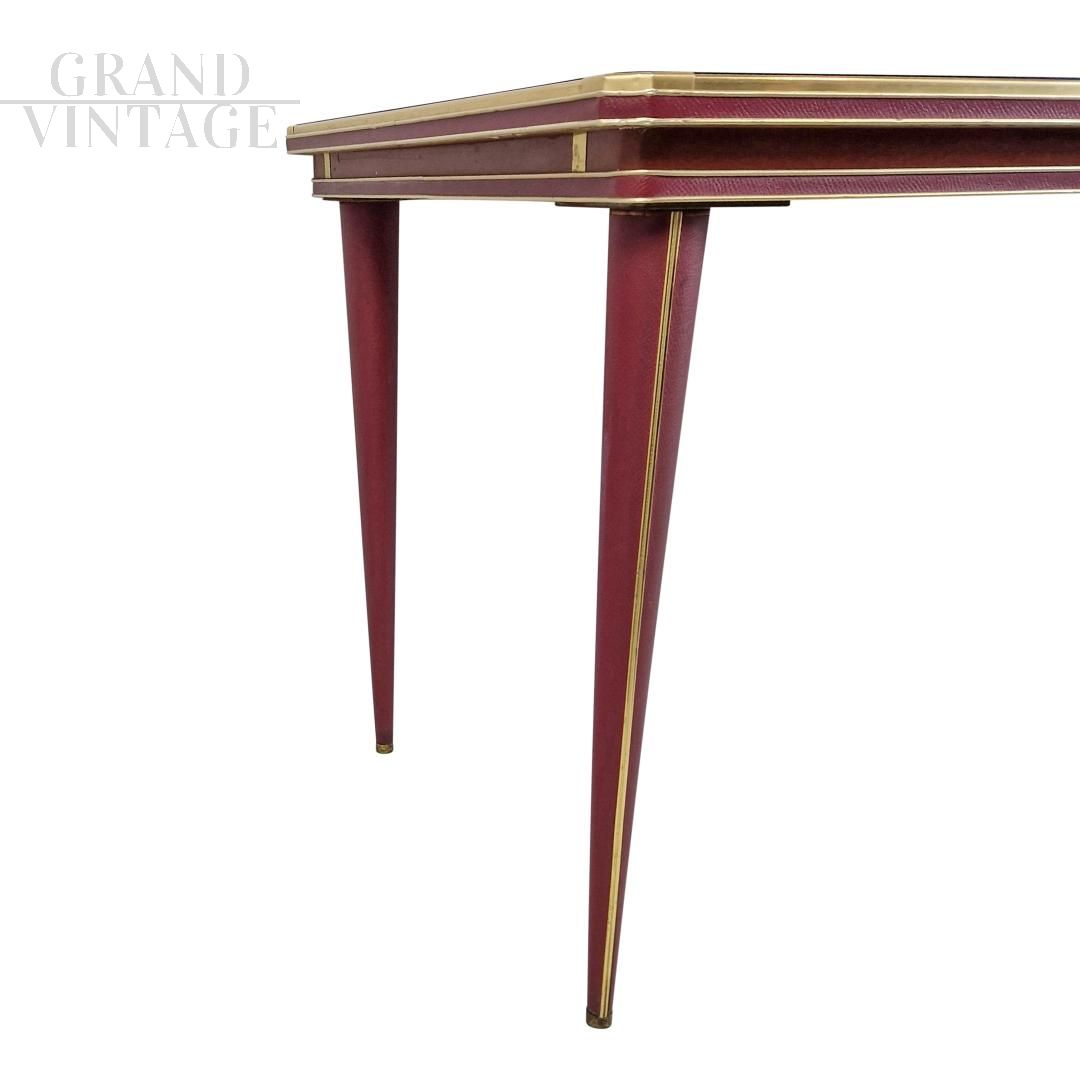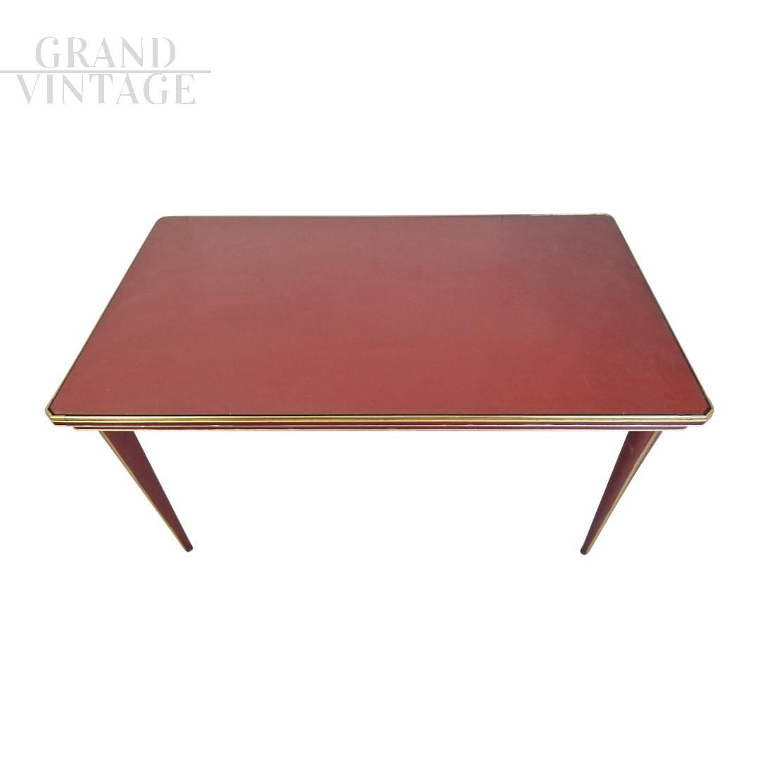 Tavolo da pranzo design di Umberto Mascagni (Bologna, anni ’50) per Harrods, con la struttura del corpo principale e le quattro gambe in legno massello, rivestite in pelle rossa con profili in ottone. Il top, anch’esso in pelle rossa, è protetto da una lastra in vetro trasparente. Ottimo lo stato di conservazione.