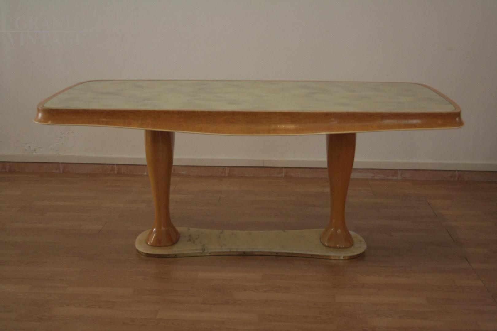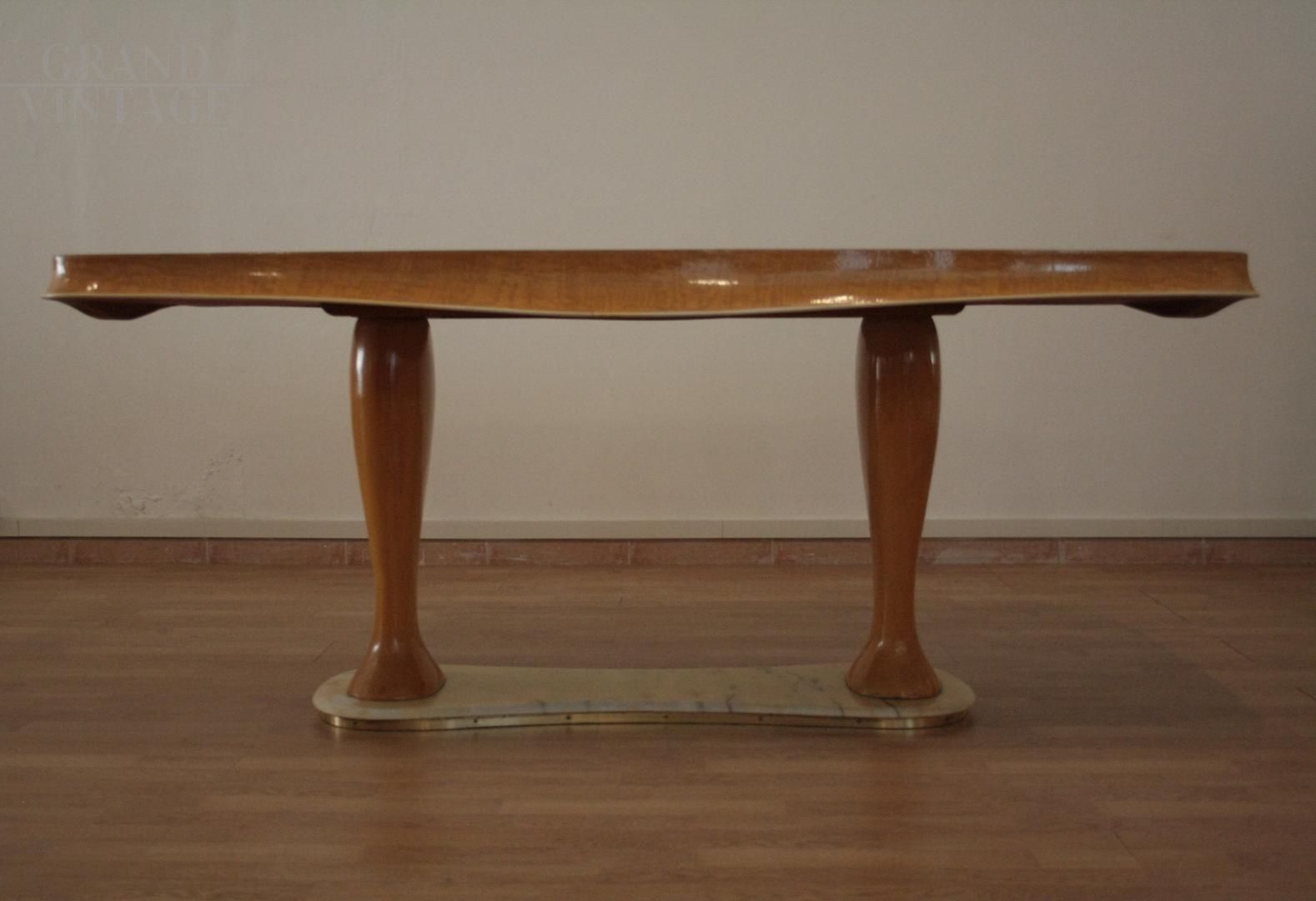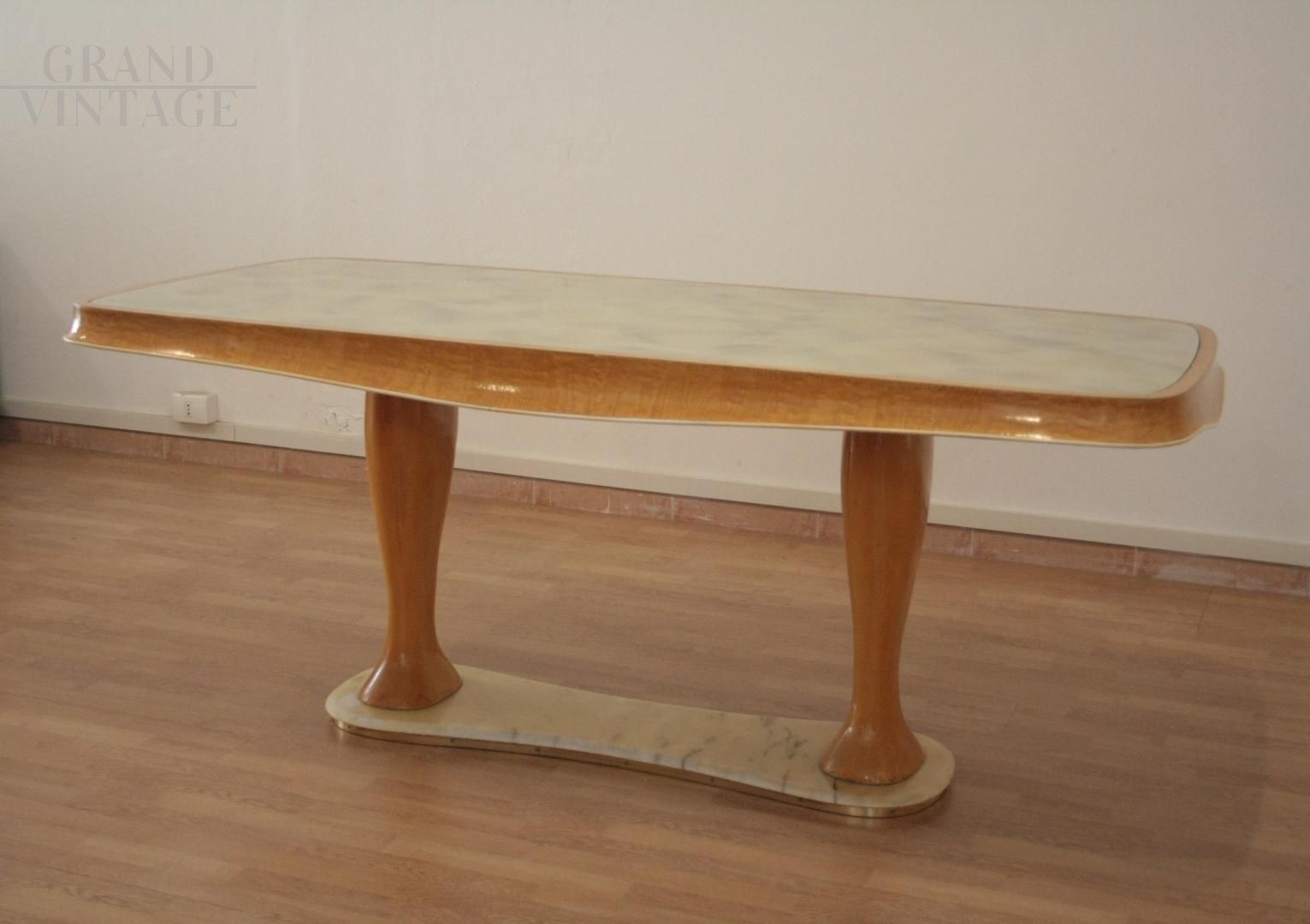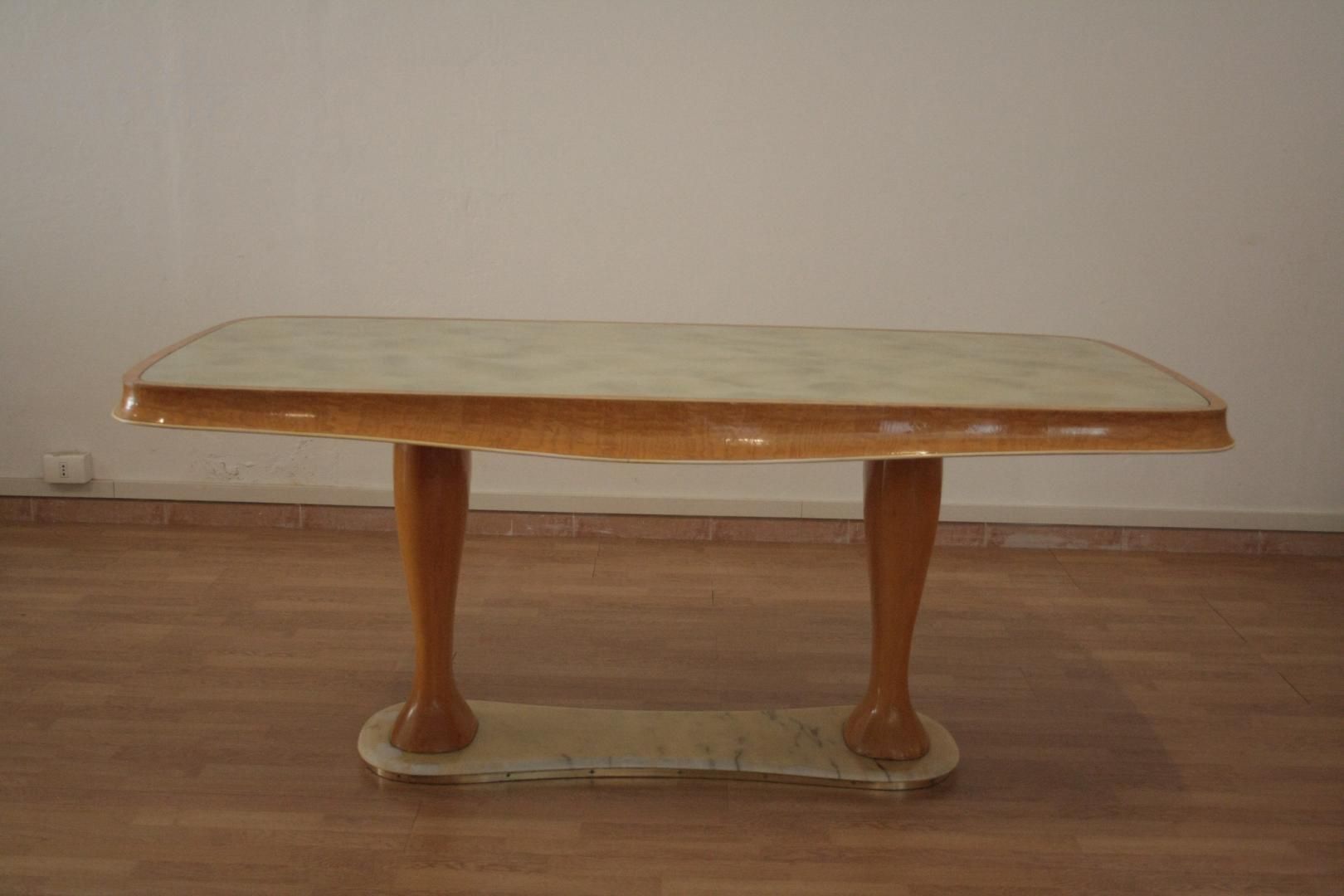 Questo tavolo da pranzo Mid-Century Moderno di Vittorio Dassi degli anni '50 è un pezzo originale dal design unico in stile mid-century modern. Struttura e piedi in legno rifiniti da una base in marmo bianco con filettatura inferiore in ottone. Ampio piano in vetro. Condizioni di conservazione ottime. Un'aggiunta perfetta per qualsiasi ambiente che desideri un tocco di eleganza decò. Dimensioni del tavolo larghezza 195 cm per una profondità di 95 cm e una altezza di 80 cm.