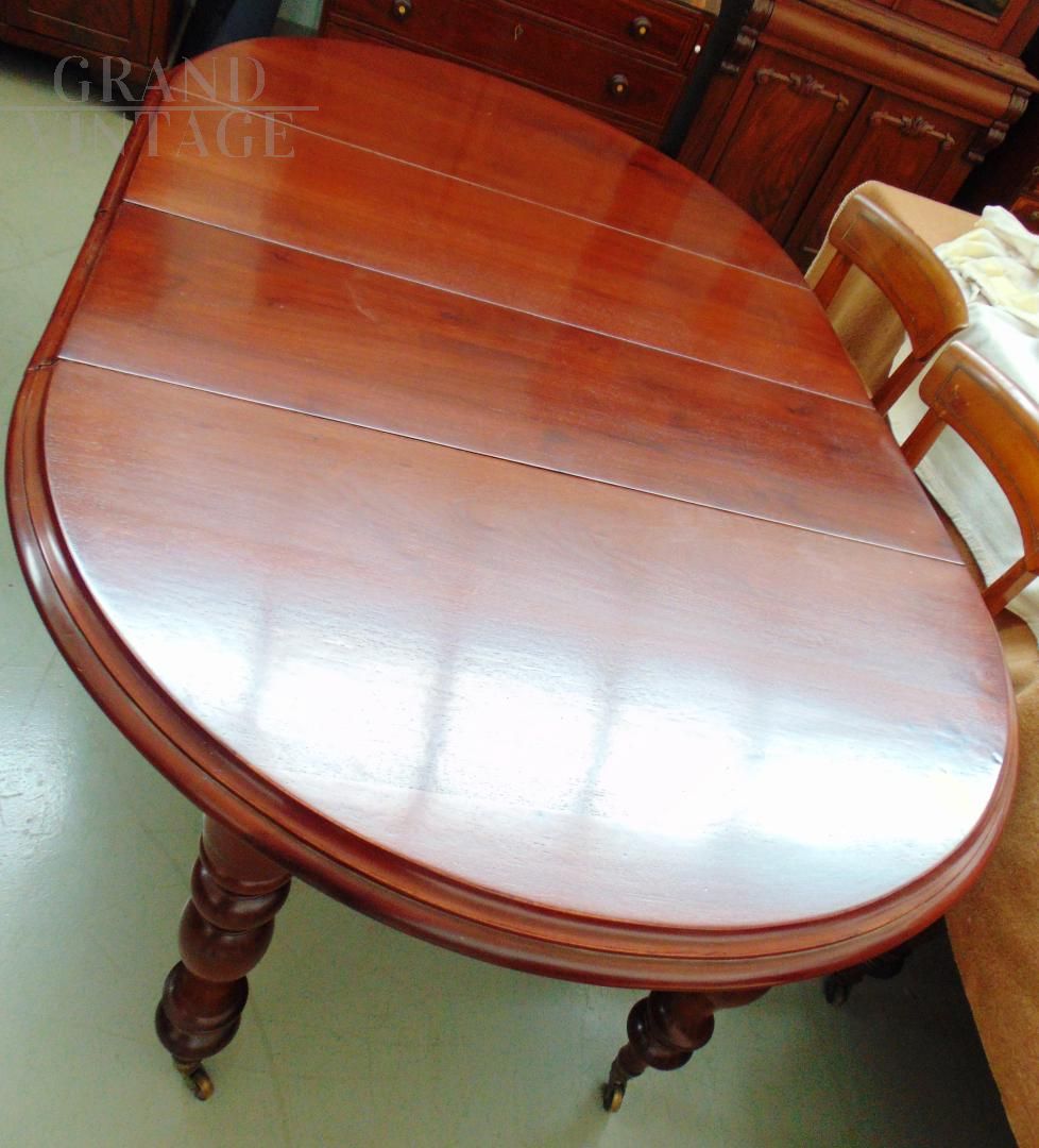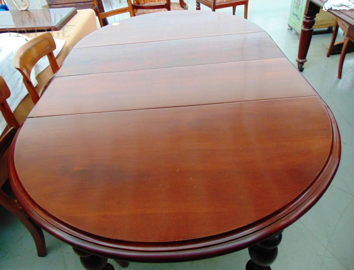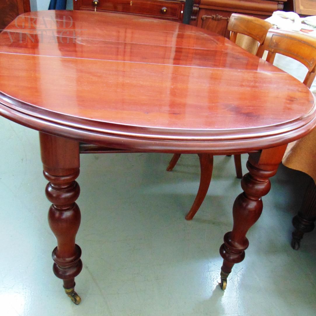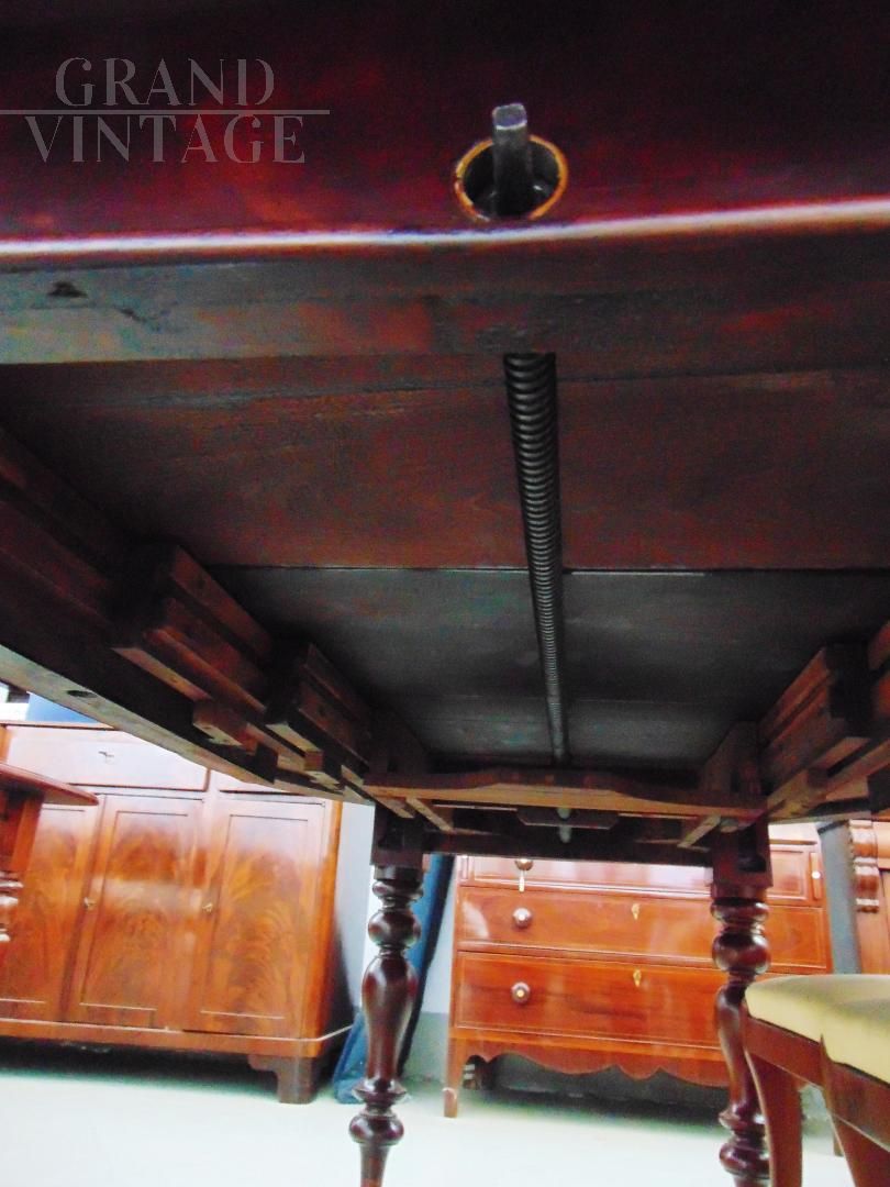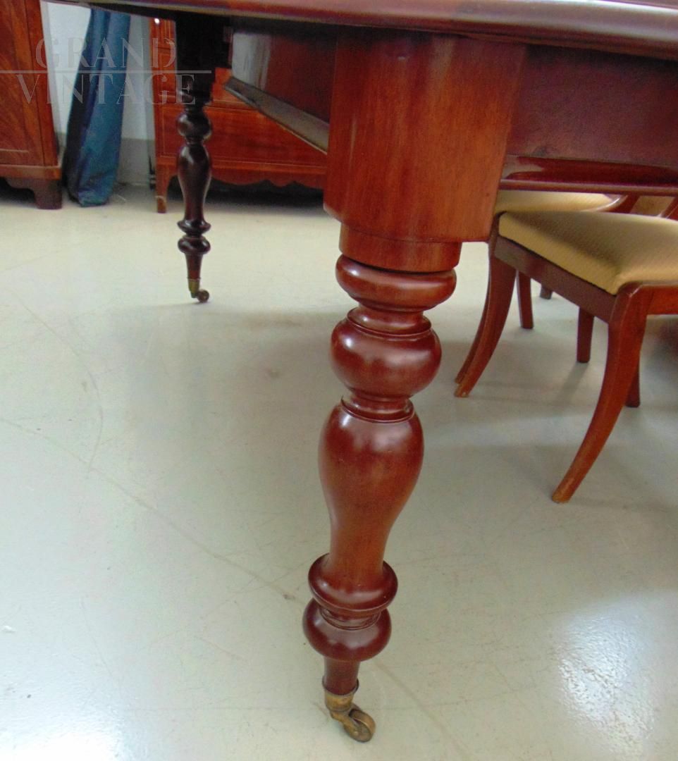 Tavolo da pranzo inglese antico allungabile a manovella, della fine dell'800, con struttura in mogano e gambe tornite con rotelle. In ottime condizioni.