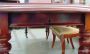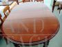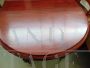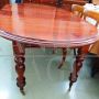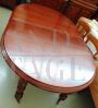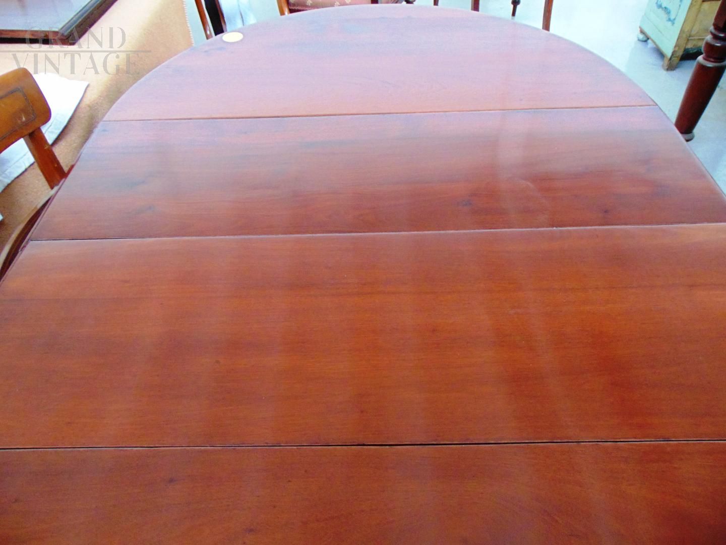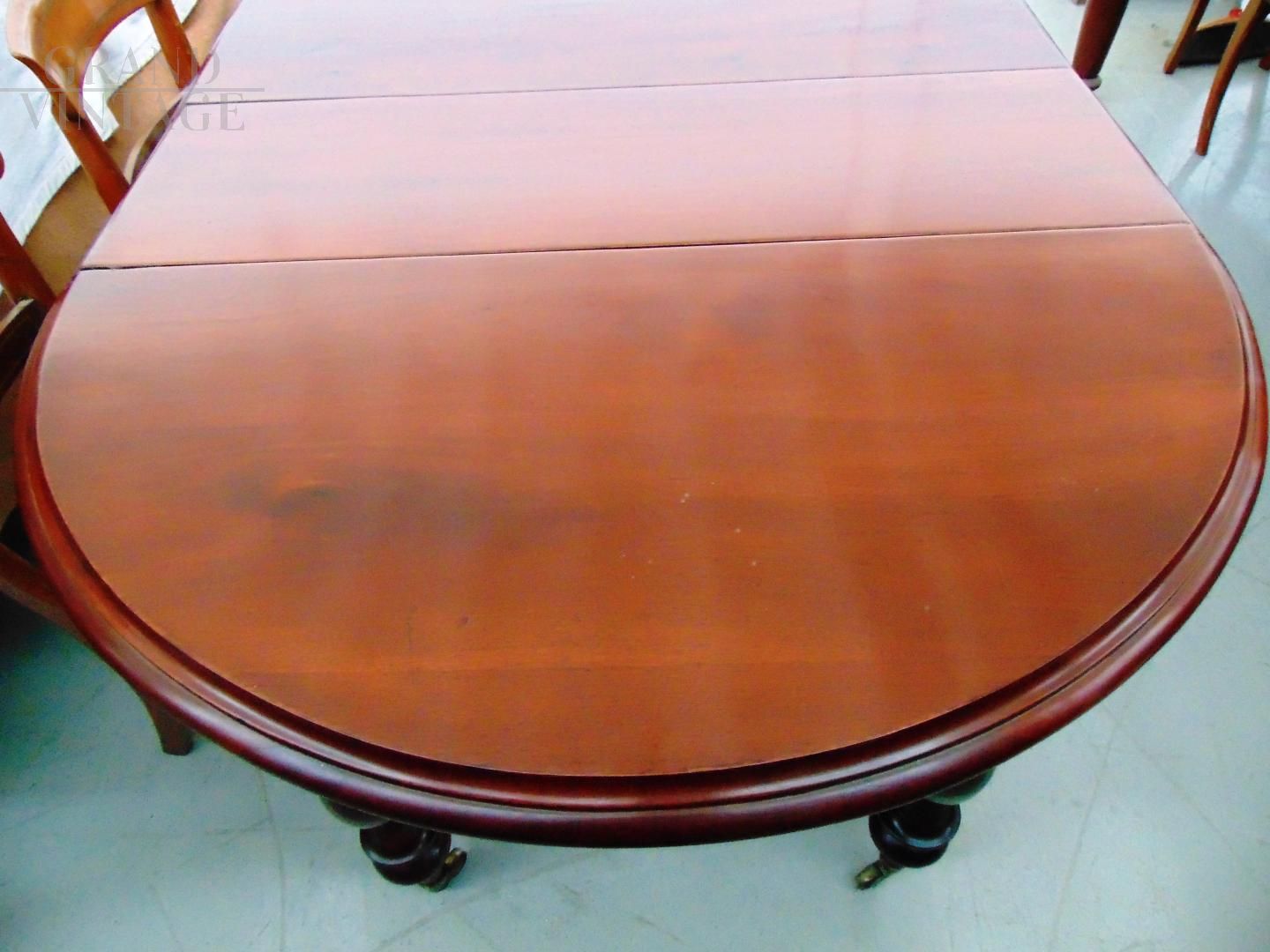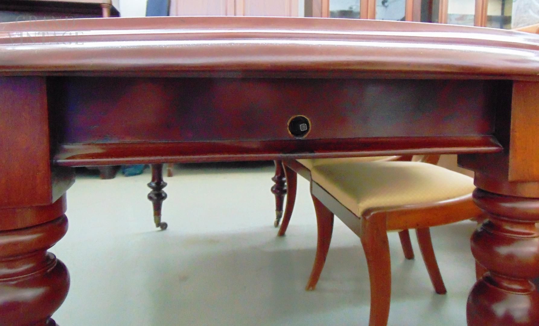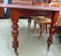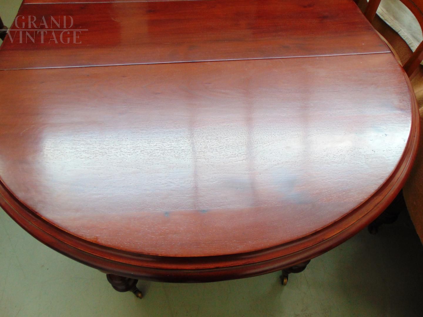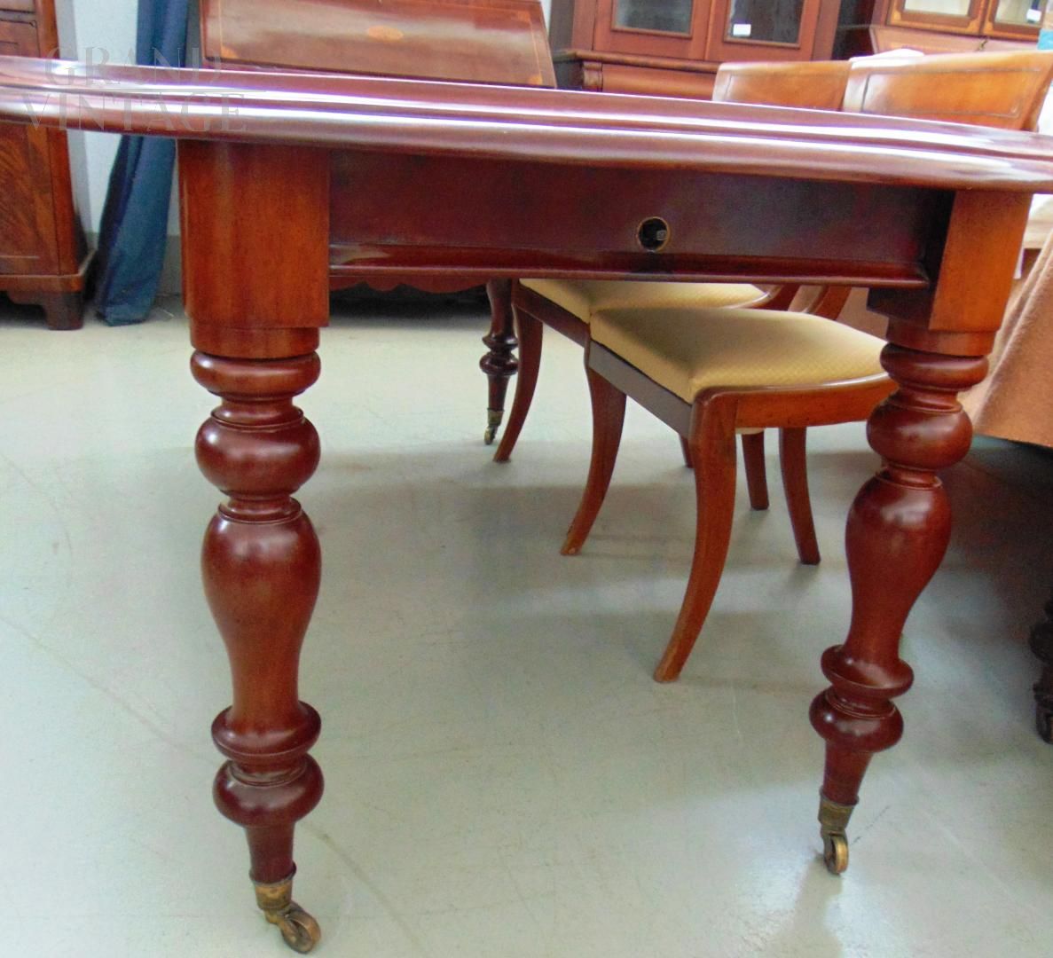 Tavolo da pranzo inglese antico allungabile a manovella, della fine dell'800, con struttura in mogano e gambe tornite con rotelle. In ottime condizioni.