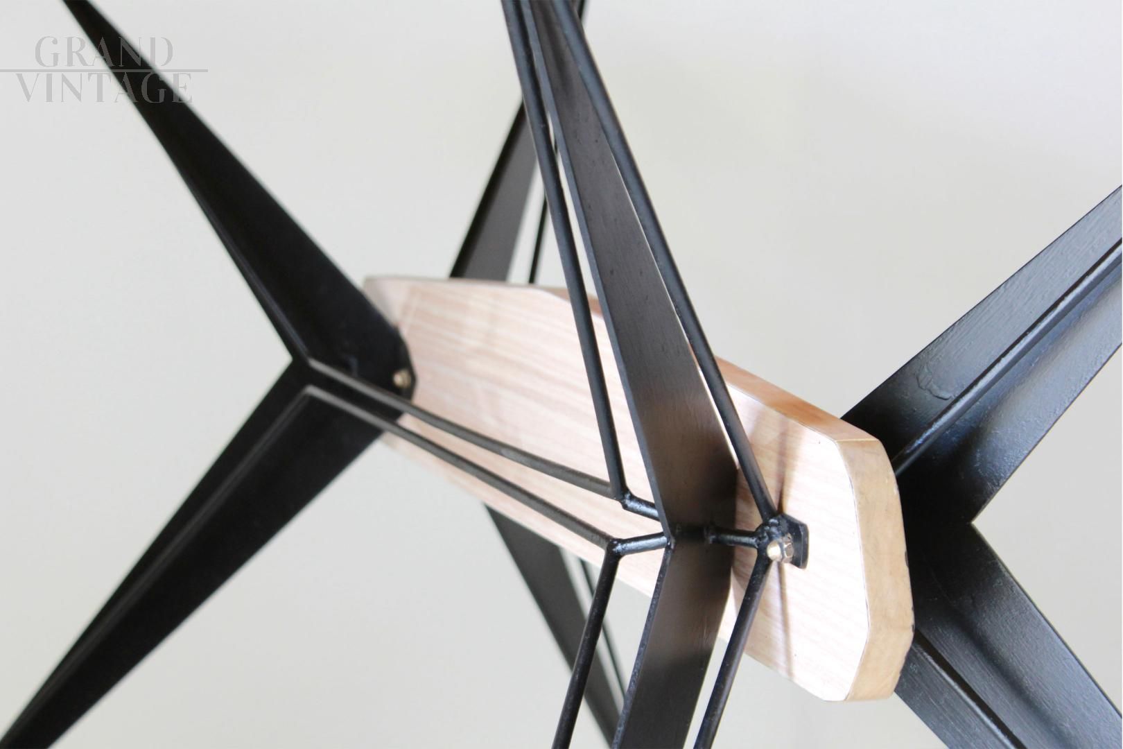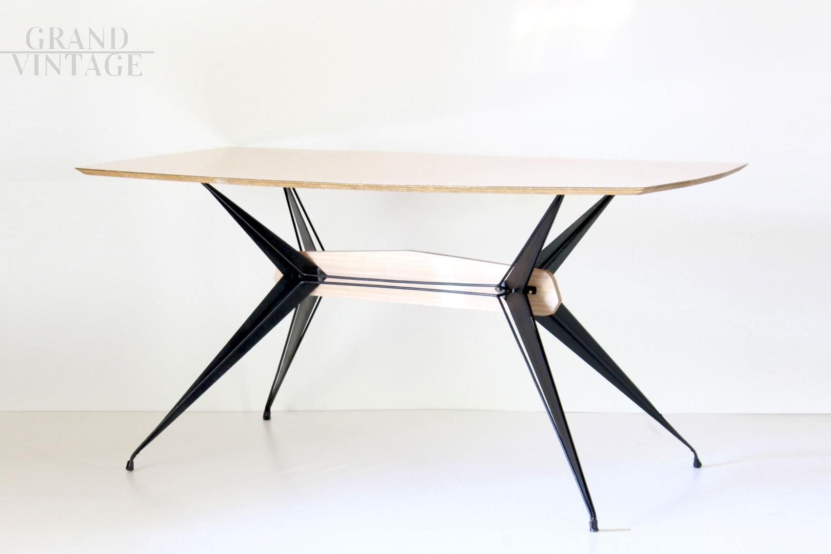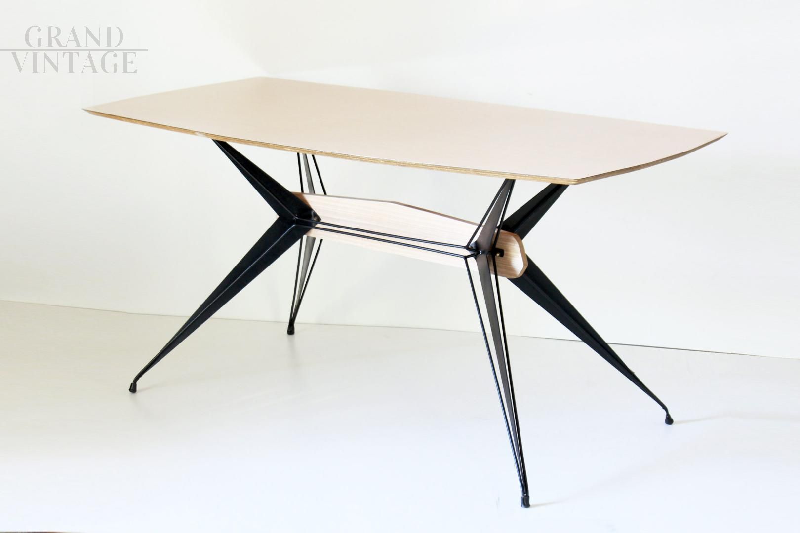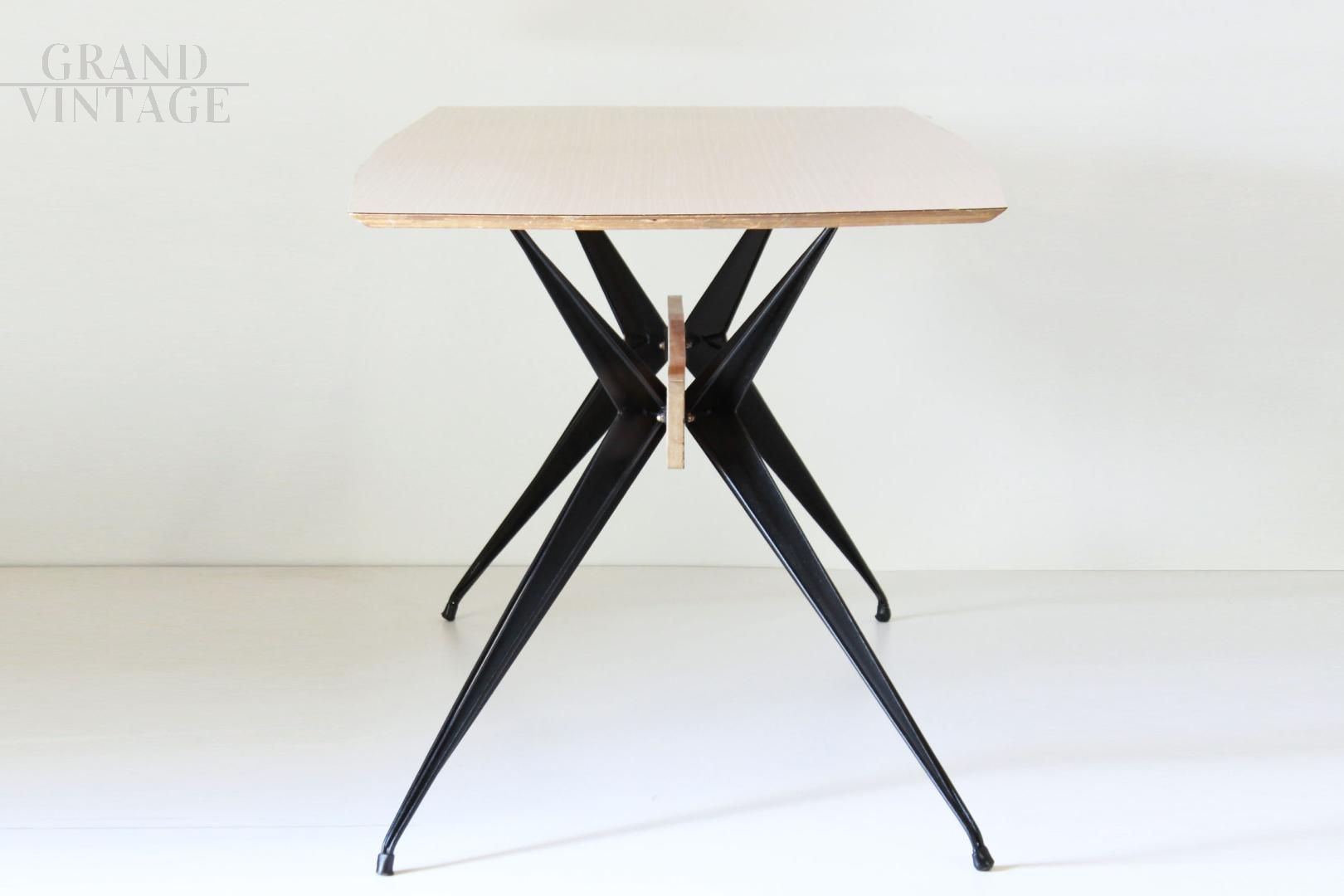Elegante tavolo in stile mid century degli anni '50, con struttura stilizzata in ferro color nero e piano in formica color beige. Ideale per sei persone. In condizioni molto buone, con piccoli segni del tempo sul piano.