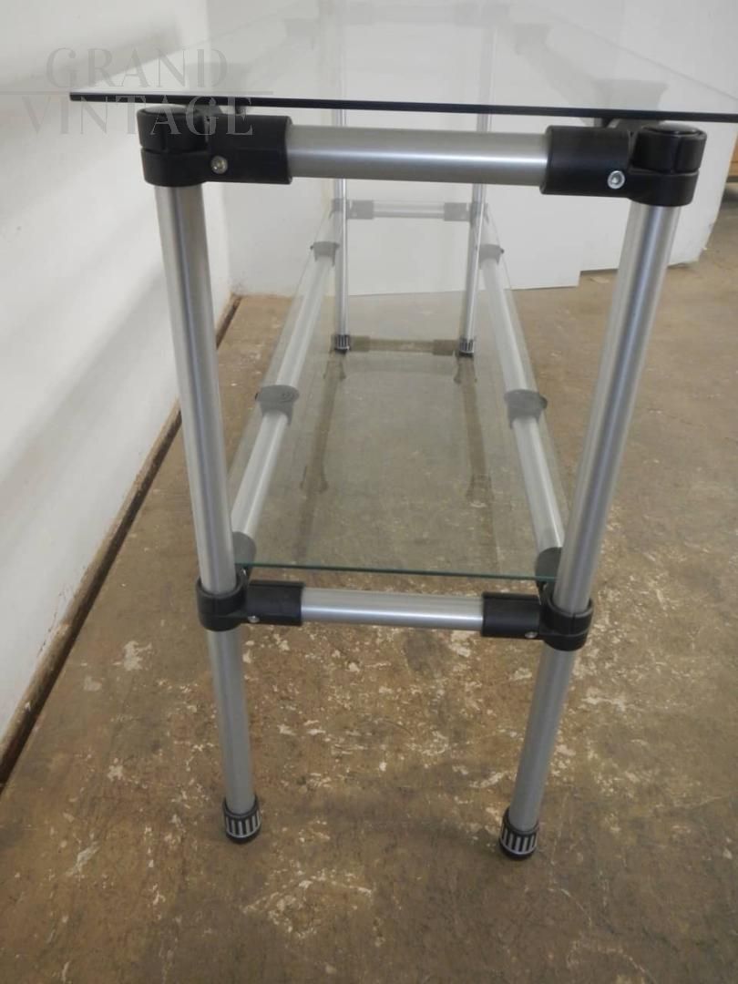 Tavolo o consolle da ufficio vintage Manfrotto con struttura in alluminio, due piani in vetro con spessore 5 mm e supporti in plastica nera. Lo spazio fra le mensole è di 44 cm. I piedini sono regolabili in altezza da 84 a 87 cm. Il vetro in alcuni punti presenta i segni del tempo.