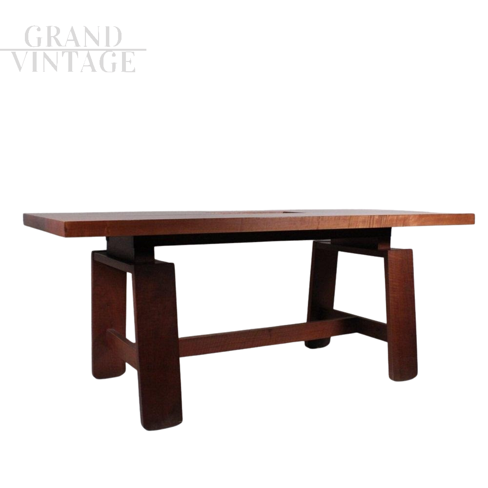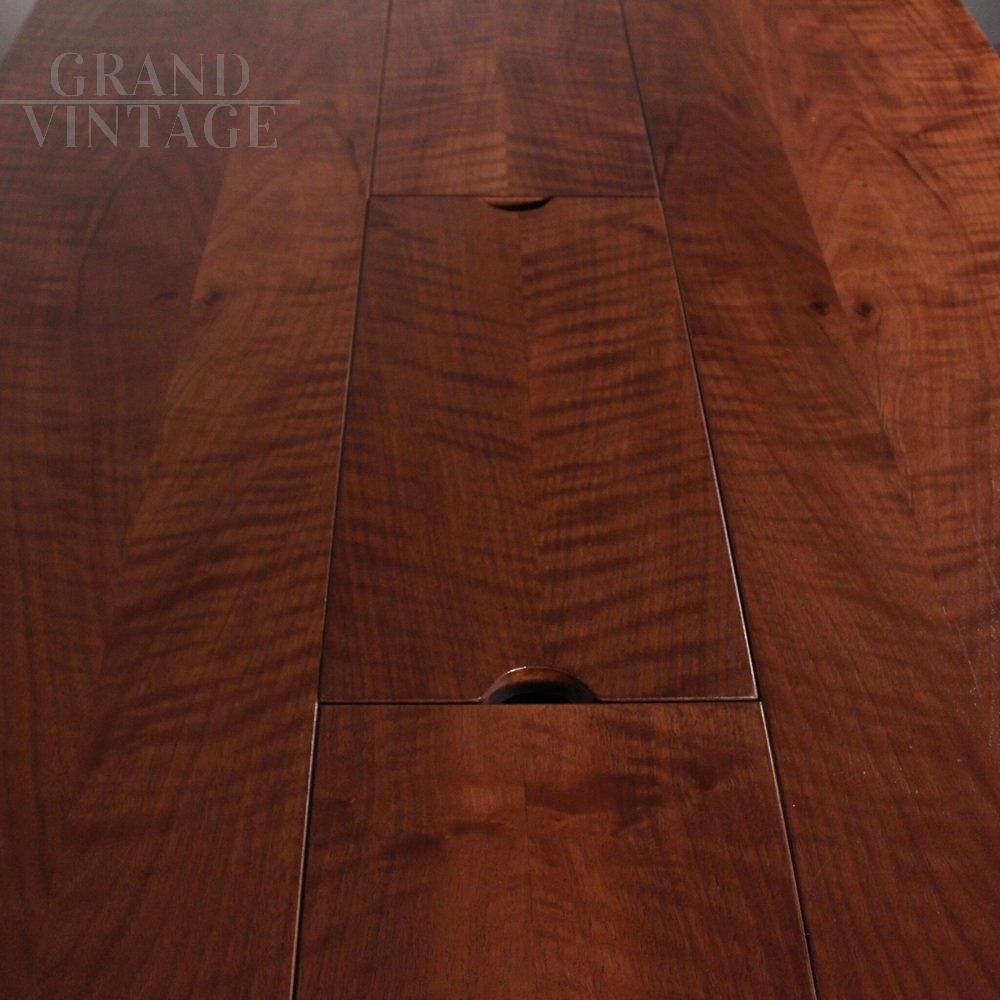 Tavolo da pranzo design di Silvio Coppola per Bernini di forma rettangolare, modello 611 disegnato nel 1964, con struttura e piano in legno di noce impiallacciato, scomparto mobile ed elementi contenitori in ceramica smaltata. Ottime condizioni.