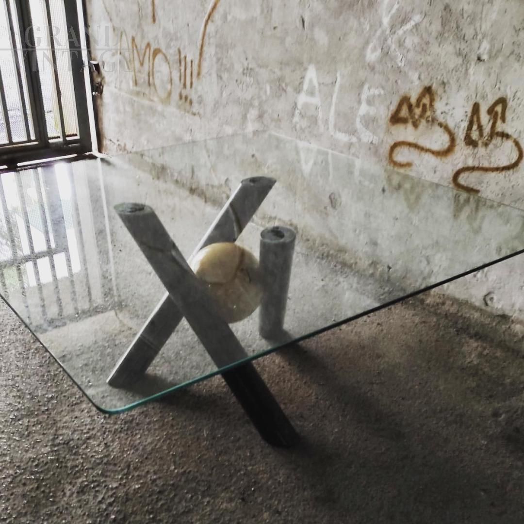 Tavolo da pranzo anni '70 con bellissima base in marmo nero marquina e sfera centrale in marmo giallo di Siena, piano in cristallo di spessore 2 cm.