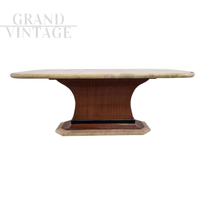 Tavolo rettangolare in stile art déco con piano in pergamena naturale con bordi stondati, base in noce con finiture in pergamena e bordo laccato nero.