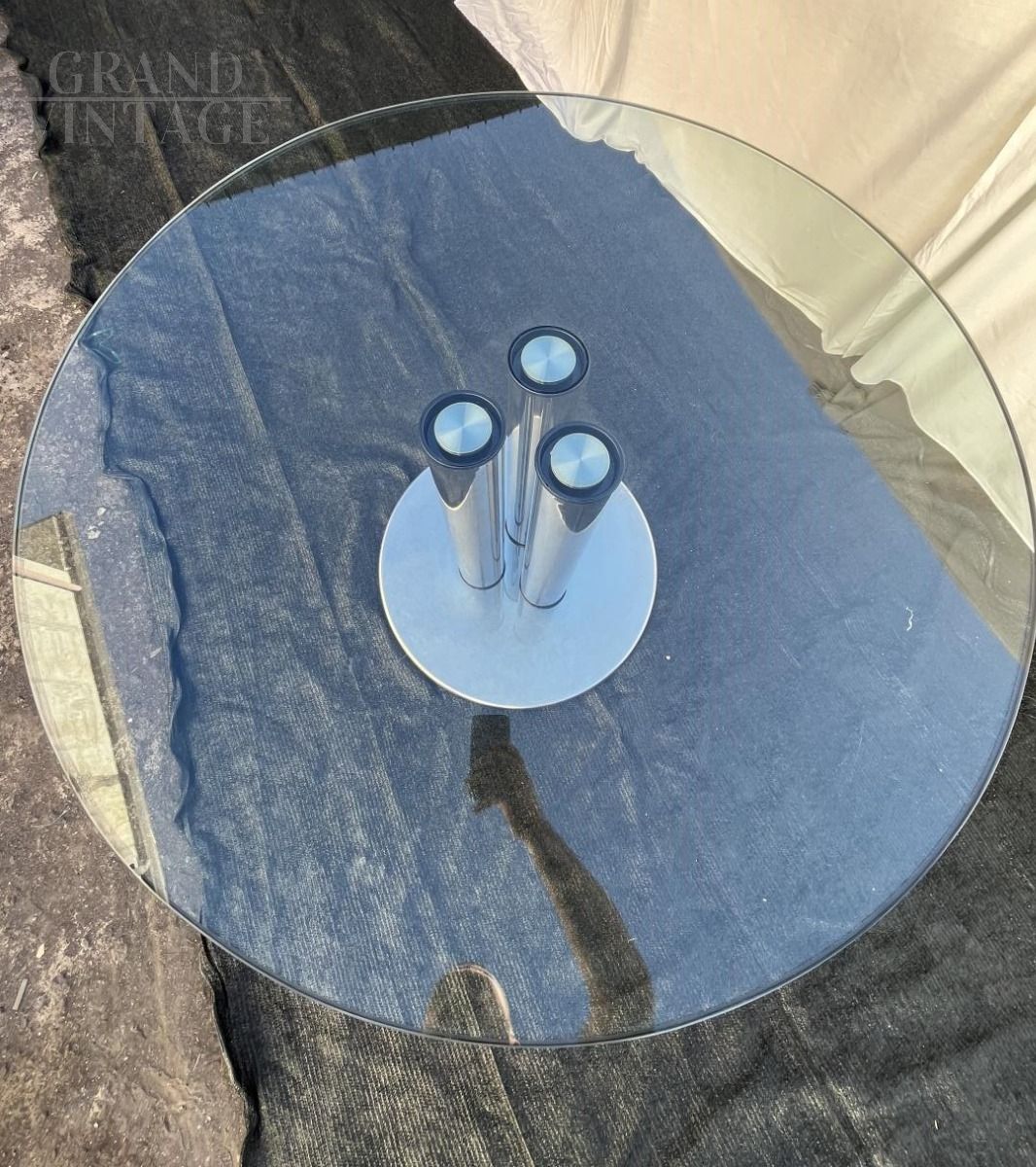 Tavolo design Marcuso di Marco Zanuso per Zanotta con piano rotondo in vetro e struttura in acciaio.