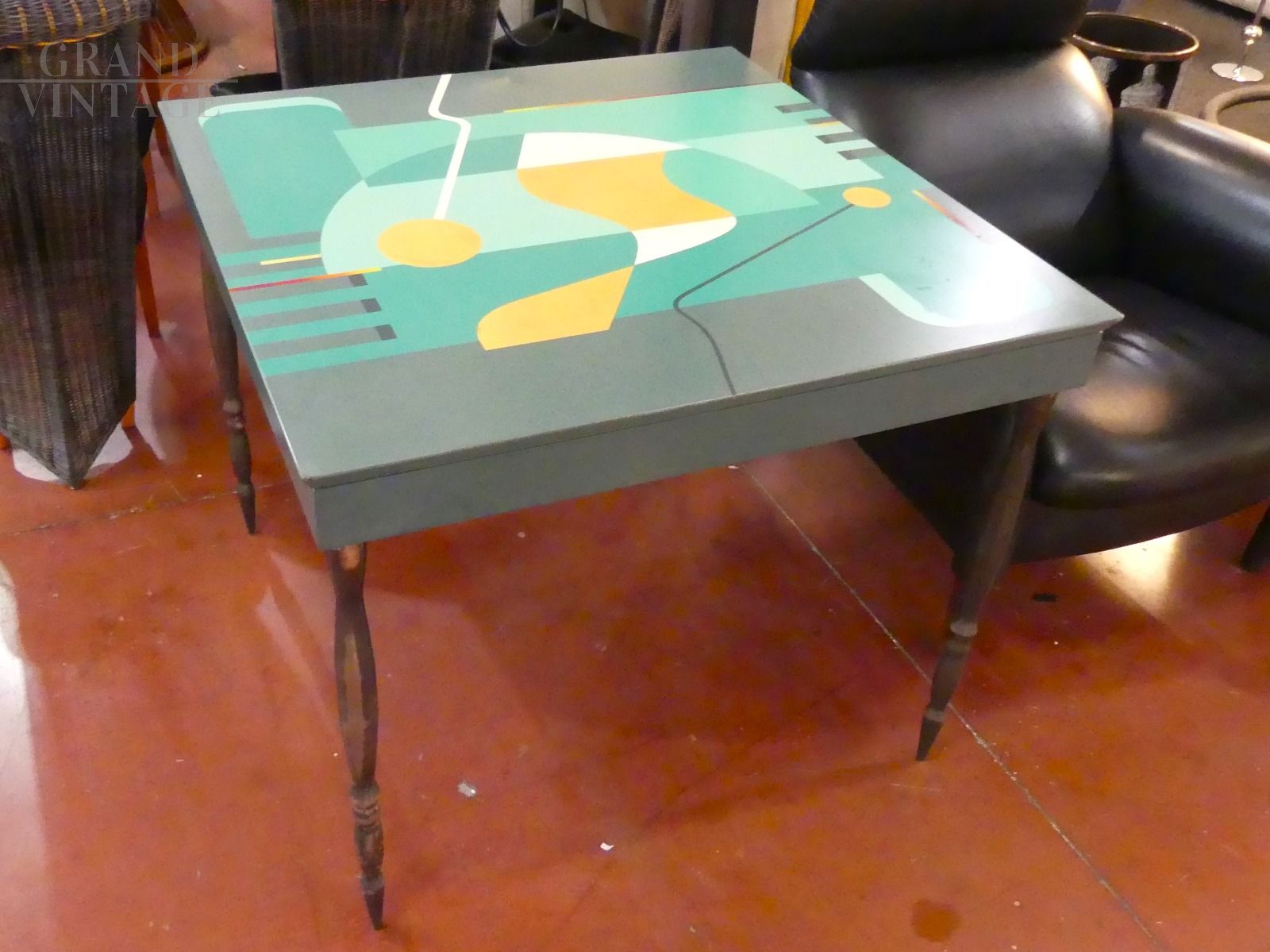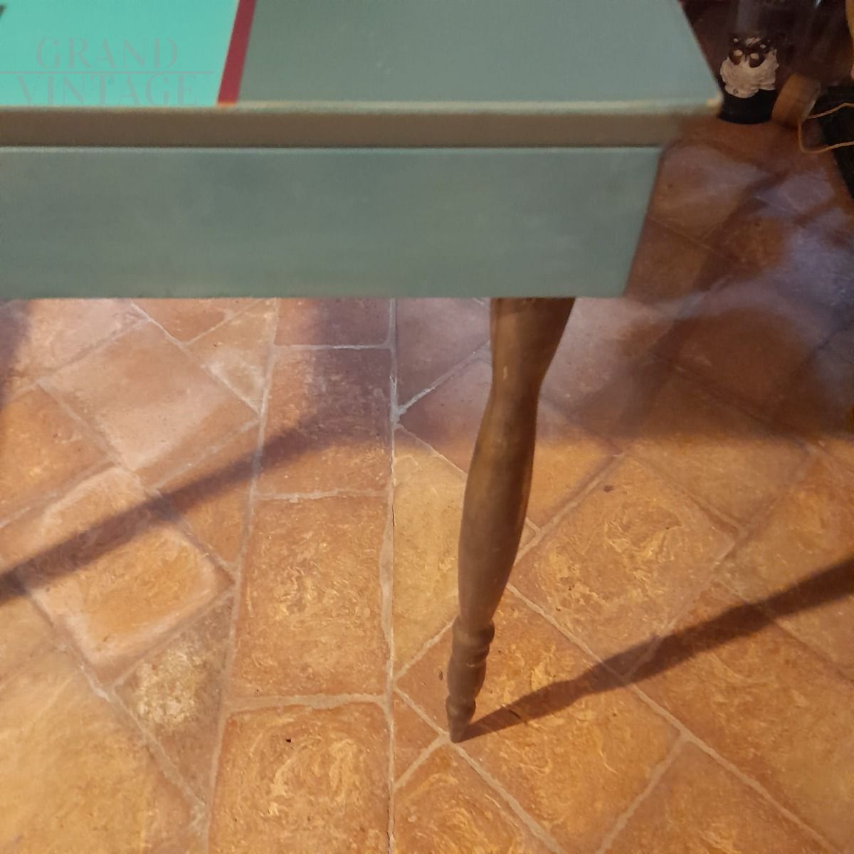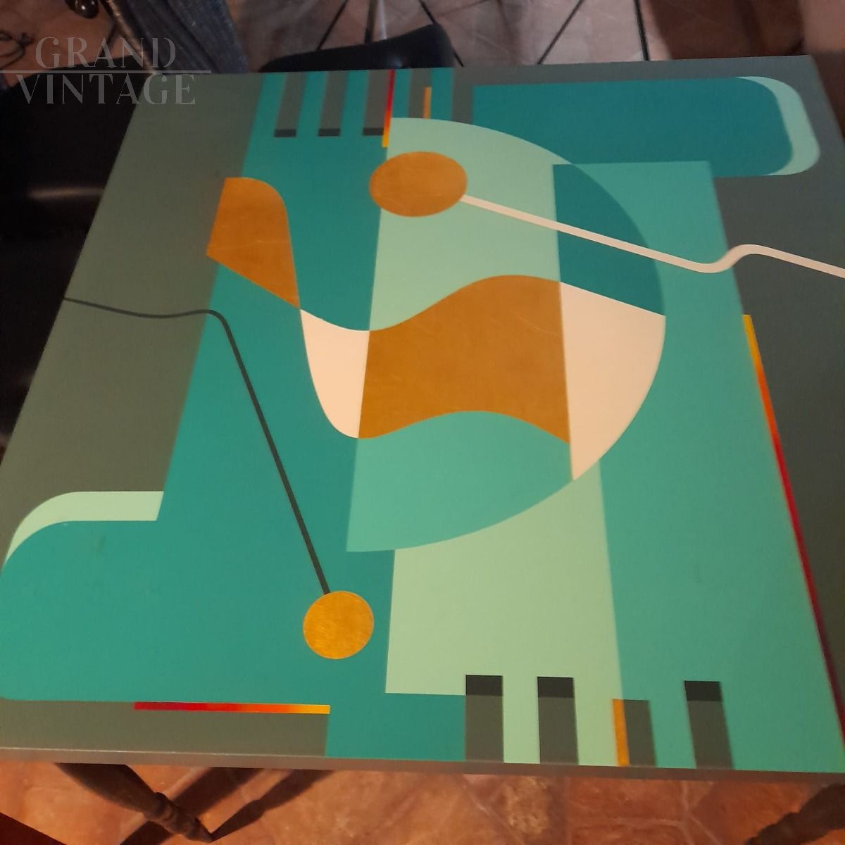 Tavolo d'appoggio design di Alessandro Mendini per manifattura Zabro, anni '80, con gambe in ferro ricoperte di fogli argento, ossidato dal tempo. Il piano è laccato in colori meravigliosi, presenta un difetto nella laccatura sul piano, visibile nelle foto. Presenza del marchio sotto il piano, a certificare l'originalità.