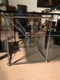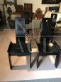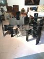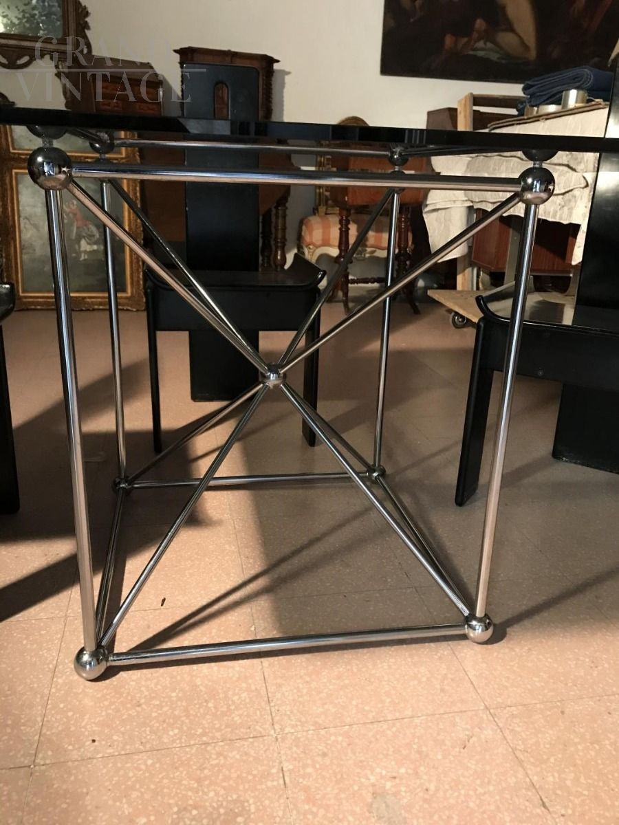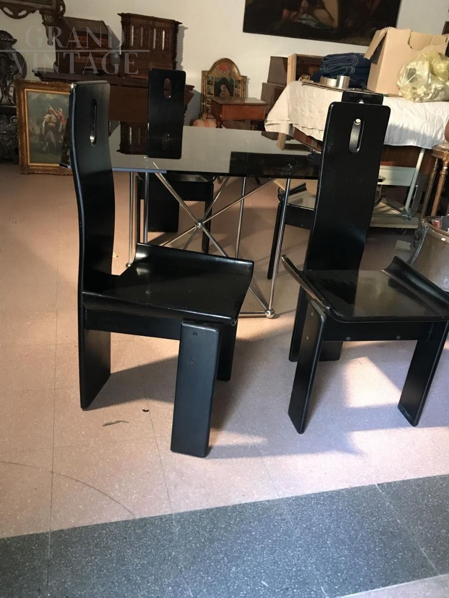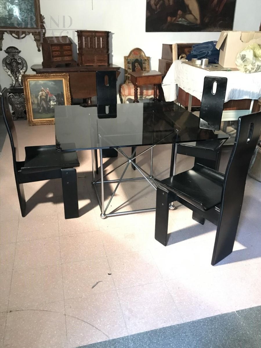 Set di tavolo e sedie modernariato anni '70, tavolo con piano in vetro fumé e struttura in metallo cromato, sedie design in legno laccato nero.