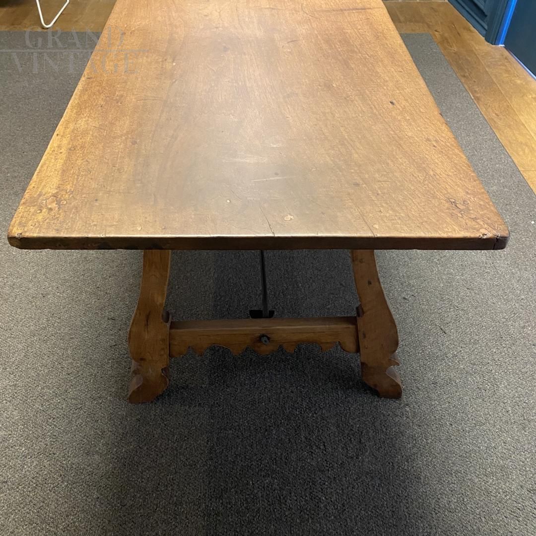 Tavolo fratino del ‘600 lombardo in noce. Il piano è ricavato da un’unica tavola di noce e presenta una bellissima patina. Le gambe a lira presentano una sagomatura elegante e sono sorrette e vincolate al piano tramite un sostegno in ferro battuto anch'esso originale del pezzo. Restaurato di recente da un restauratore esperto.