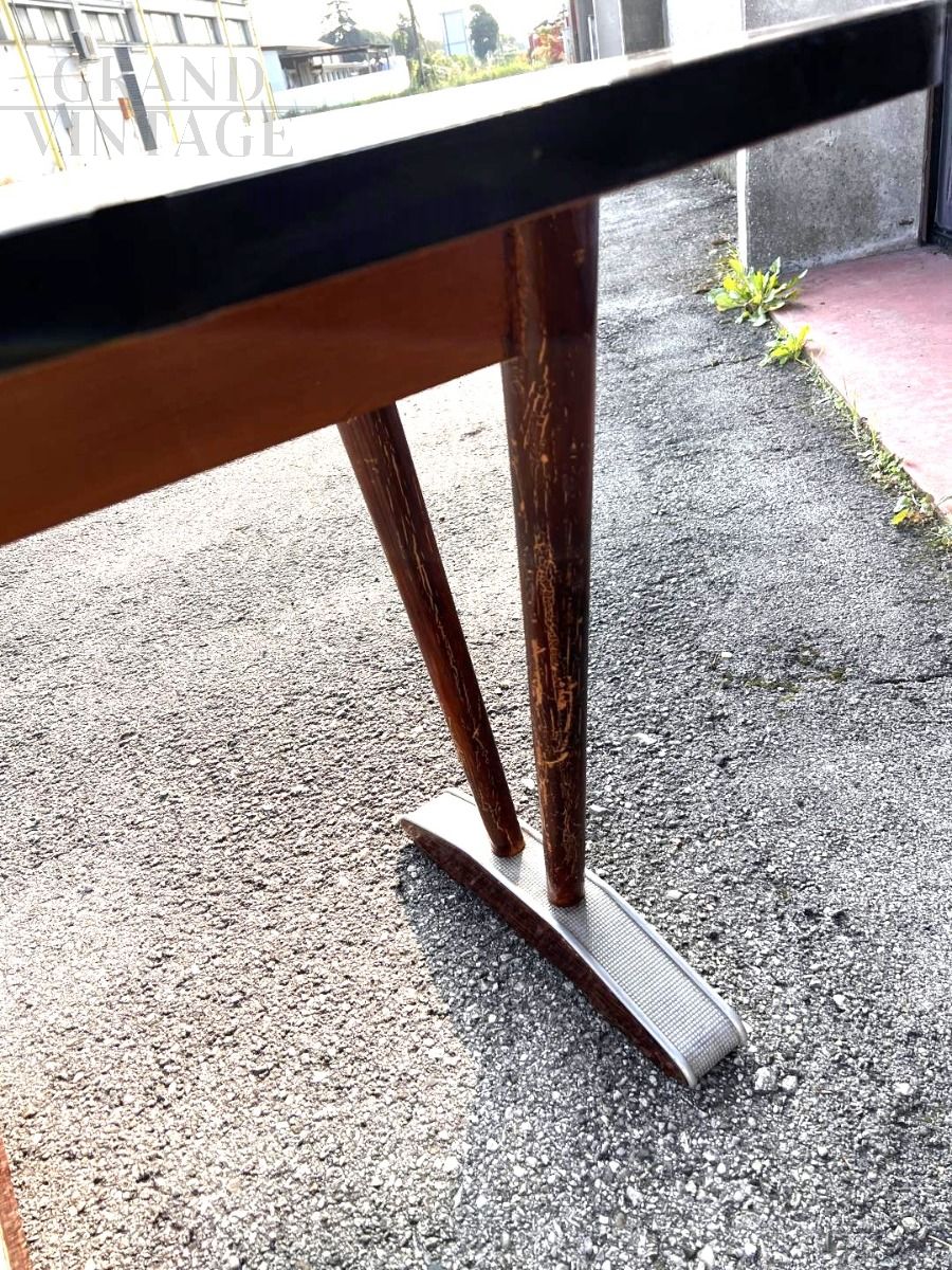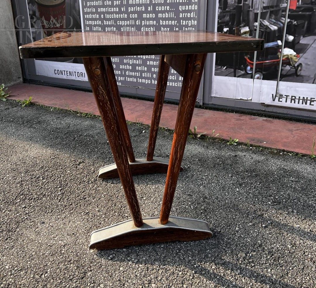 Tavolo quadrato vintage in legno con gambe interne, dal design molto particolare, recentemente restaurato e verniciato opaco.