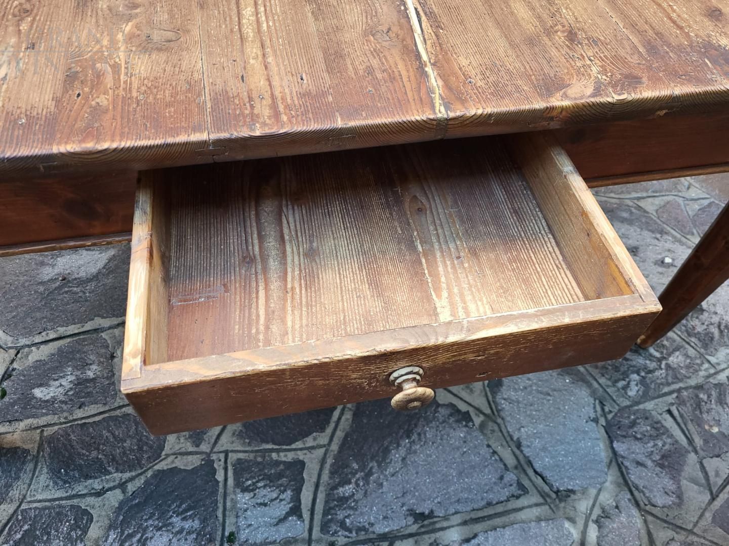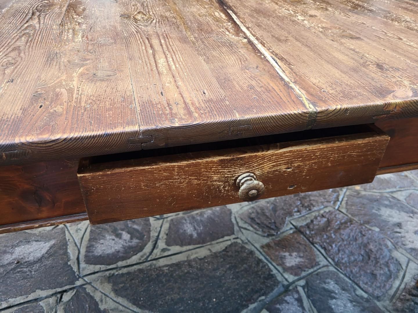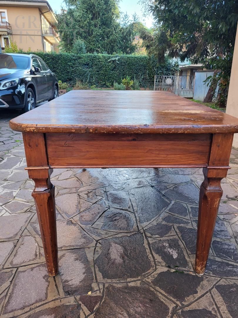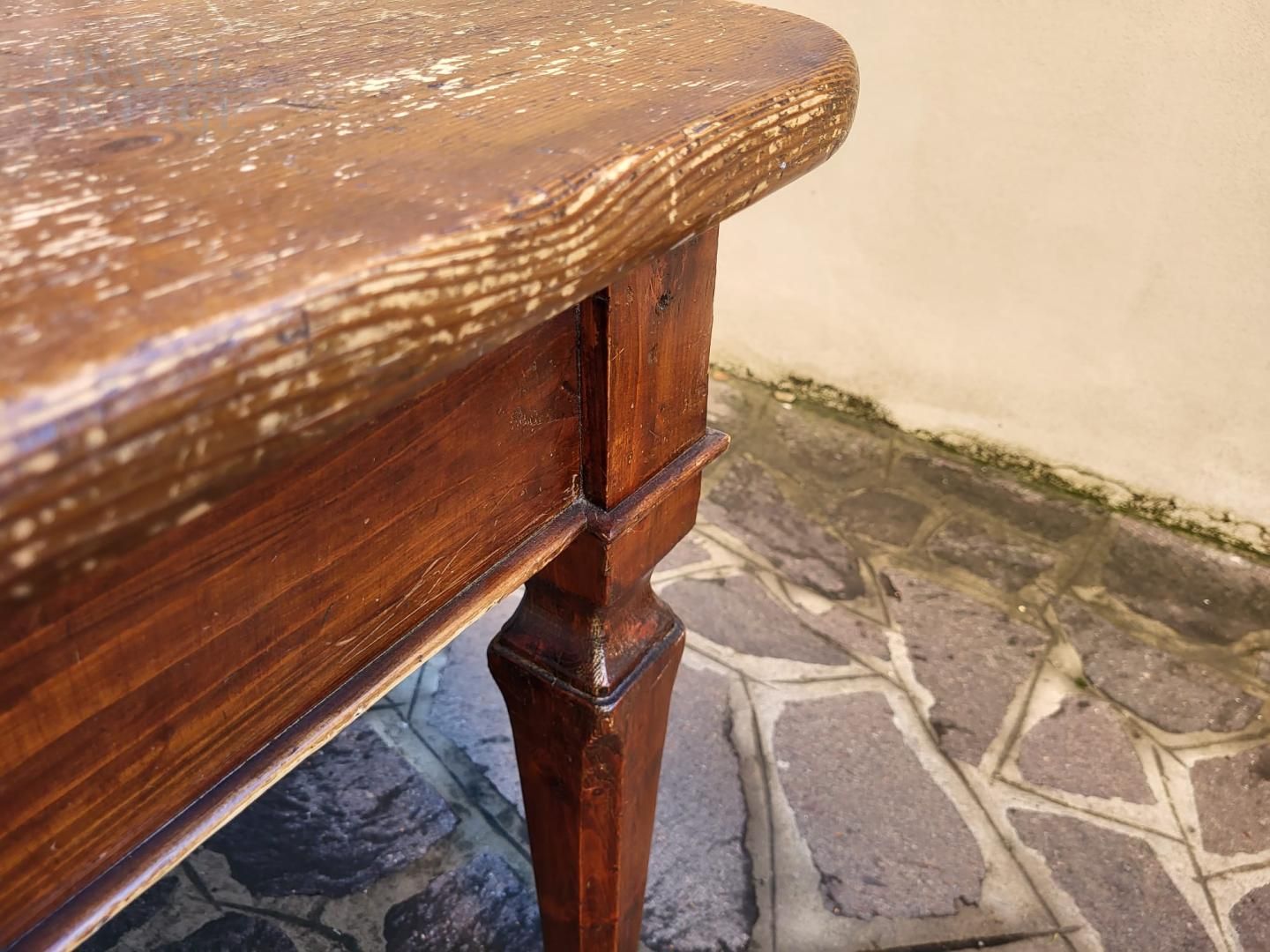 Tavolo in stile Luigi XVI con piedi tronco piramidali strozzati, completo di cassetto. Materiale : legno di pino. Presenta i naturali segni del tempo.