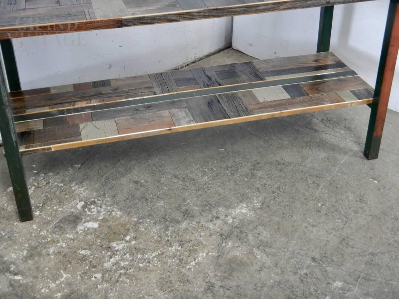 Scaffale tavolo industriale banco da officina in metallo verde rifinito con 2 mensole in legno di abete di spessore cm 3 lavorate a patchwork con tonalità di marrone. La distanza tra le mensole è di cm 39. In buone condizioni, restaurato e trattato con vernice da legno.