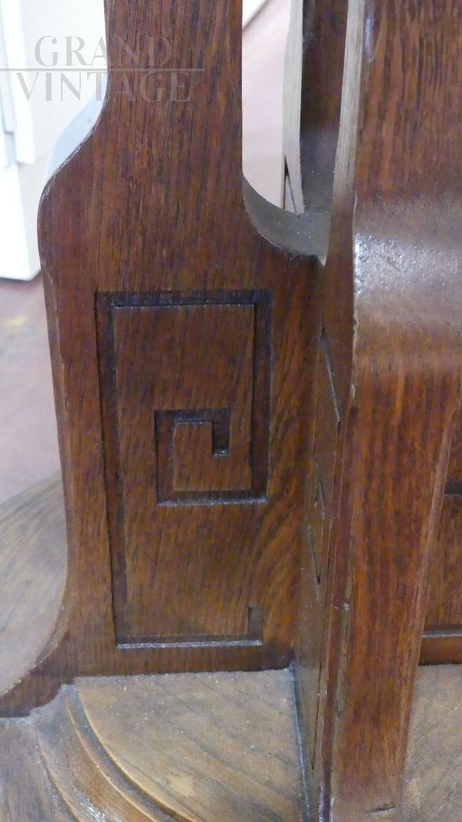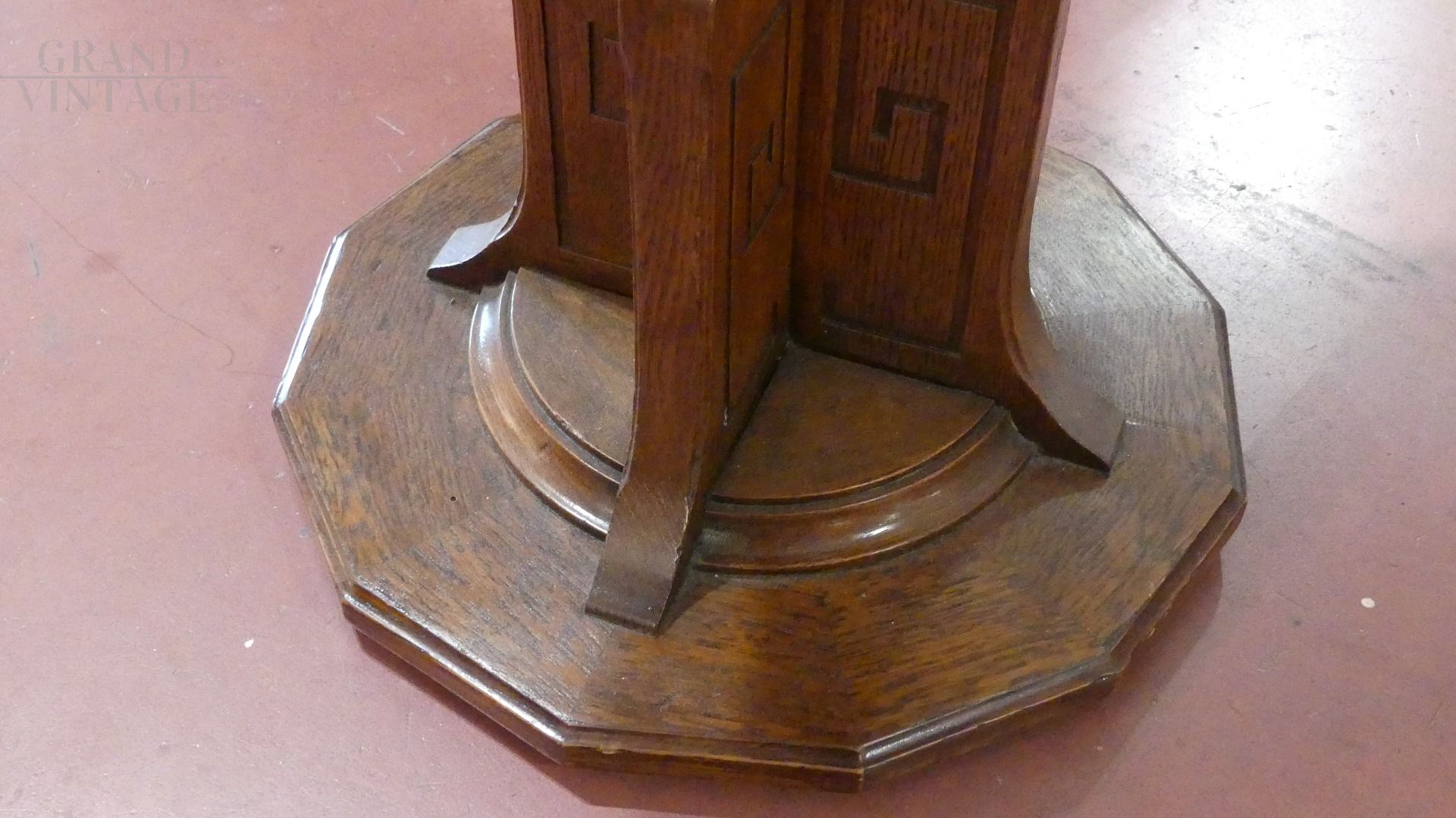 Tavolino tavolo inglese dei primi del '900 appartenente al movimento Arts & Crafts prodotto in legno di rovere con dettagli geometrici e piano dodecagonale.