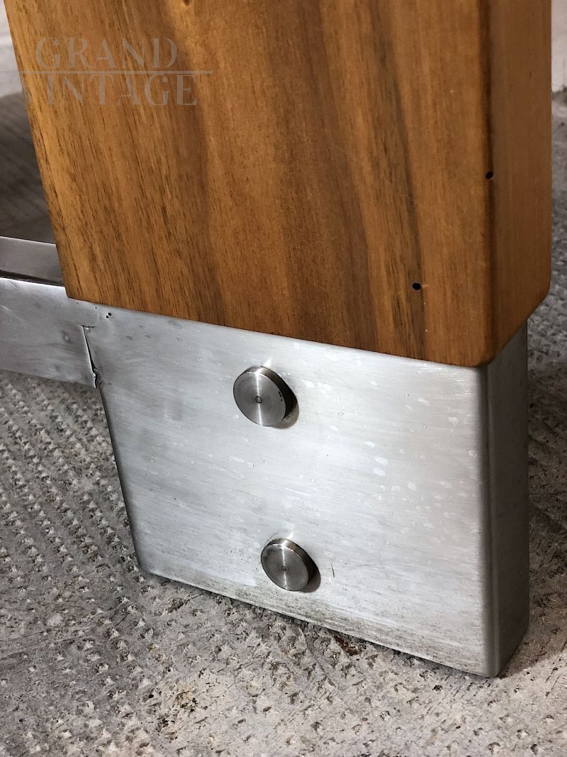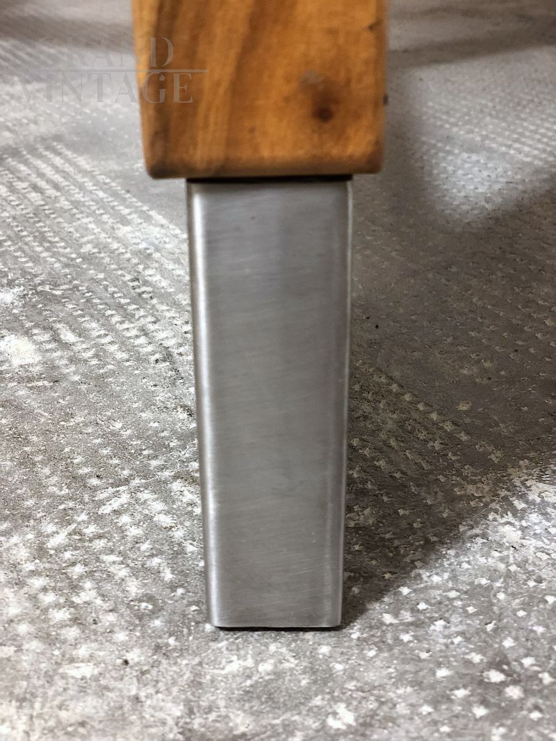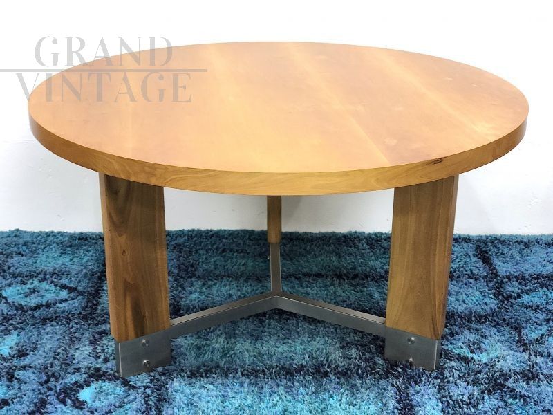 Tavolo mid-century rotondo con tre gambe in legno e acciaio