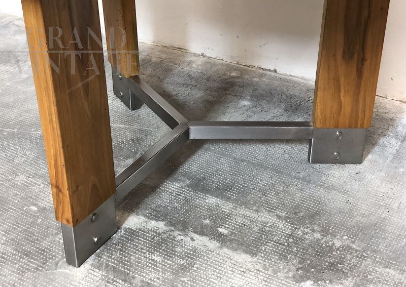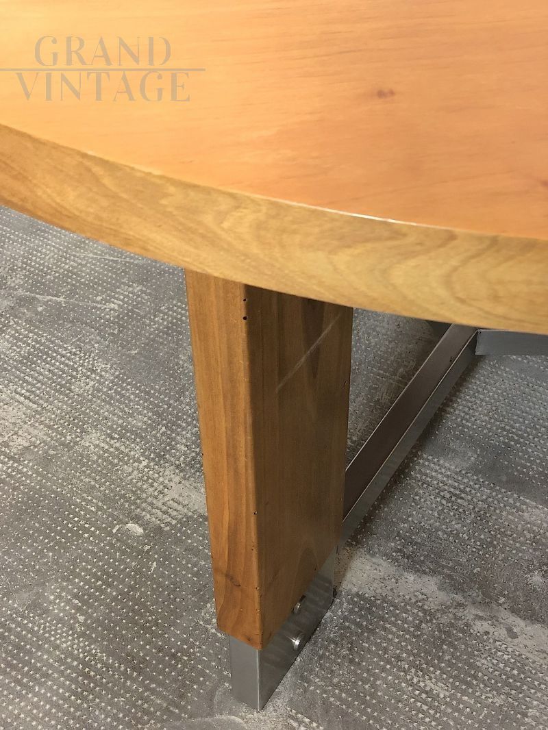 Tavolo da pranzo rotondo degli anni '60, modernariato di manifattura Italiana, realizzato in legno massello con piano in faggio e incrocio delle gambe in acciaio satinato che riporta allo stile Space Age. In condizioni perfette.
