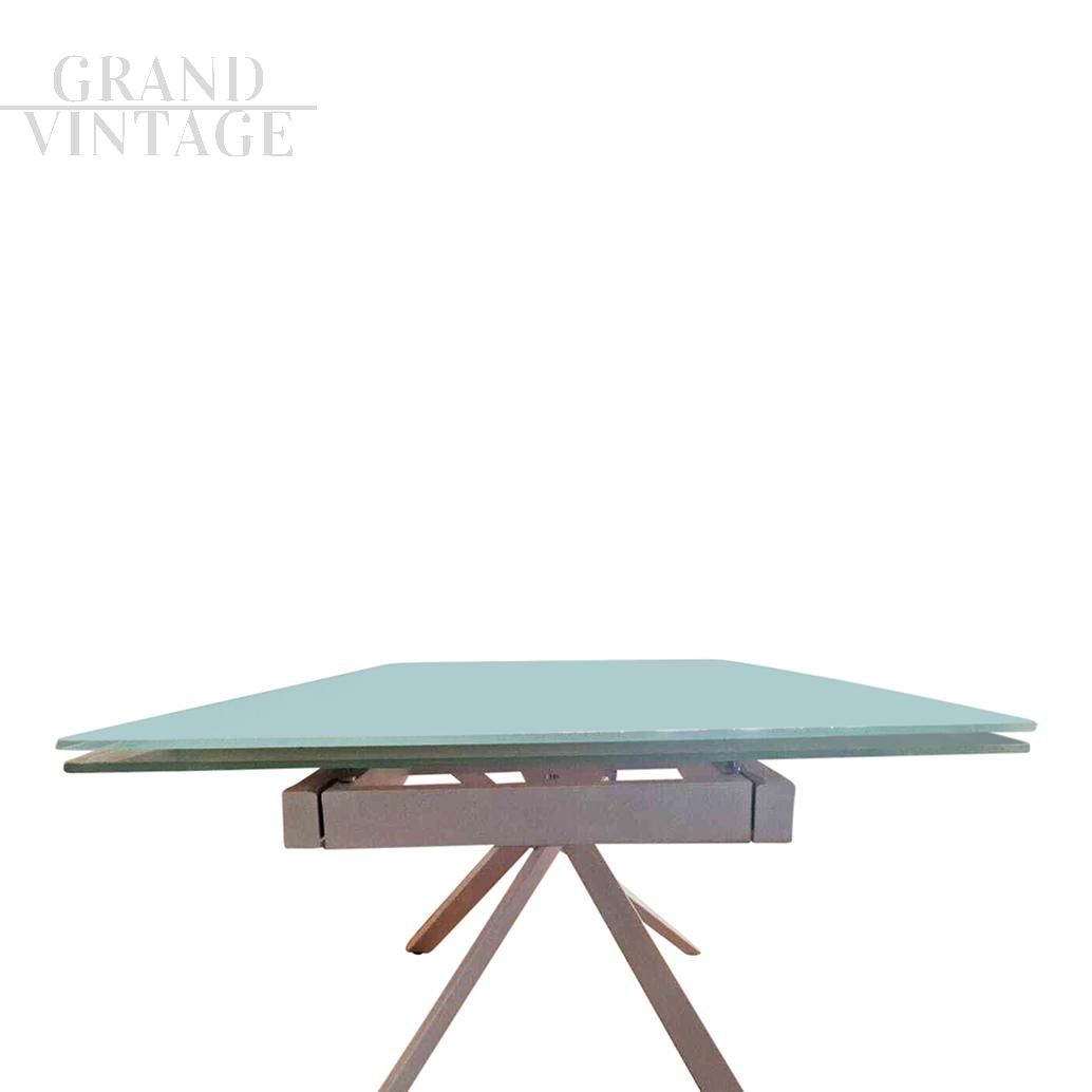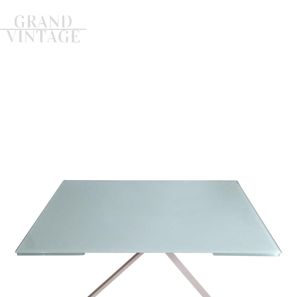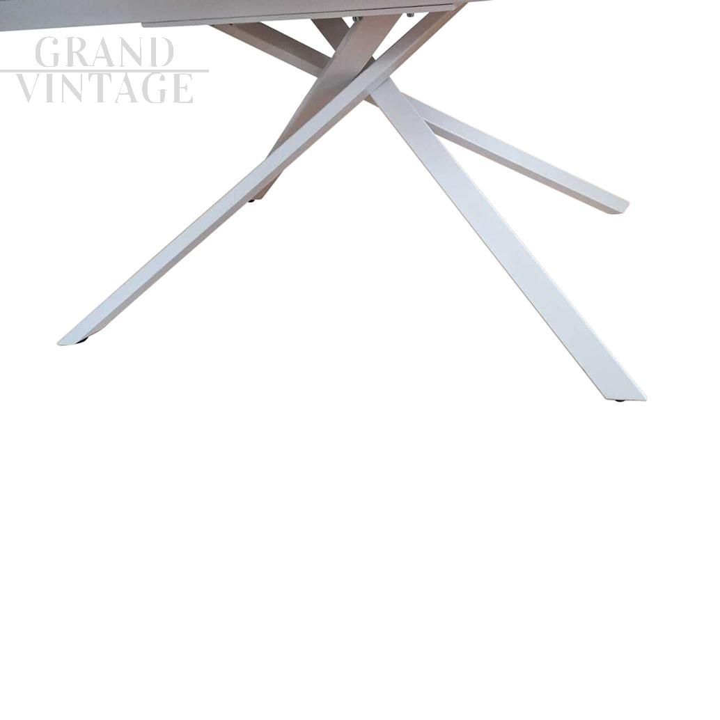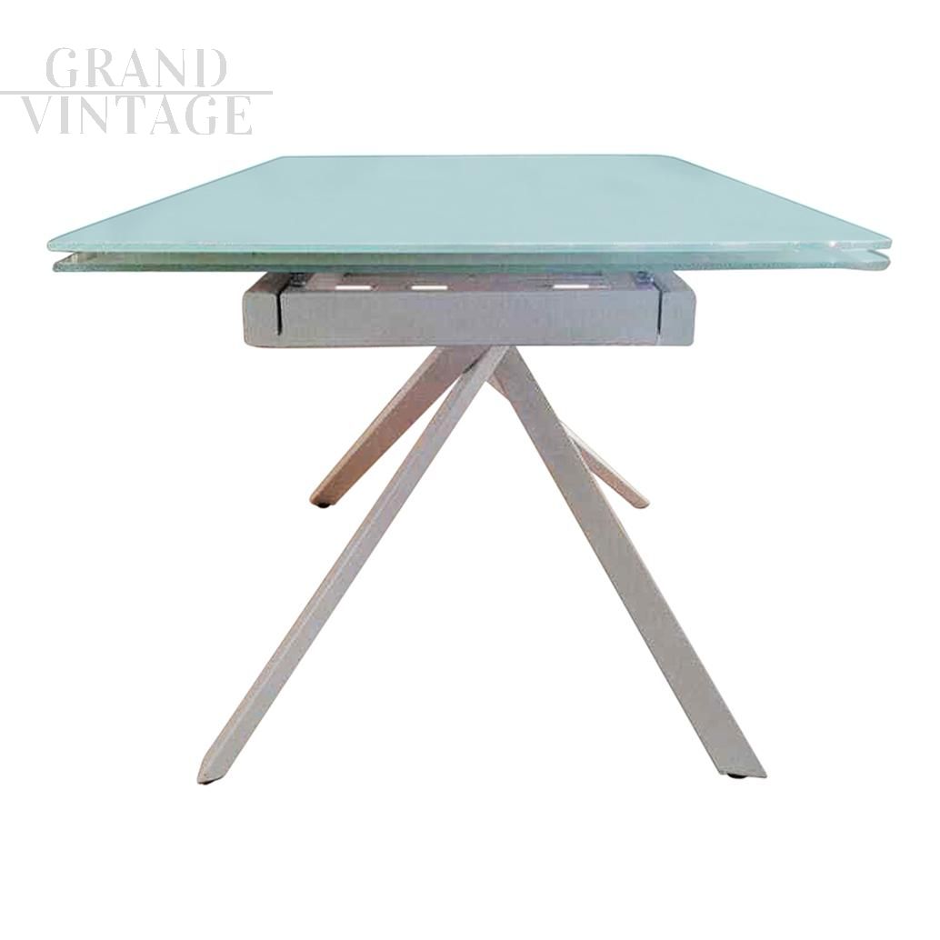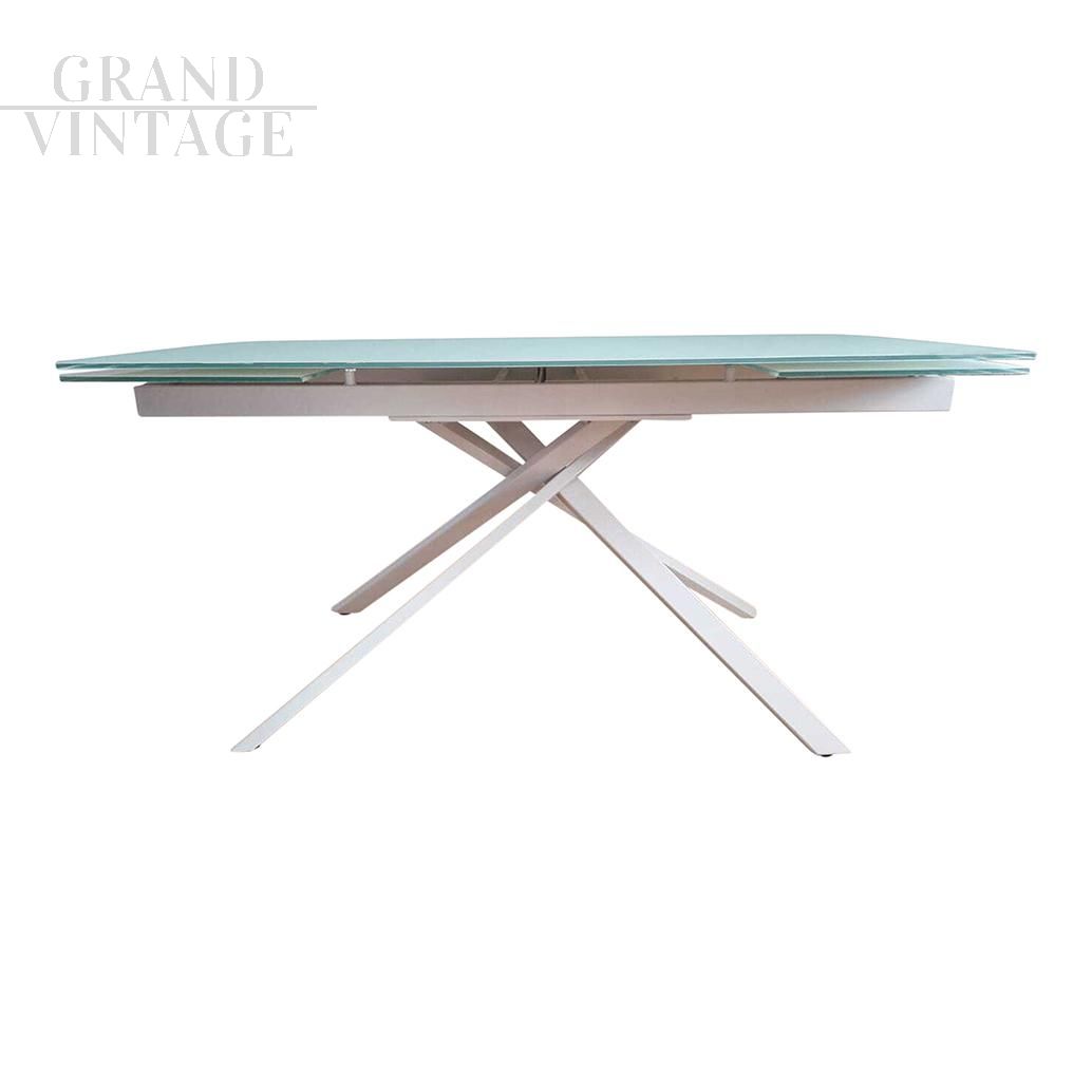 Il tavolo da pranzo allungabile è un pezzo ideale per creare ambienti moderni e contemporanei. Si caratterizza per l'originale disegno sulla struttura, composta da 4 piedini in metallo torniti sovrapposti asimmetricamente, laccati bianco opaco. Il piano è in vetro temperato di spessore 10 mm con finitura bianca, con pratico sistema di allunghe con apertura ad anta, composto da 2 allunghe, una per lato, larghe rispettivamente 40 cm, che rende questo tavolo un mobile ideale per ricevere ospiti.
