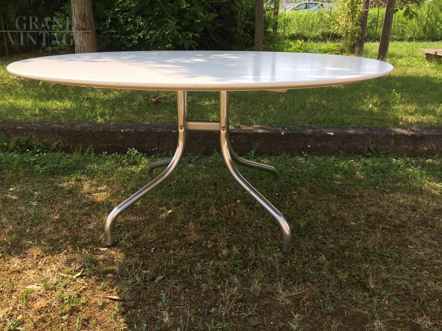 Tavolo da pranzo ovale Shine di Vico Magistretti per De Padova con piano di 130 x 150 cm in laminato bianco e base in alluminio naturale. Il tavolo è in ottime condizioni, è stato usato in un negozio di design come supporto in vetrina.