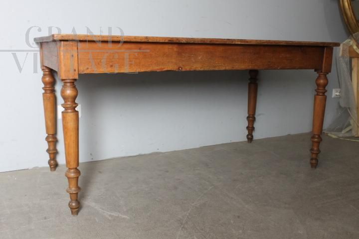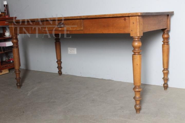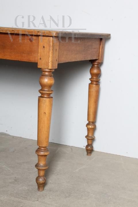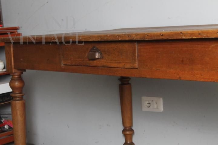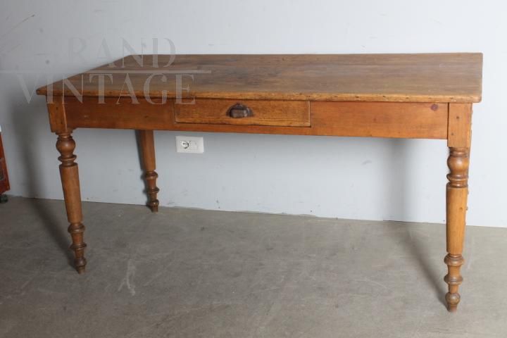 Tavolo provenzale antico in legno massello di abete con cassetto centrale e belle gambe tornite, realizzato alla fine dell'800, restaurato lasciando la sua patina del tempo con finitura a cera d'api, presenta i naturali segni del tempo e dell'utilizzo.