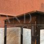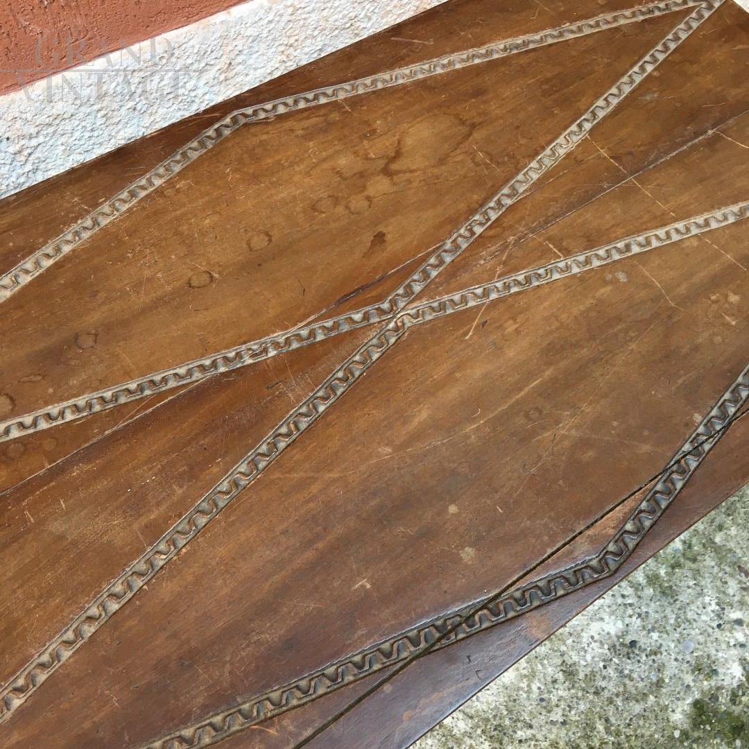 Tavolo rettangolare rustico italiano con piano in noce e gambe in faggio. Motivi decorativi intarsiati sulla parte superiore e gambe a sezione quadrata, condizioni vintage.