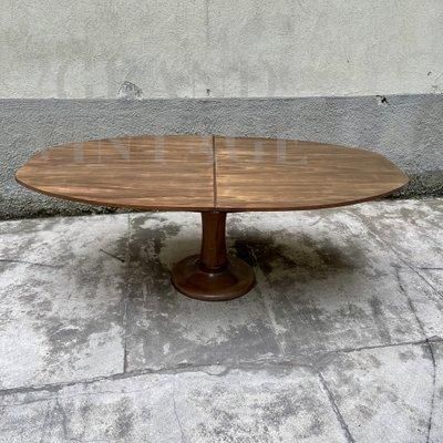 Tavolo design mid-century allungabile, con piano circolare a pioggia e stelo centrale e piede in legno massello. Il tavolo è dotato di un'allunga che trasforma il piano del tavolo in un ovale per far stare comodamente 8 persone.
