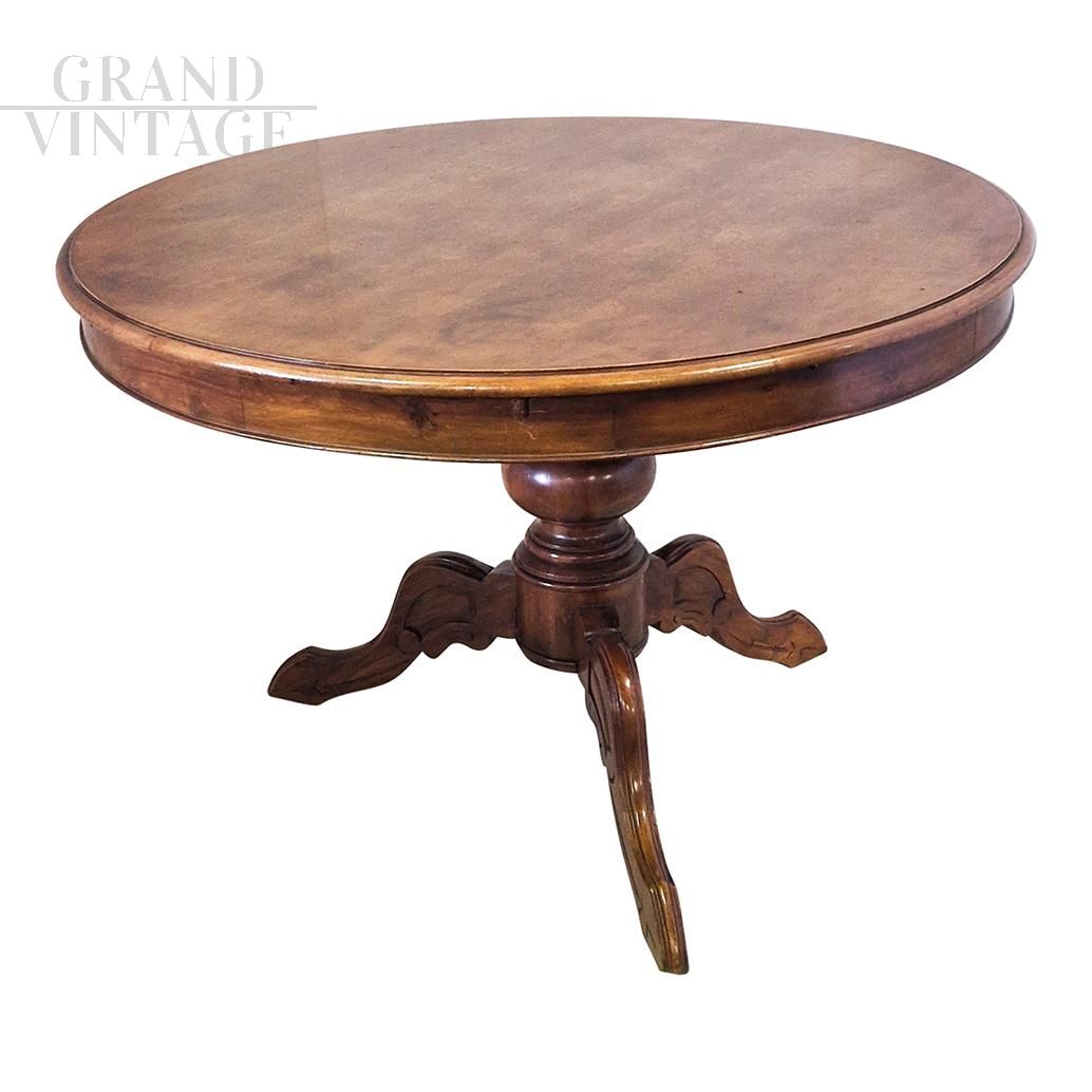 Tavolo classico rotondo in legno di noce retto da balaustro tornito terminante con gambe mosse.