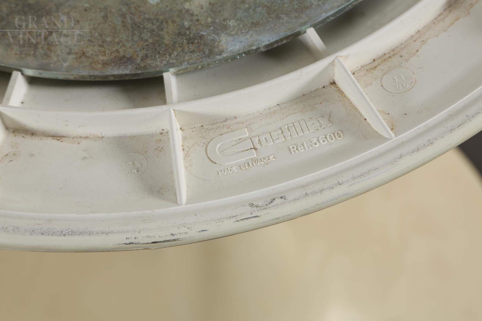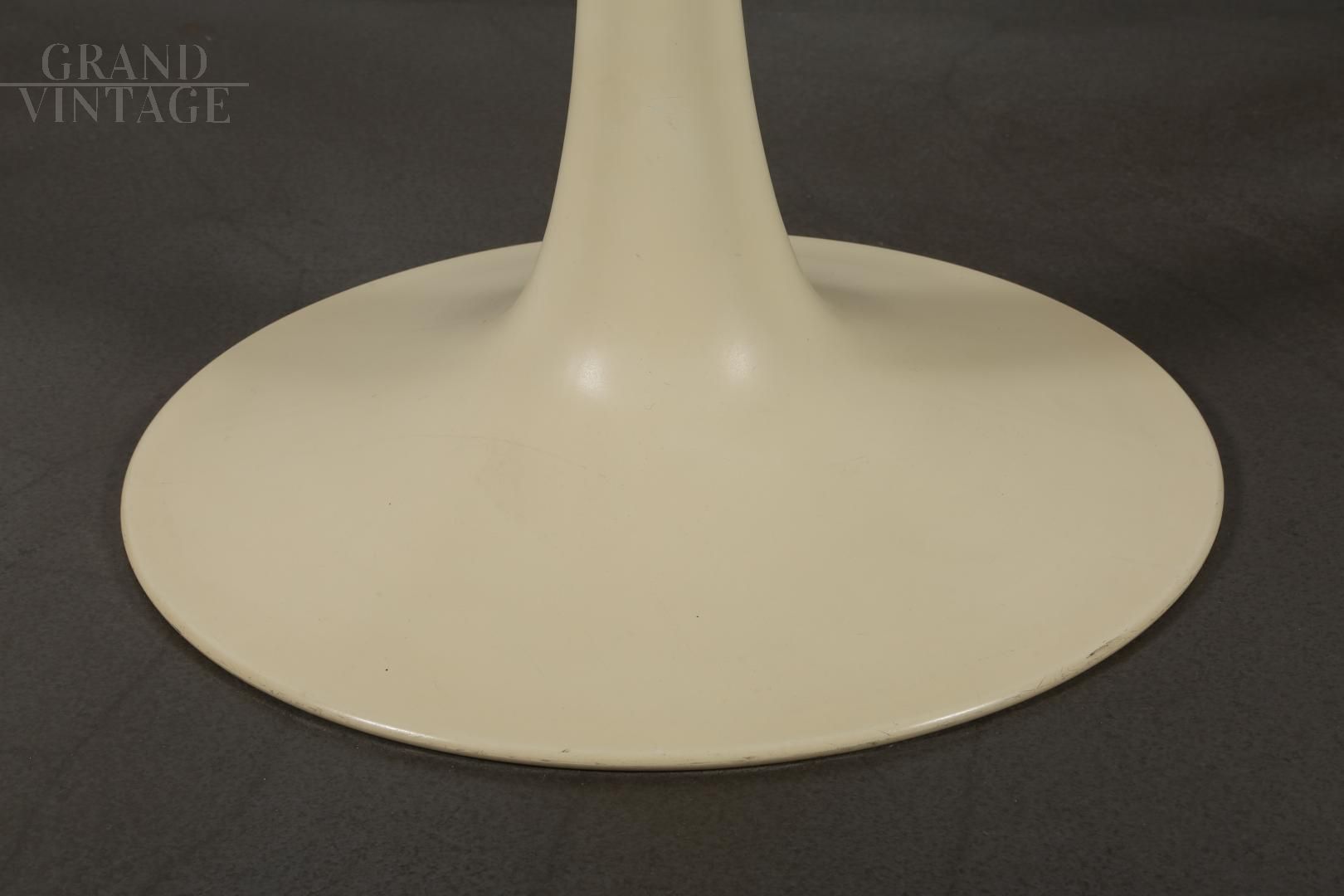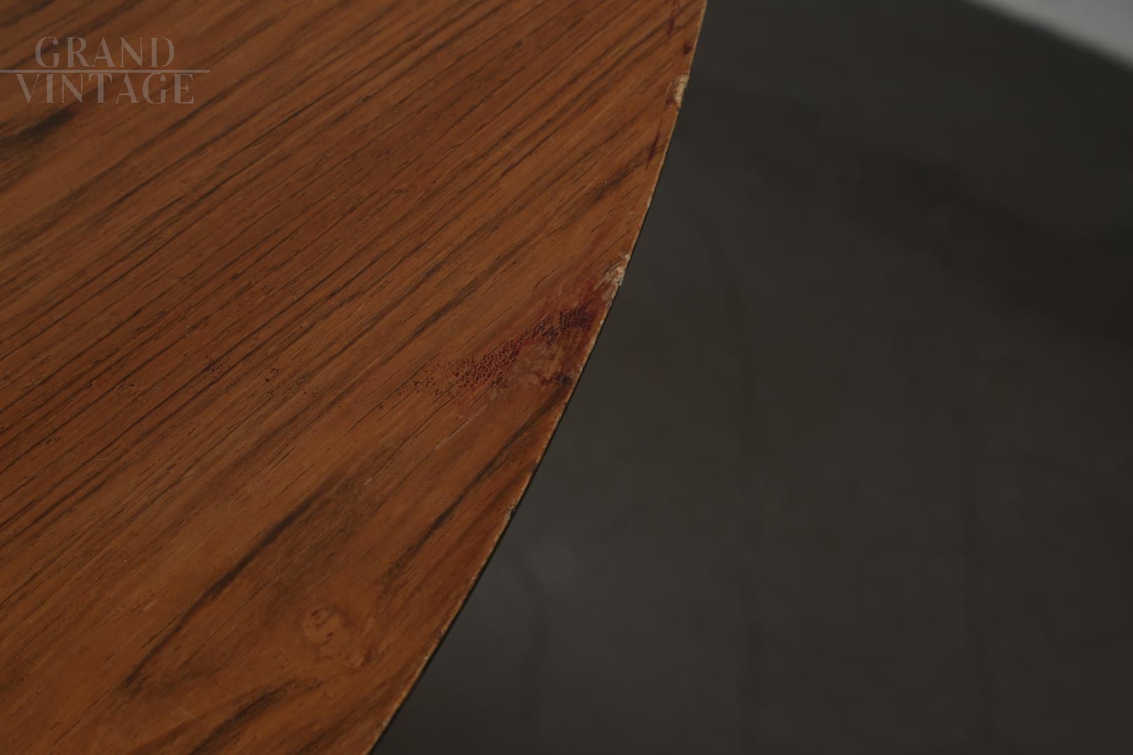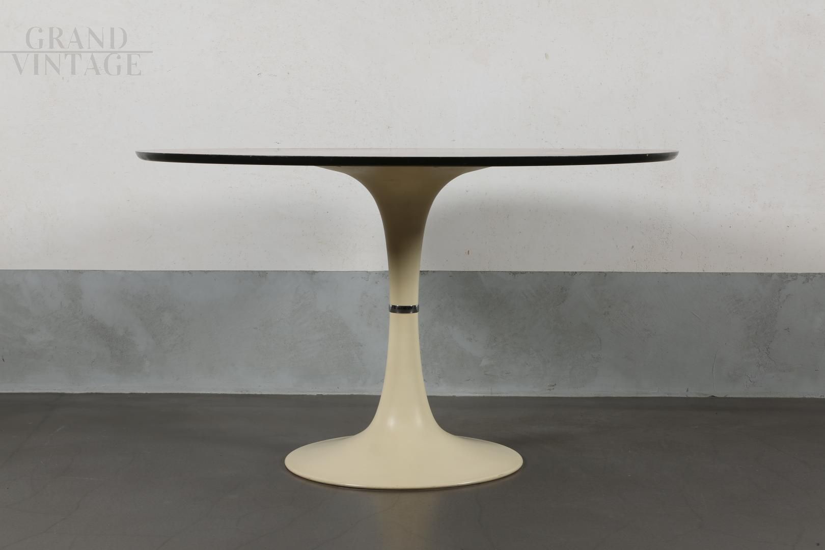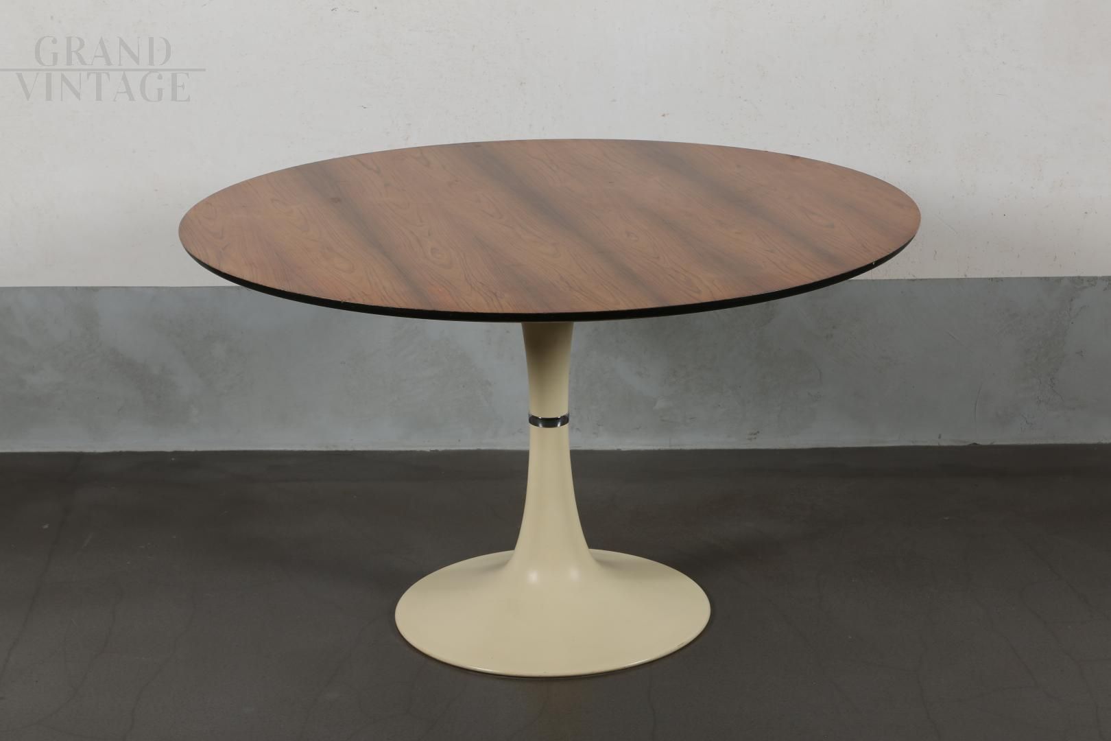 Tavolo rotondo con piede a tulipano prodotto dalla Grosfillex France nel 1971, con piano in legno di palissandro chiaro. Presenta dei piccoli difetti sul bordo e sul piano, come evidenziato nelle foto.