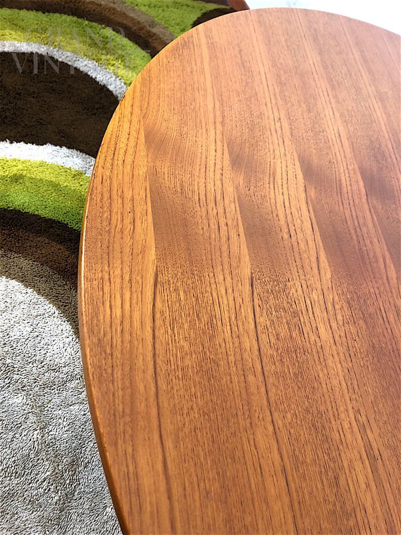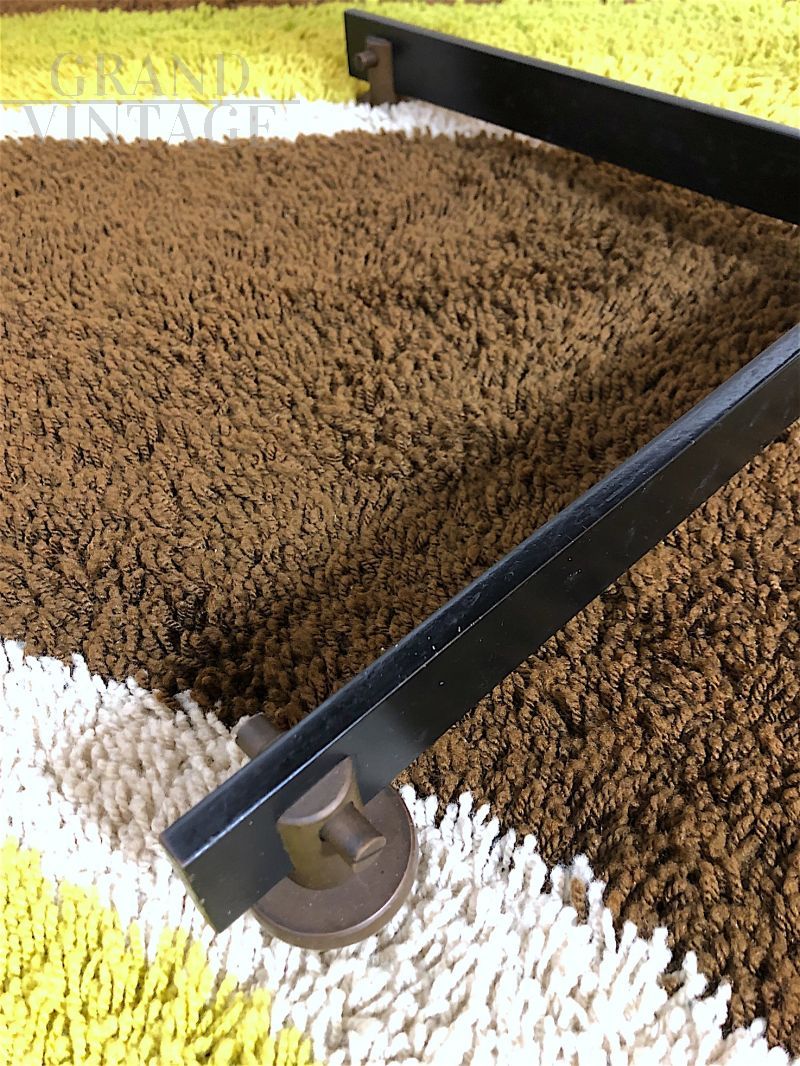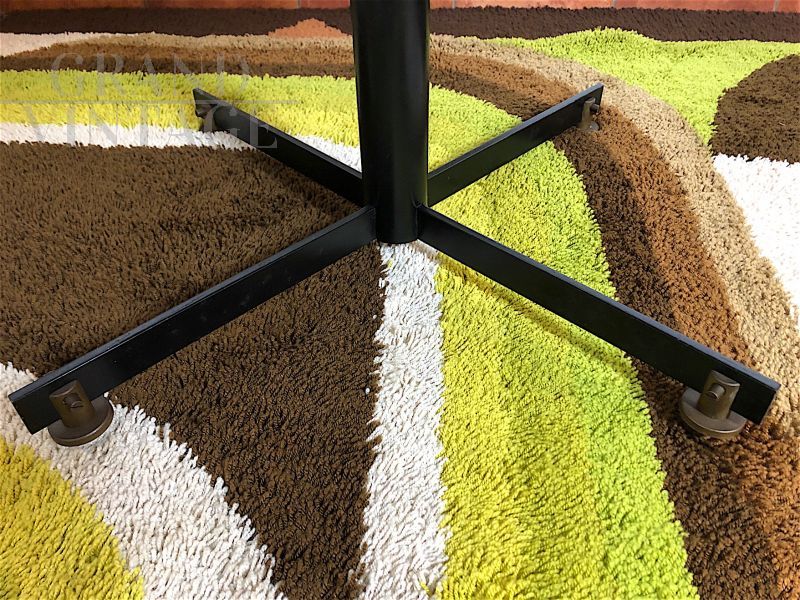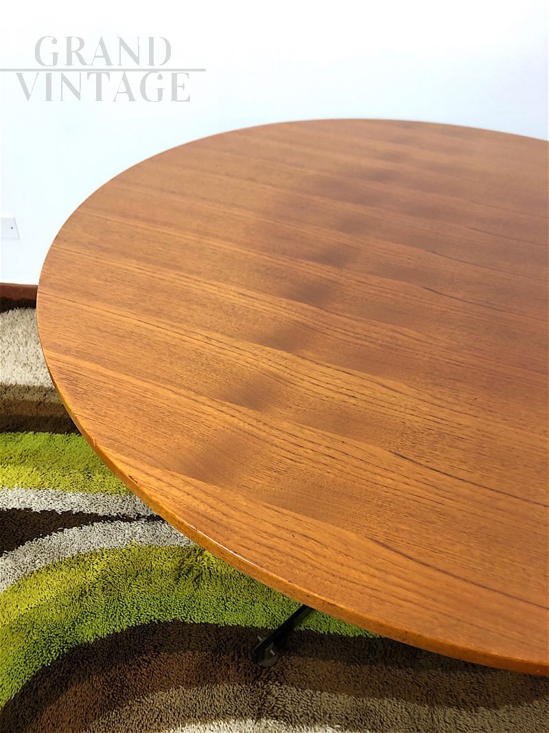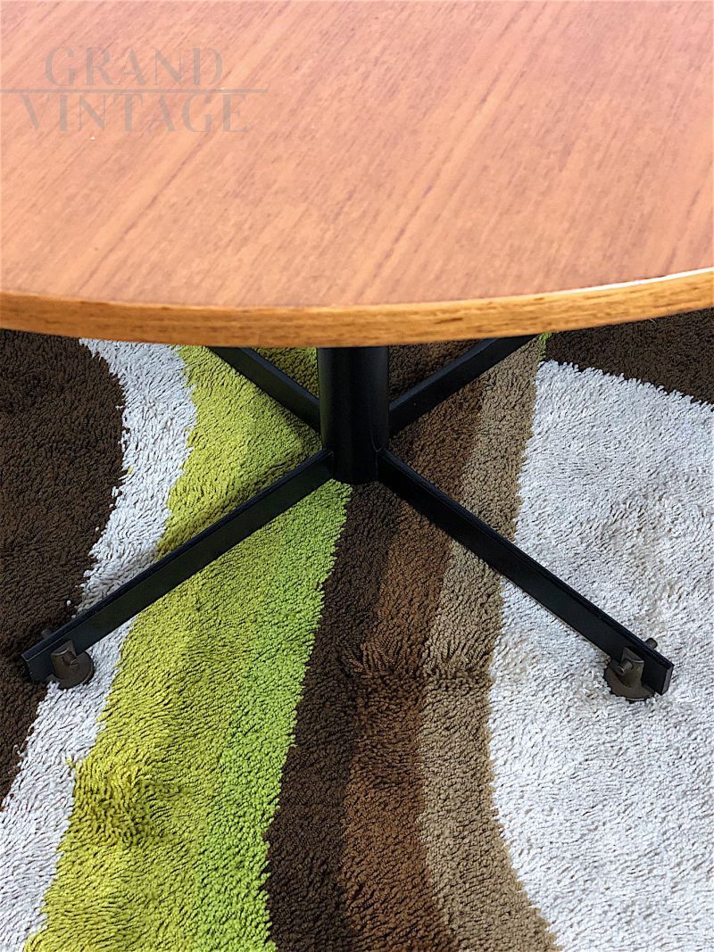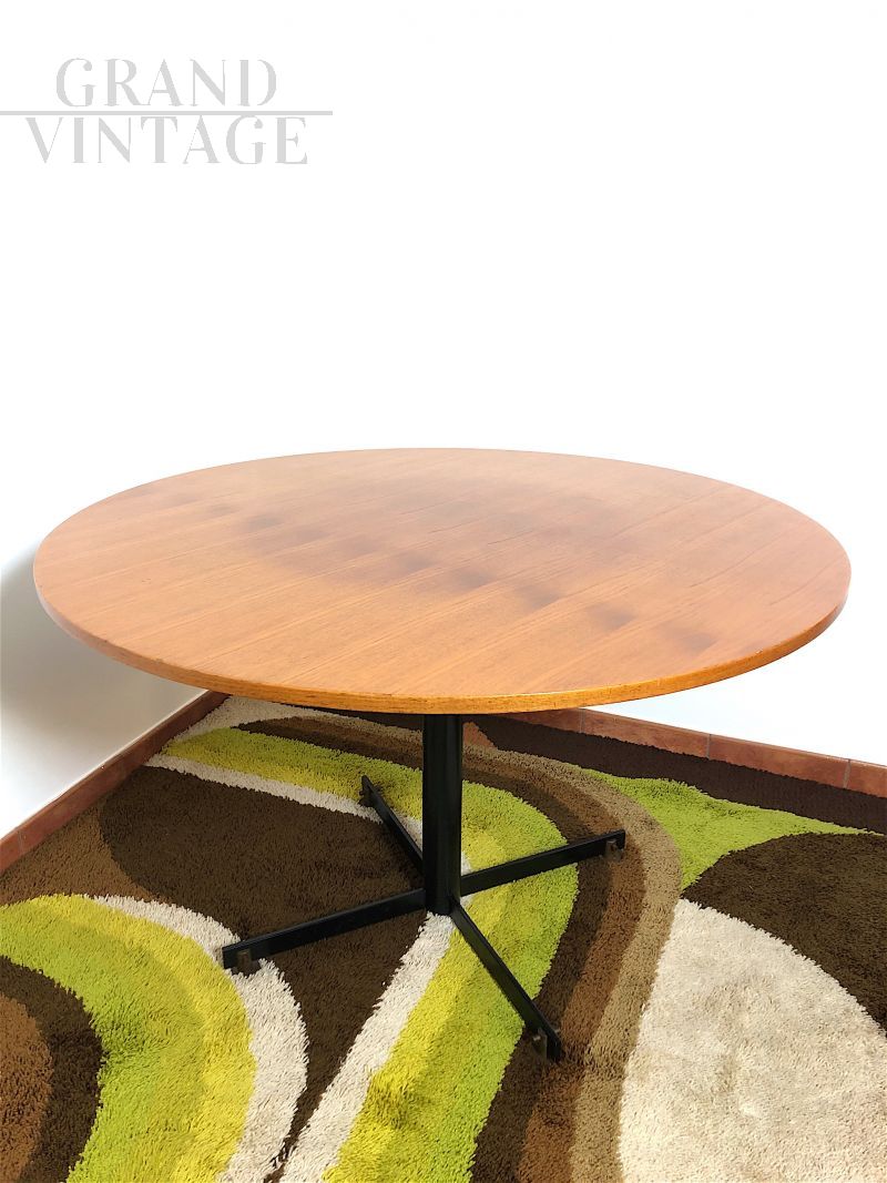 Tavolo vintage anni 60 Made in Italy, un pezzo iconico del design di qualità, caratterizzato da linee essenziali e materiali selezionati. Il piano è circolare e realizzato in legno con una splendida impiallacciatura in teak, che dona eleganza e calore all'ambiente. La struttura in metallo nero conferisce al tavolo un look moderno e minimalista, mentre la base a quattro razze garantisce stabilità e leggerezza. Un elemento distintivo di questo tavolo sono i piedi in ottone, impreziositi da un motivo decorativo unico che aggiunge un tocco di sofisticata eleganza. In condizioni perfette!