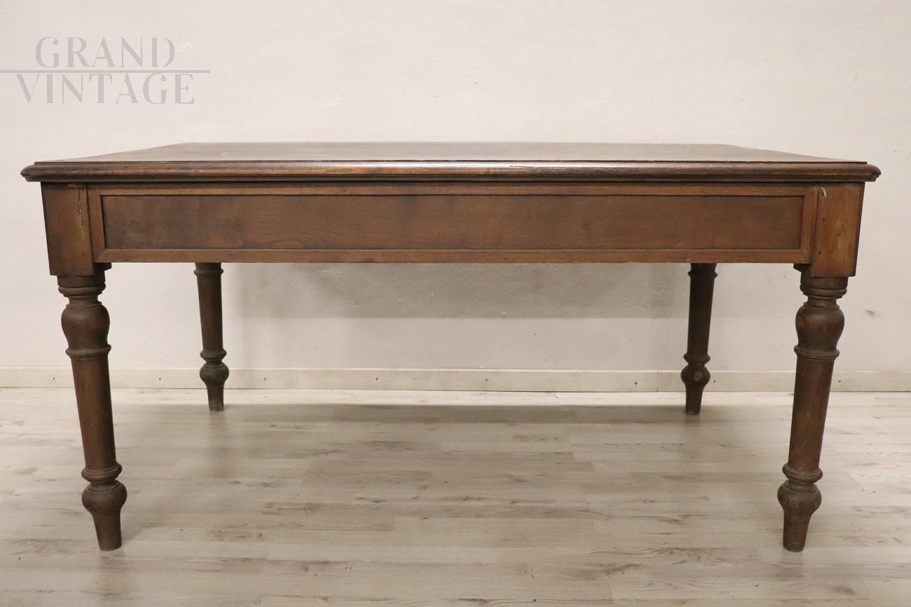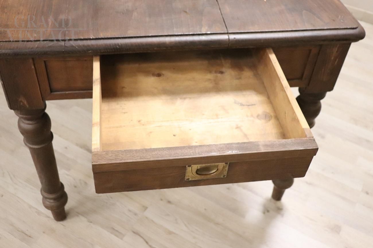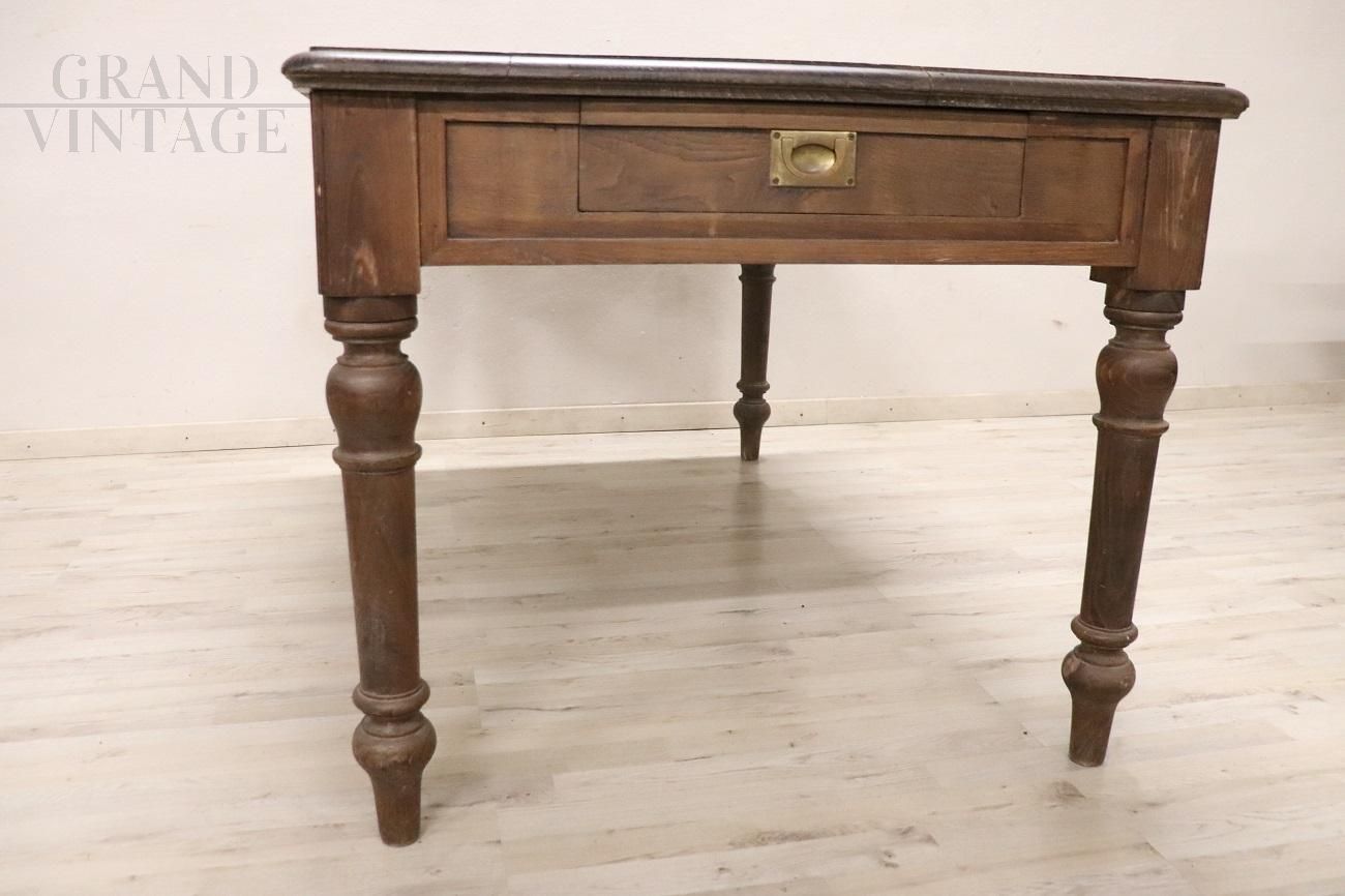 Tavolo rustico italiano, realizzato all'inizio del XX secolo in rovere massello. Semplice e lineare presenta due comodi cassetti sui lati corti, che aggiungono praticità al suo fascino estetico. Lo spazioso piano del tavolo offre ampio spazio per varie attività, rendendolo un'ottima scelta per un accogliente tavolo da cucina. Le robuste gambe tornite del tavolo rimandano all'artigianato del XIX secolo, conferendo un tocco classico al suo aspetto rustico. Si prega di notare che sul piano sono presenti alcune macchie più scure che sono penetrate nel legno e che non possono essere rimosse completamente. Tuttavia, con un accurato restauro, questi segni possono essere valorizzati per aumentare il fascino rustico del tavolo, anziché sminuirlo. Prezzo trattabile.