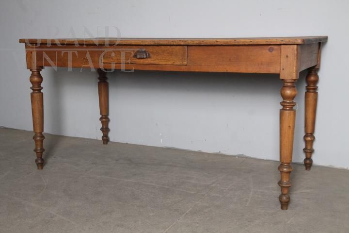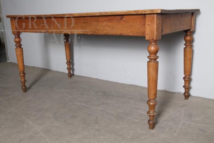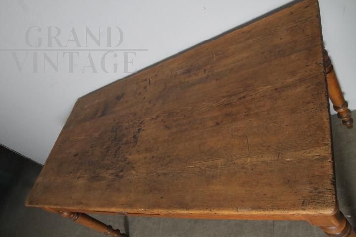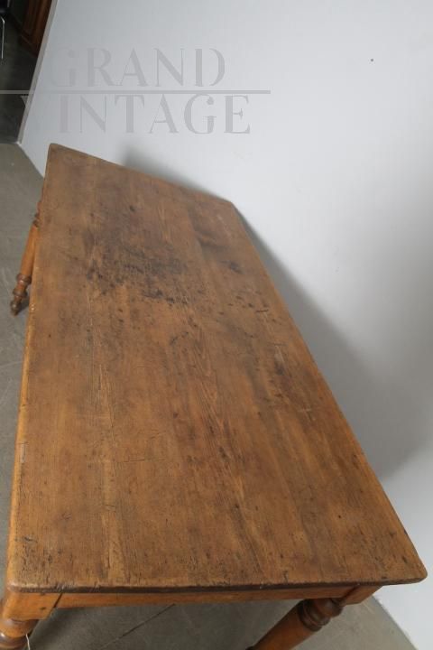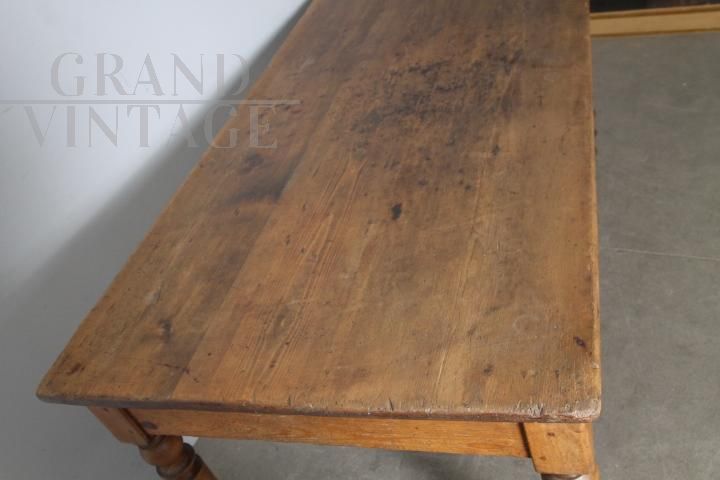 Antico tavolo rustico provenzale da osteria in legno massello di pino, di fine '800, con gambe tornite e cassetto centrale. Molto bello, restaurato al naturale con finitura di sola cera d'api.