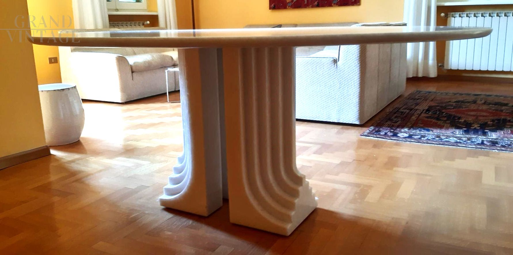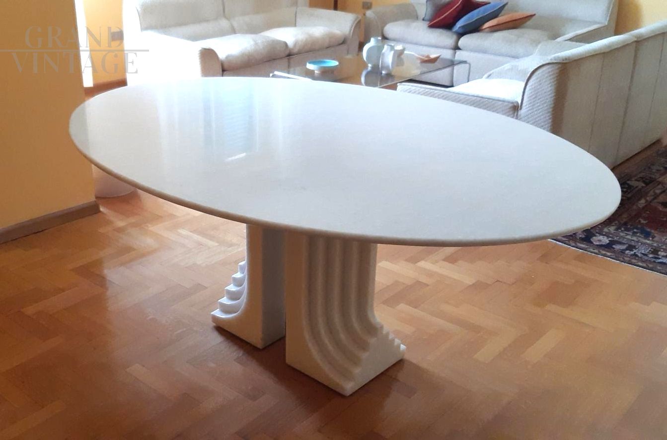 Poggia su due pilastri a strati, in un unico blocco. Raro esemplare ormai fuori produzione, il piano ovale dI grande spessore non presenta venature nere in quanto è stato uno degli ultimi esemplari realizzati con marmo di NAXOS poi andato esaurito per sempre.
