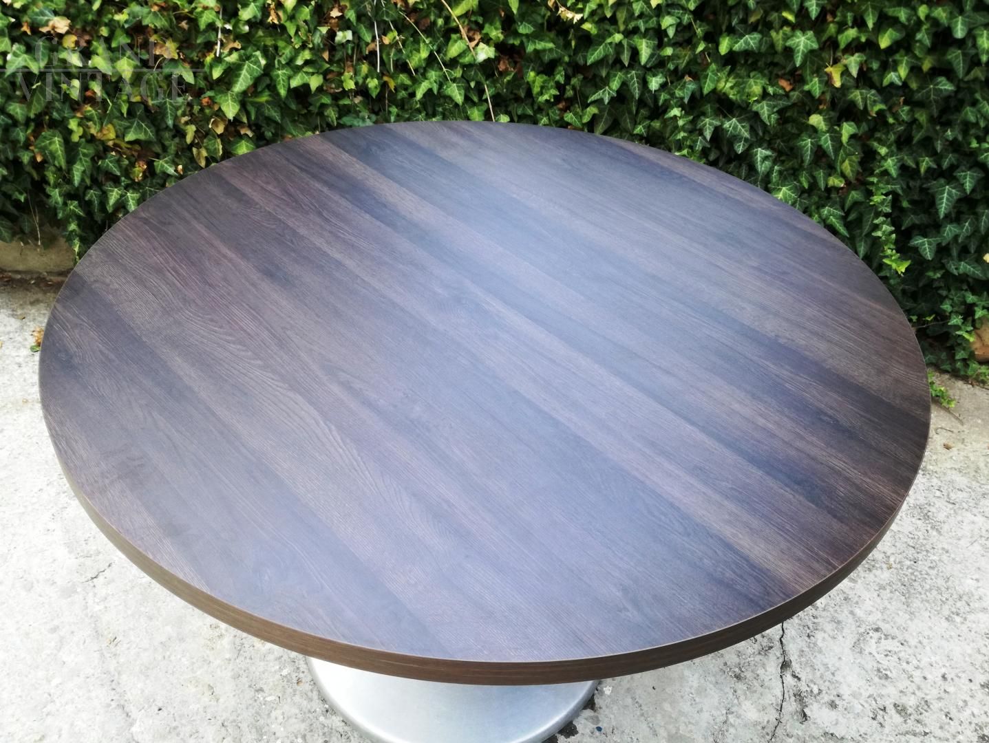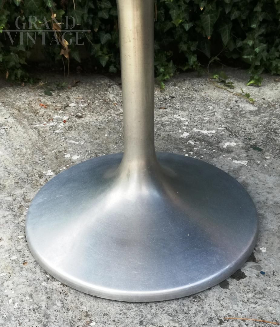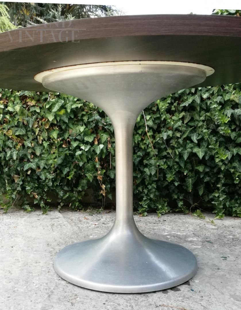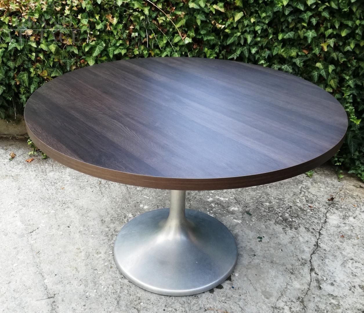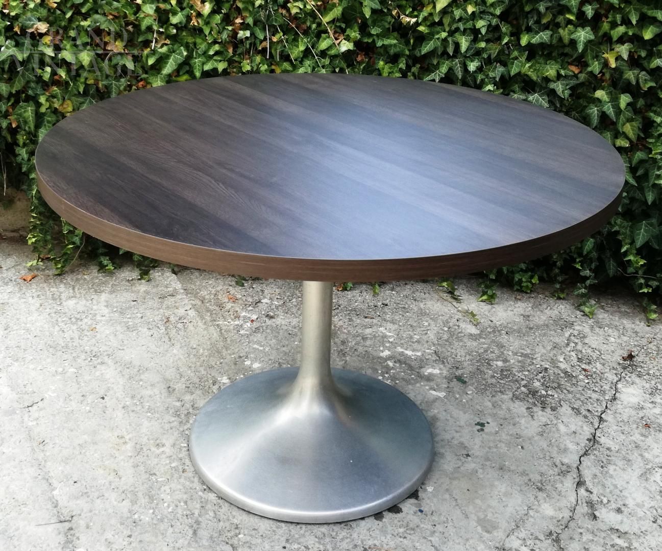 Tavolo da pranzo vintage stile Tulip con base in acciaio satinato e piano in legno wengé con diametro 120 cm e spessore di 4 cm. La base è usata e presenta normali segni d'uso, il top è usato ma di produzione più recente. Il tavolo è stabile e robusto.