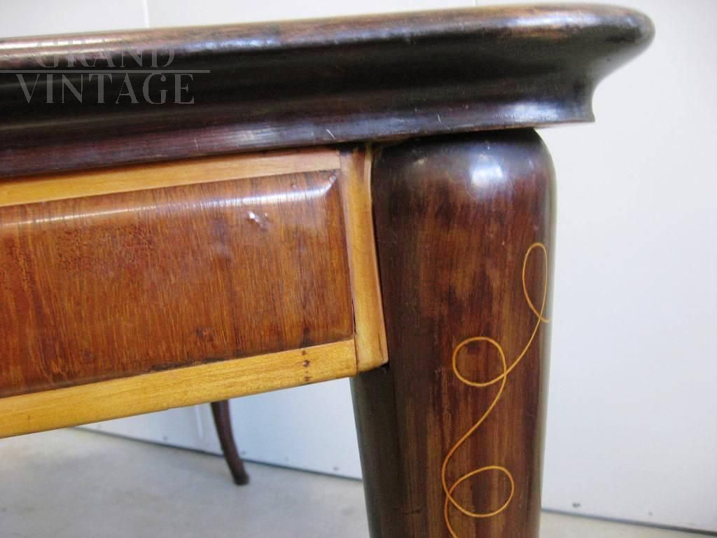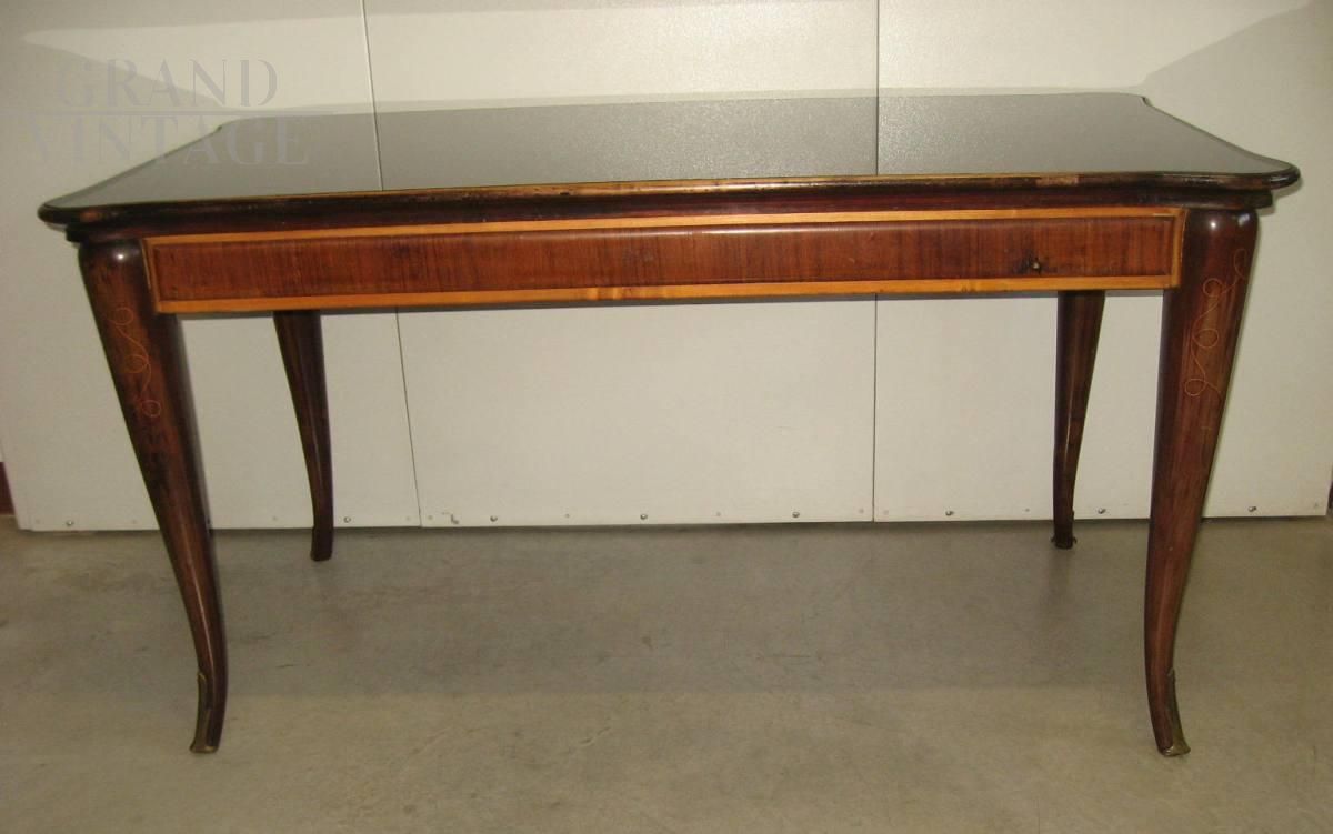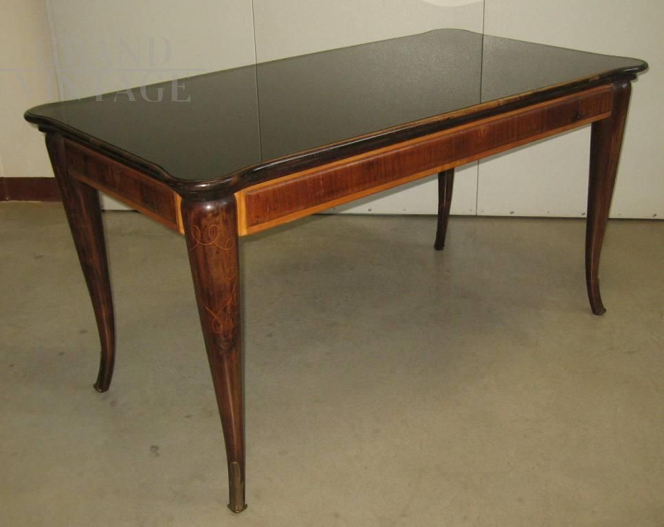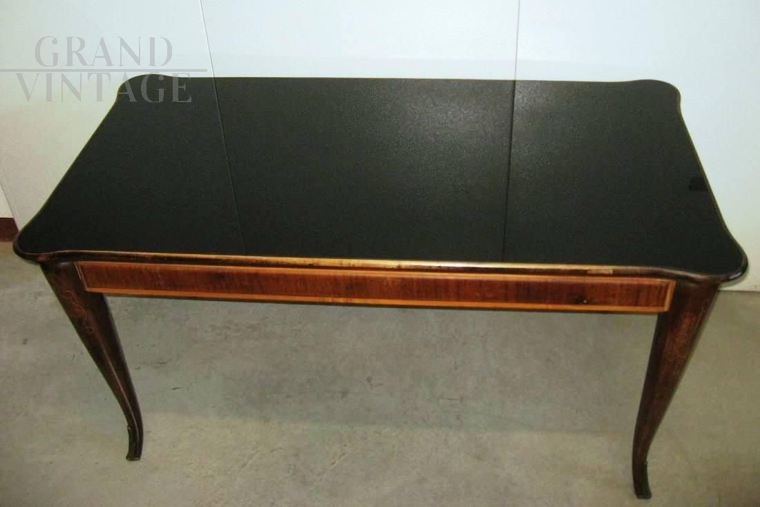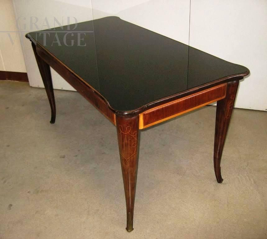 Tavolo vintage anni '60 con piano in vetro nero e decorazioni filettate