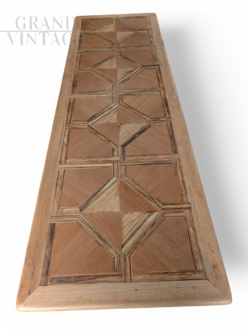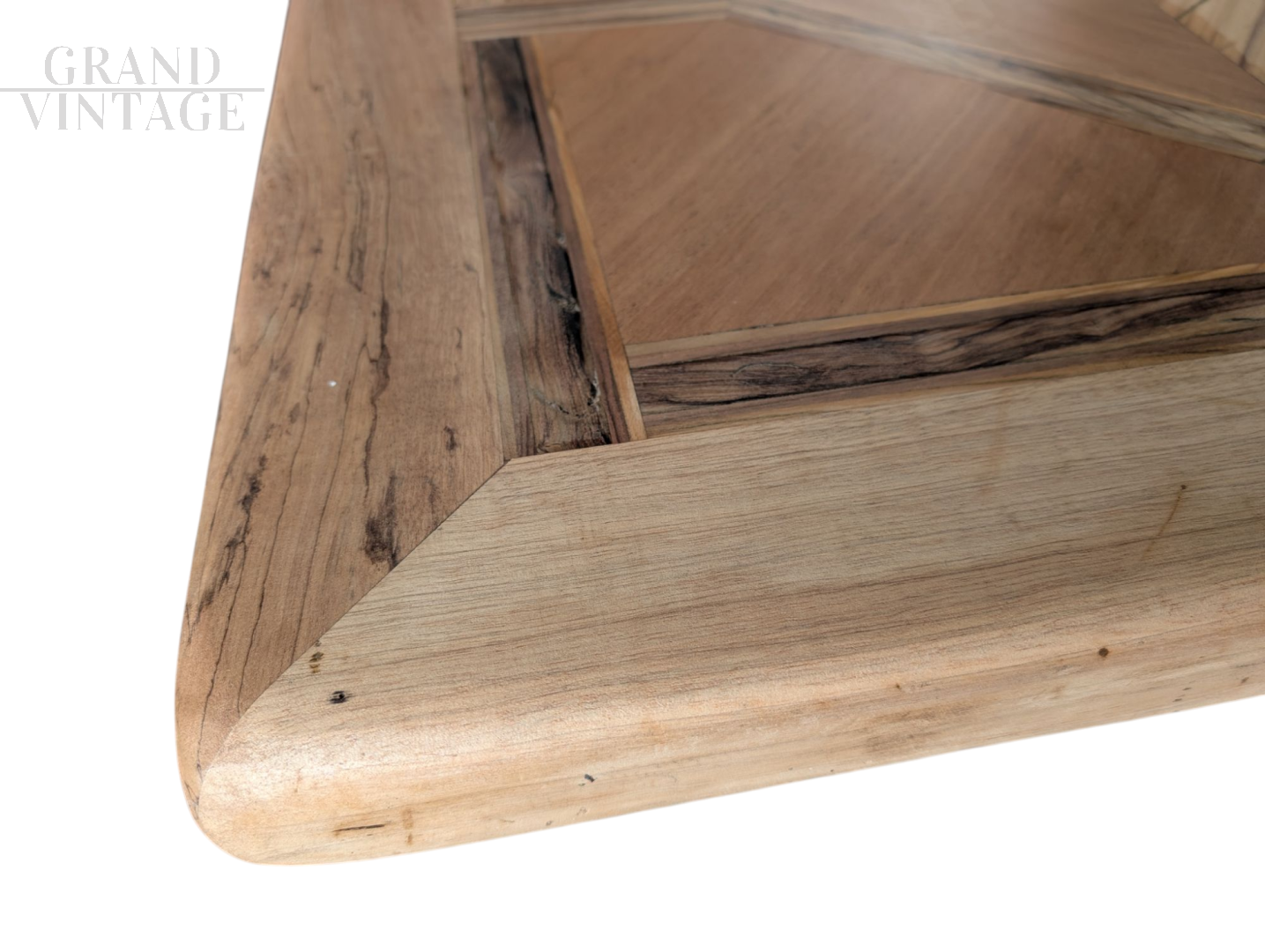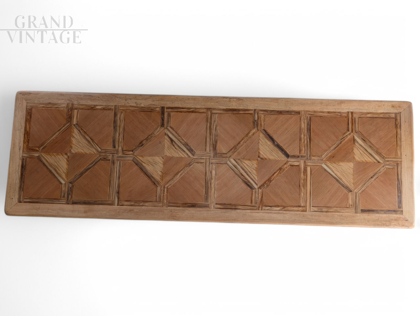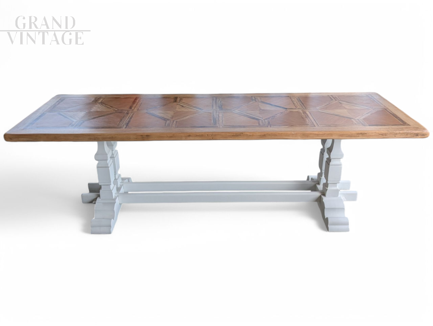 Splendido grande tavolo da pranzo fratino rustico artigianale in legno massello con intarsi in legno sul piano e con gambe intagliate laccate bianche. In condizioni perfette, perfetto per ambienti spaziosi interni o esterni.