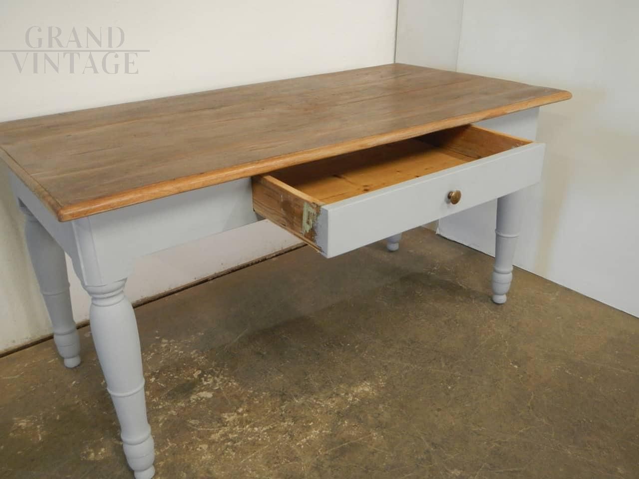 Tavolo vintage anni '50 in legno di castagno con struttura laccata grigia e piano in legno naturale, gambe tornite e cassetto con larghezza 67 cm e altezza 9 cm. Spazio per la seduta cm 64. In buone condizioni.