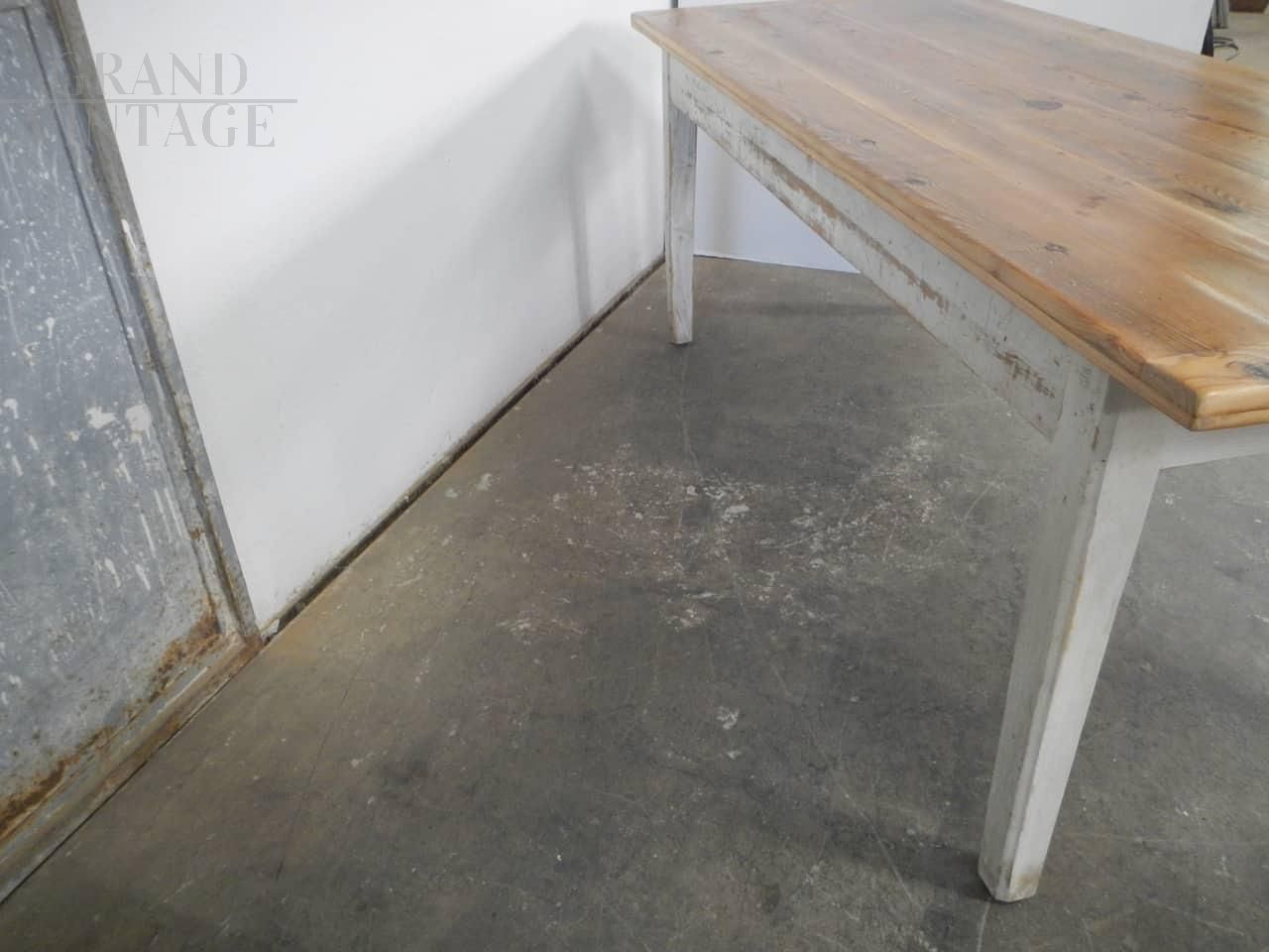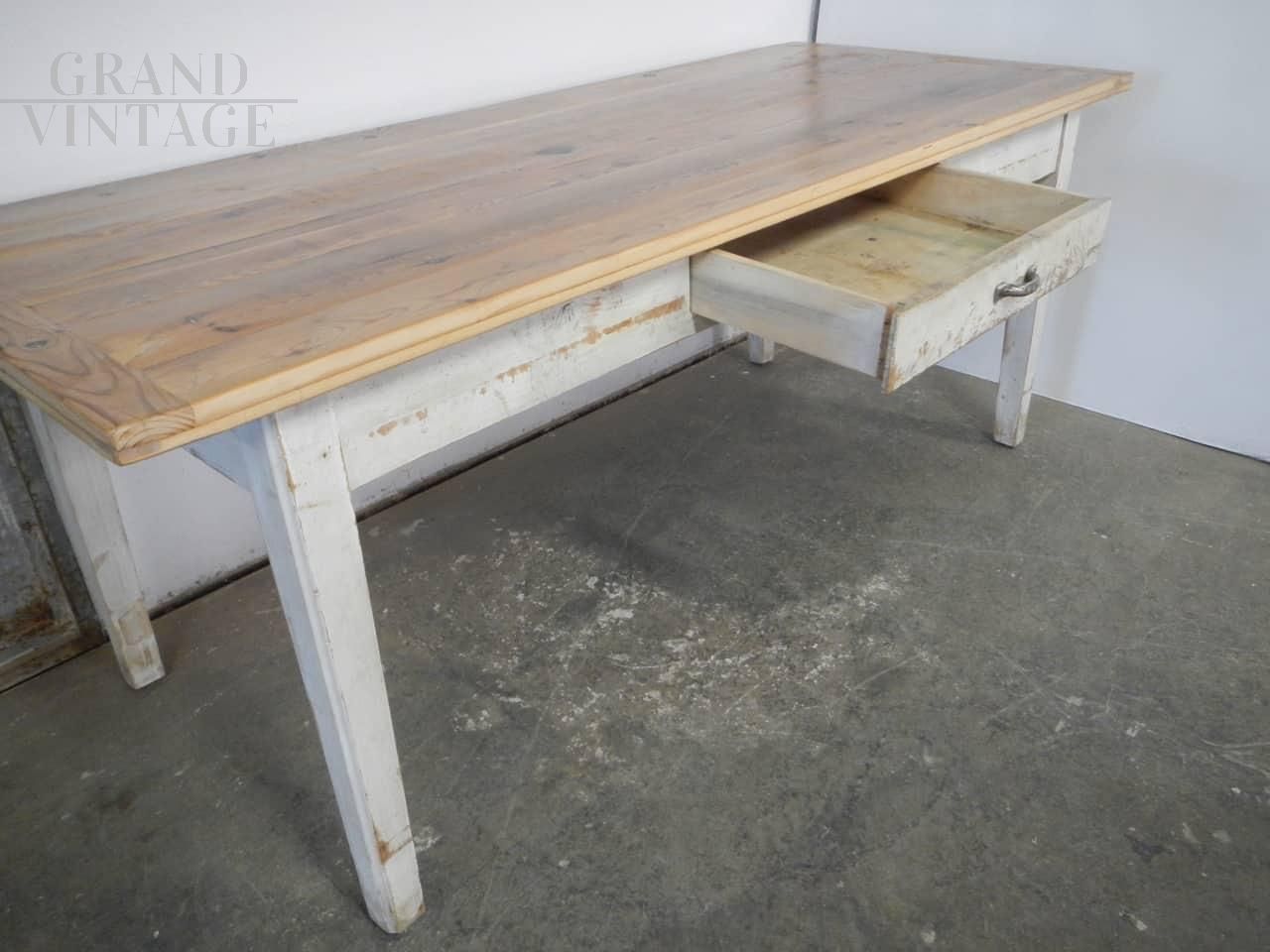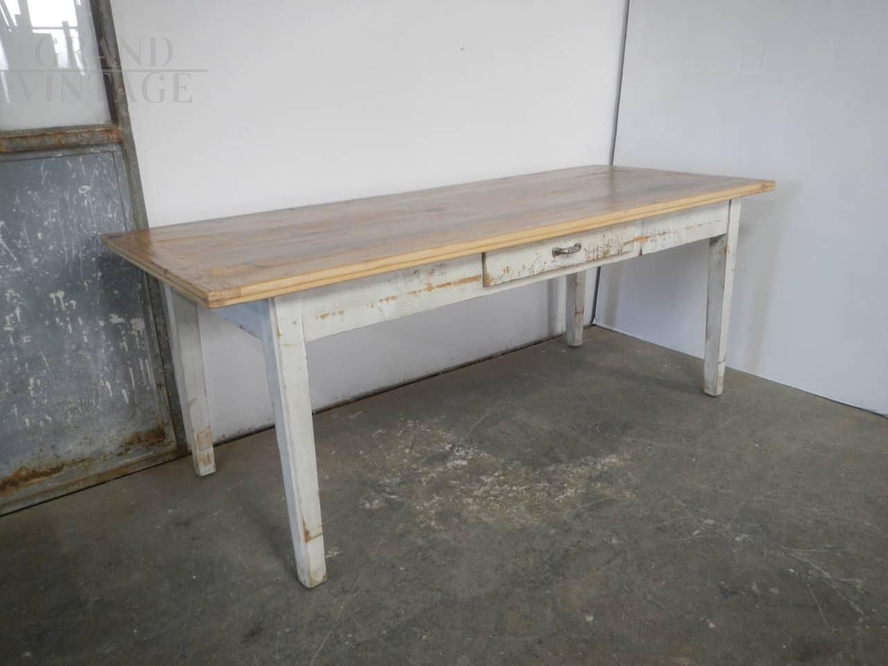 Tavolo da cucina vintage in abete verniciato bianco con piano in larice naturale, completo di cassetto. Restaurato e in buone condizioni. Altezza per la seduta: 65 cm.