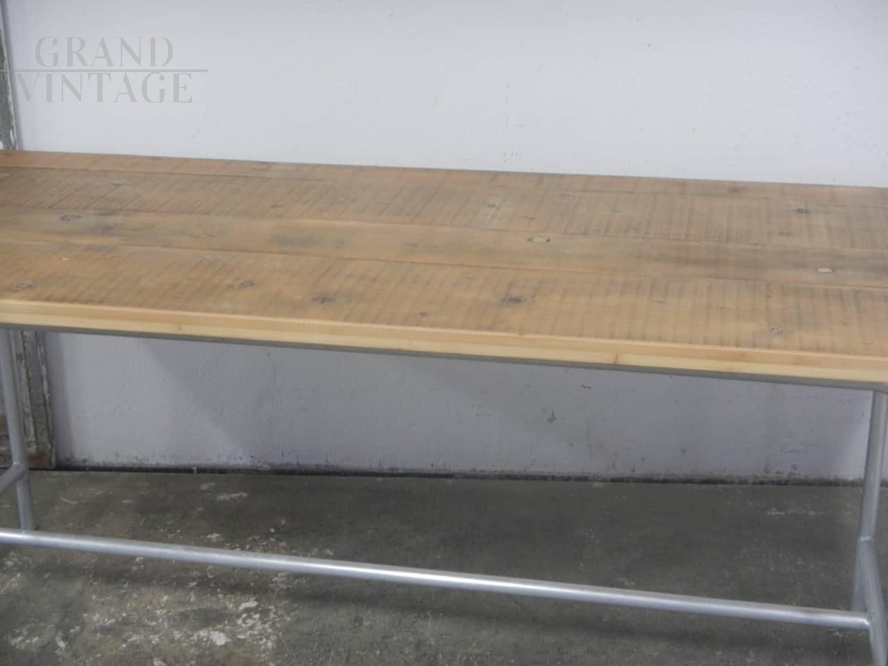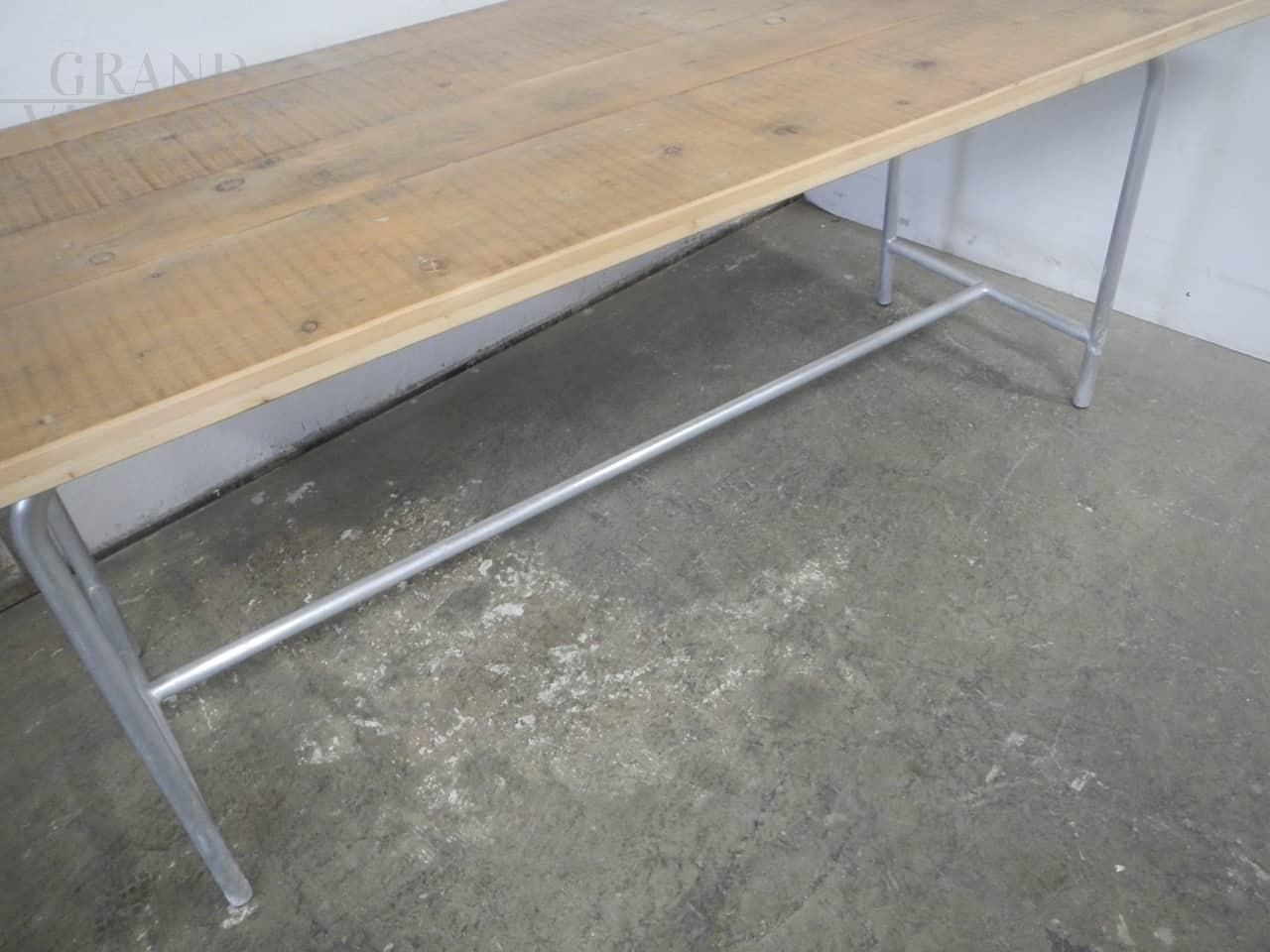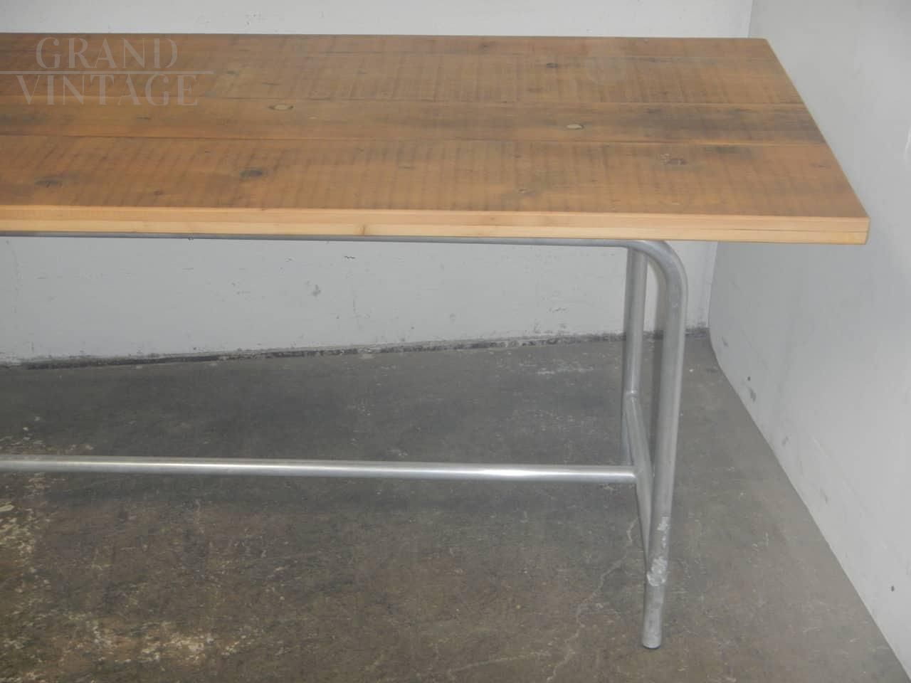 Tavolo vintage in stile industriale con base in tubolare di alluminio e piano in abete, completamente restaurato.