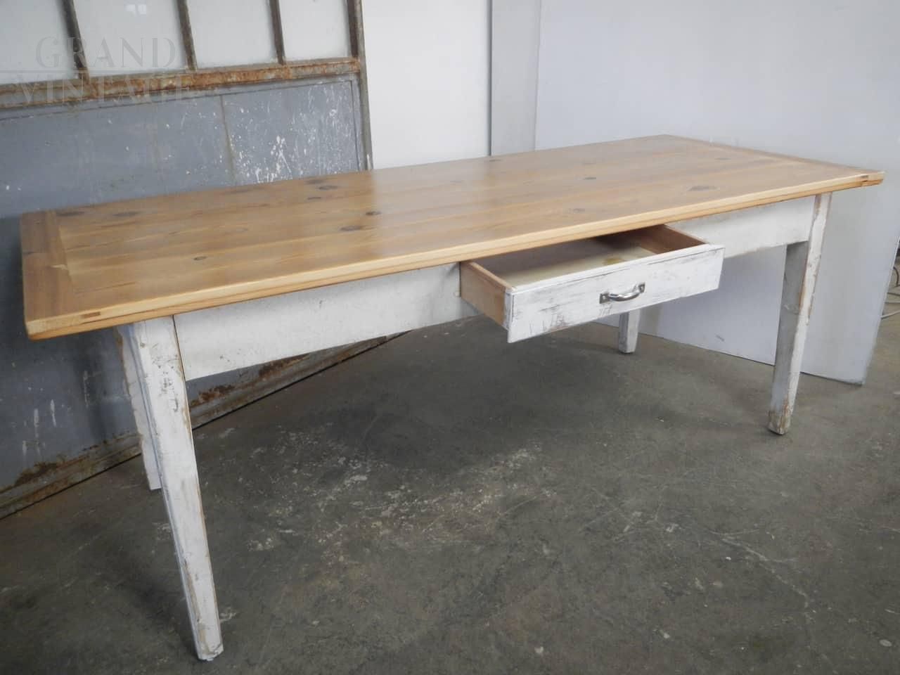 Tavolo da cucina vintage in abete verniciato bianco con piano in larice naturale, completo di cassetto. Restaurato e in buone condizioni. Altezza per la seduta: 65 cm.